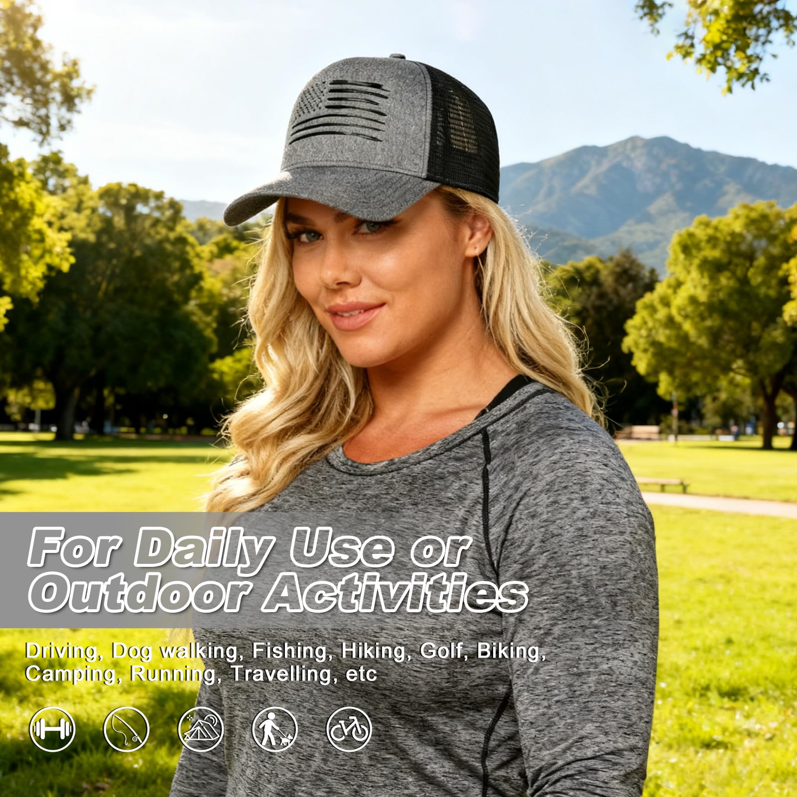 3.Breathable & Durable Construction – Made with 100% cotton twill front panels and rugged polyester mesh back panels, this American flag hat offers superior breathability and long-lasting durability. The mesh sides and back maximize airflow, keeping your head cool and dry during outdoor activities like hiking, camping, or sports.