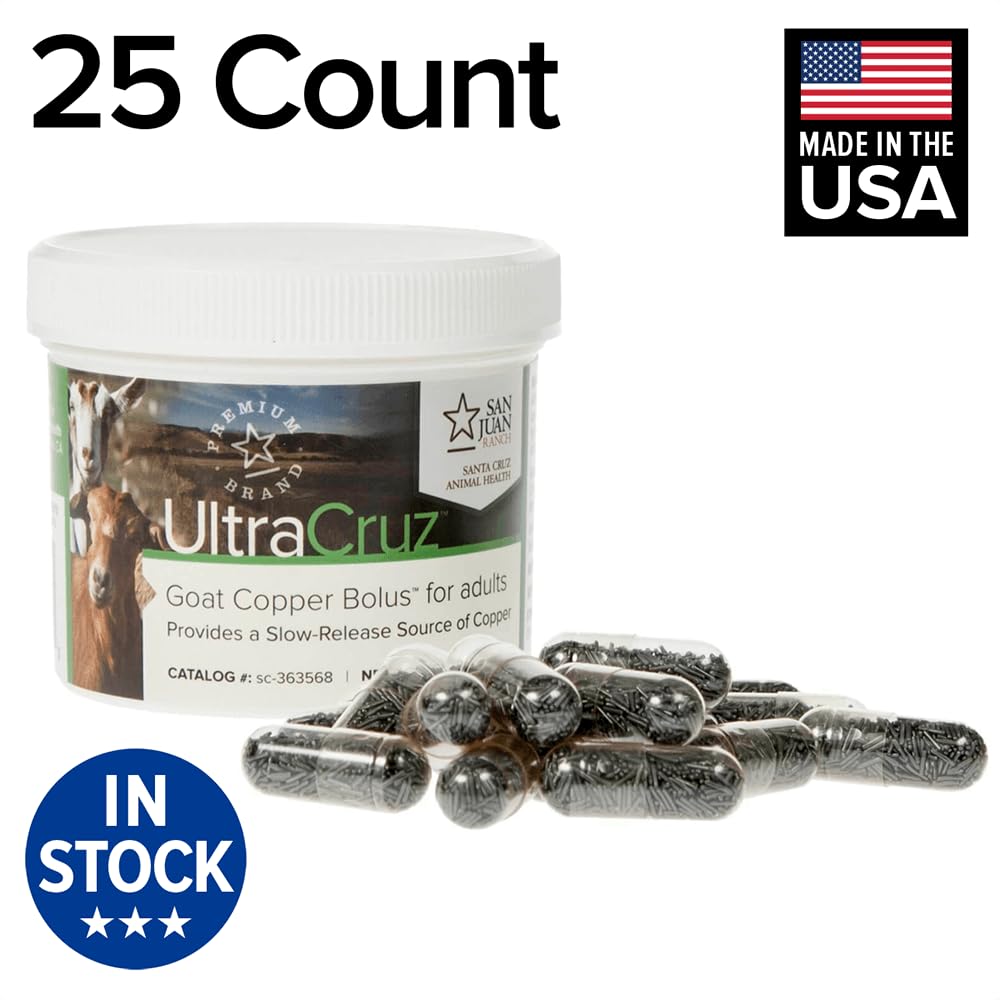 UltraCruz Goat Copper Bolus is an excellent source of slow-release Copper, designed to provide all goats with this essential trace mineral in order to support healthy hair and proper growth, as well as aid in the prevention of Copper deficiency. UltraCruz Goat Copper Bolus are high quality copper boluses help provide slow releasing copper for goats in deficient areas. This product is intended for use in goats only. Do not administer to sheep. Goats up to 3 months of age and weighing up to 50 lbs should receive UltraCruz Goat Copper Bolus for kids. Goats over 3 months of age and weighing over 50 lbs should receive UltraCruz Goat Copper Bolus for adults. To provide cattle with a supplemental source of Copper, administer UltraCruz Cattle Copper Bolus.