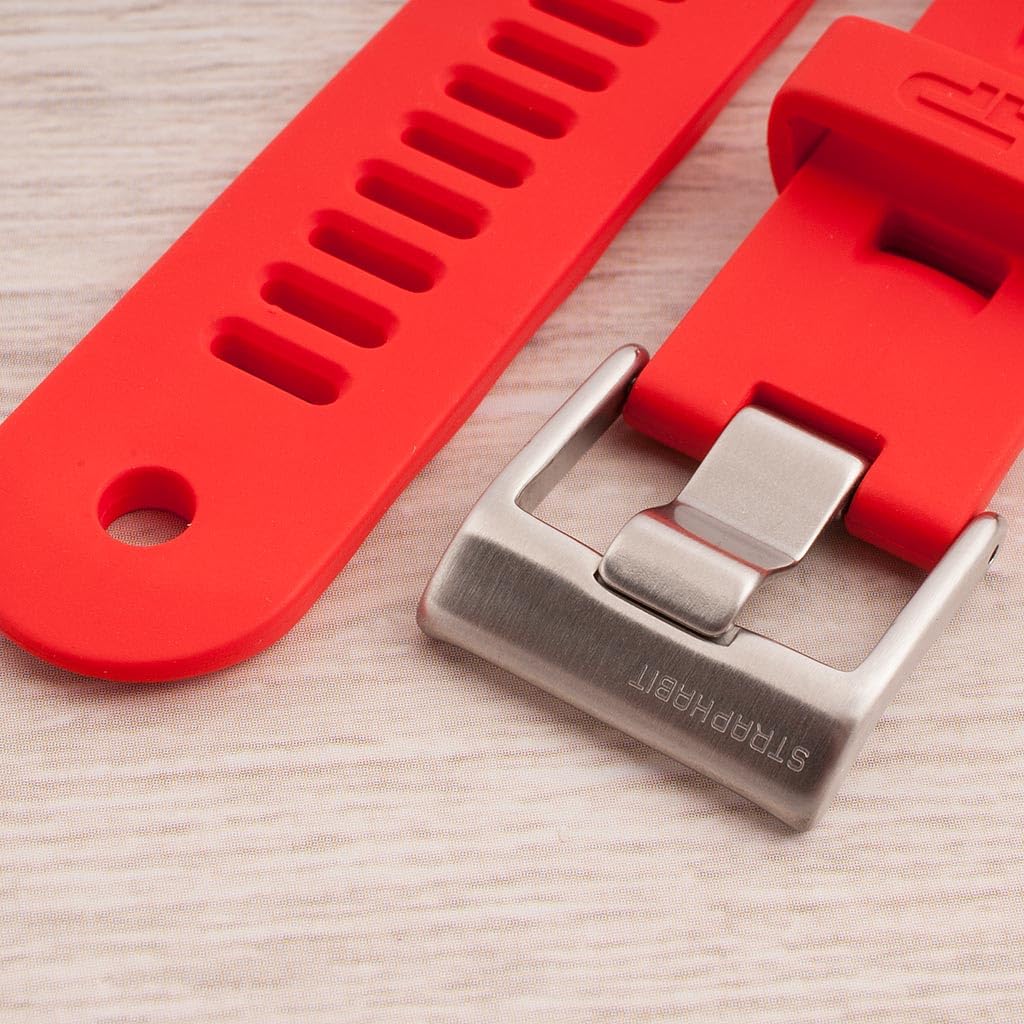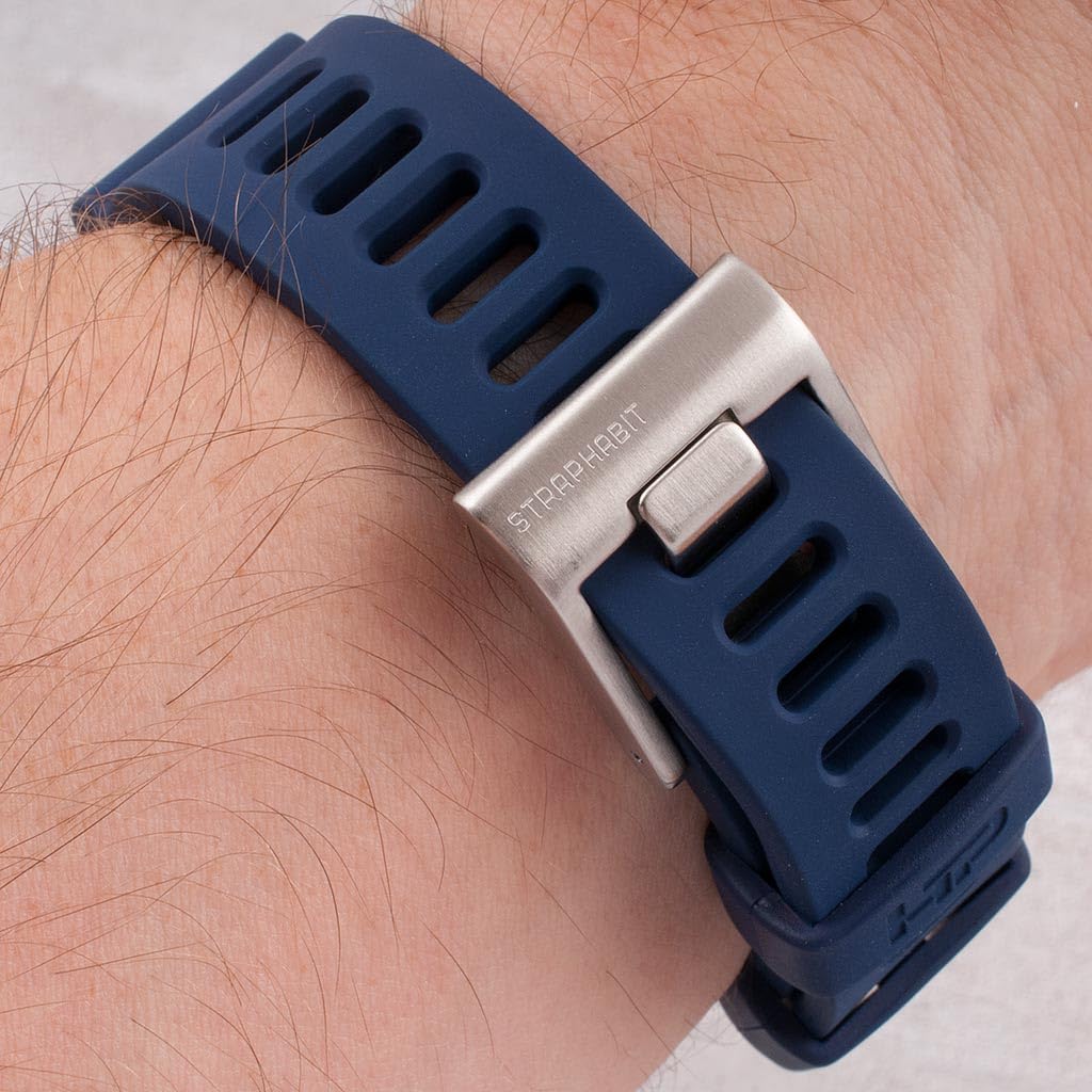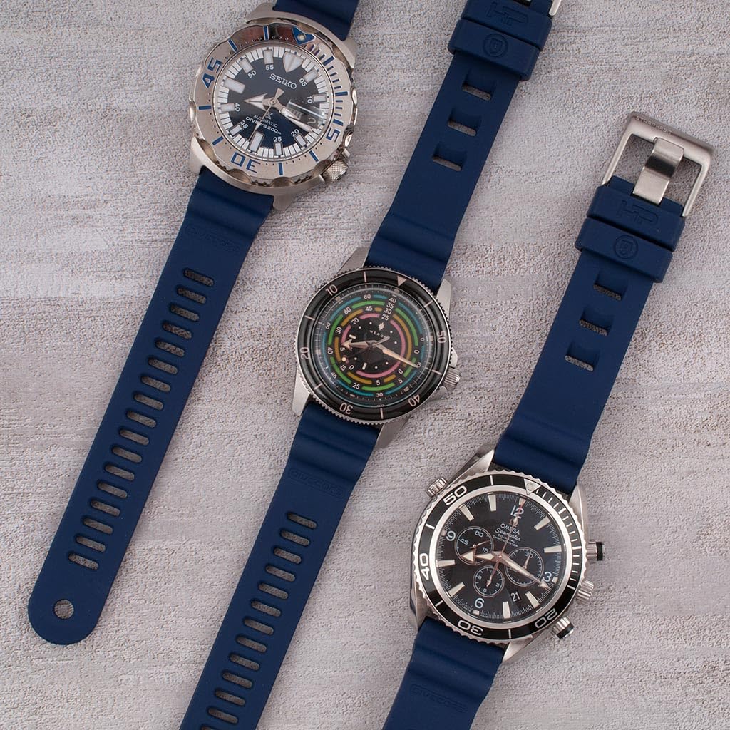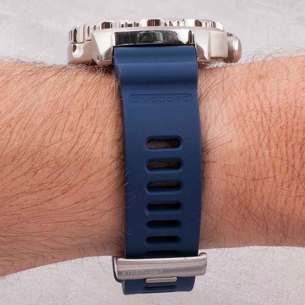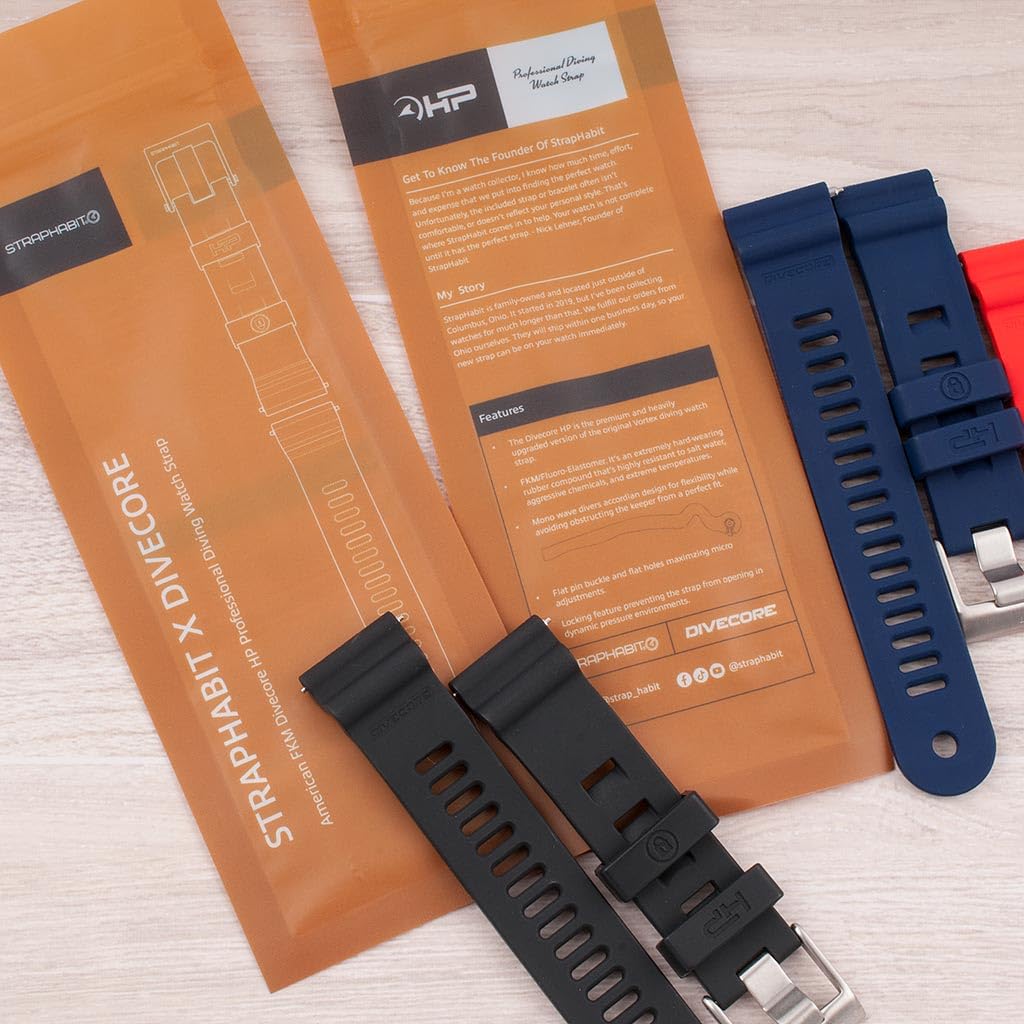 Description StrapHabit has teamed up with Divecore to bring you your favorite professional dive strap to StrapHabit's loyal customers! These use Divecore's upgraded HP design with a StrapHabit branded buckle and packaging. These straps are 80/127mm long, 4mm thick, and have with a 2mm taper from springbar to buckle. It features curved edges, added vented holes, and refinement of the signature Mono-accordion design for flexibility. Includes Divecore proprietary 2.5mm thick quick-release spring-bars with a standard size tip that will fit most watches. Seiko/Citizen fat spring bars can also be used with these straps (not included). Divecore's signature mono-accordion design for flexibility while avoiding obstructing the keeper from a perfect fit. Flat pin buckle and flat holes maximizing micro adjustments. Locking feature preventing the strap from opening in dynamic pressure environments. Stainless steel hardware. These use Divecore's upgraded American FKM rubber formula. The scientific name of FKM is Fluoro-Elastomer. It is an extremely hard-wearing rubber compound highly resistant to salt water, aggressive chemicals, and extreme temperatures (as low as -45C and high as +300C). It is the perfect choice for a high-end rubber watch strap designed to be fitted to the toughest watches and tackle the harshest environments.