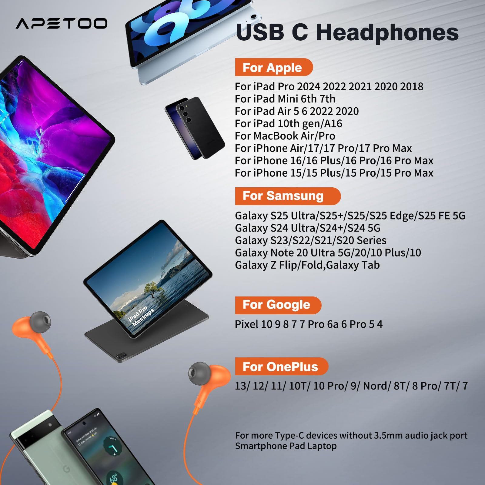 Wide Fit: APETOO Type C headphones work with iPhone 17 15 16 Pro Max Plus, for iPad Pro M4/Air M2, for Samsung S26 S25 S24 Ultra S24+ S24, S23 FE S23 Ultra S23+, S22 Ultra S22+, S21 Ultra S21 Plus S21 FE, S20 FE S20+ S20 Ultra, Note 20 Ultra/10 Plus, Galaxy Tablet A9+/S9/S8, A17 A16 A53 A54 A34, Z Flip/Fold7/6/5/4/3/2; for Google Pixel 10 9 8 7 Pro 6a 6 Pro 6 5 4 3 2 XL; for iPad 10 Pro Air 5 4/Mini 6 7; for OnePlus for Huawei; for Macbook Air Pro and more USB-C devices without 3.5mm audio jack