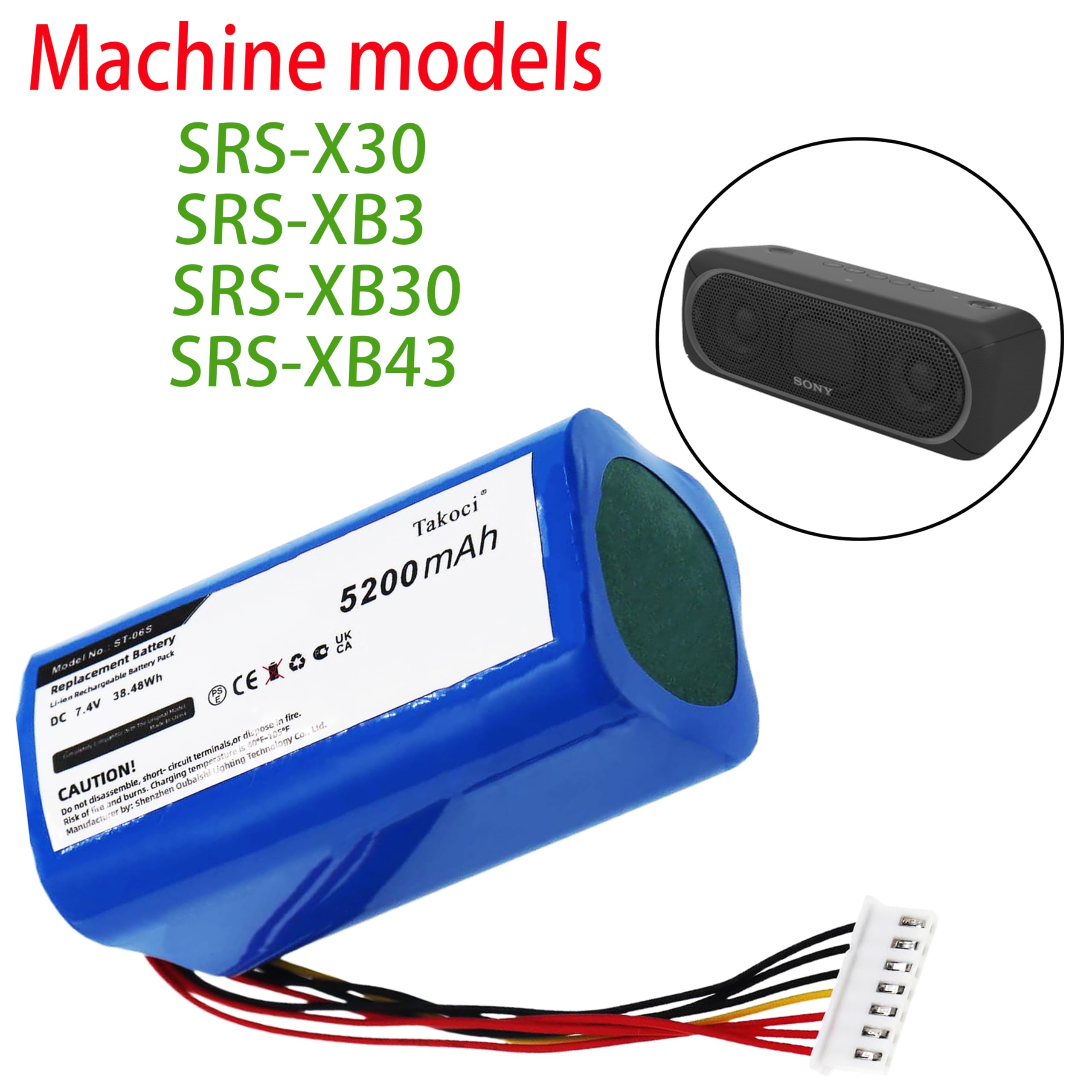 SRS-XB30 Battery Specification : Voltage:7.4V, Capacity:5200mAh/38.48Wh, Size:67.94 x 37.58 x 37.02mm, Weight:260.4g