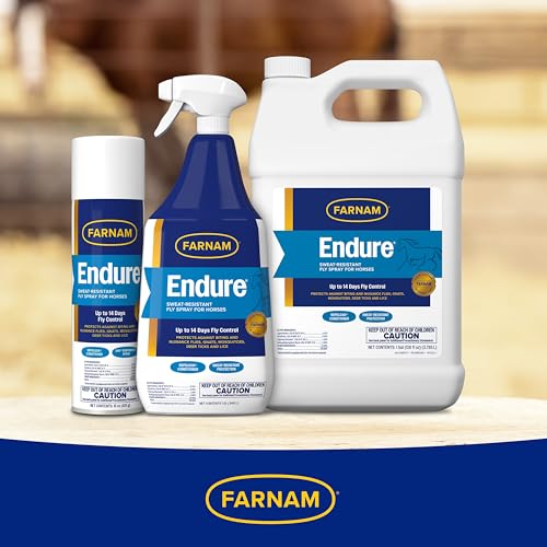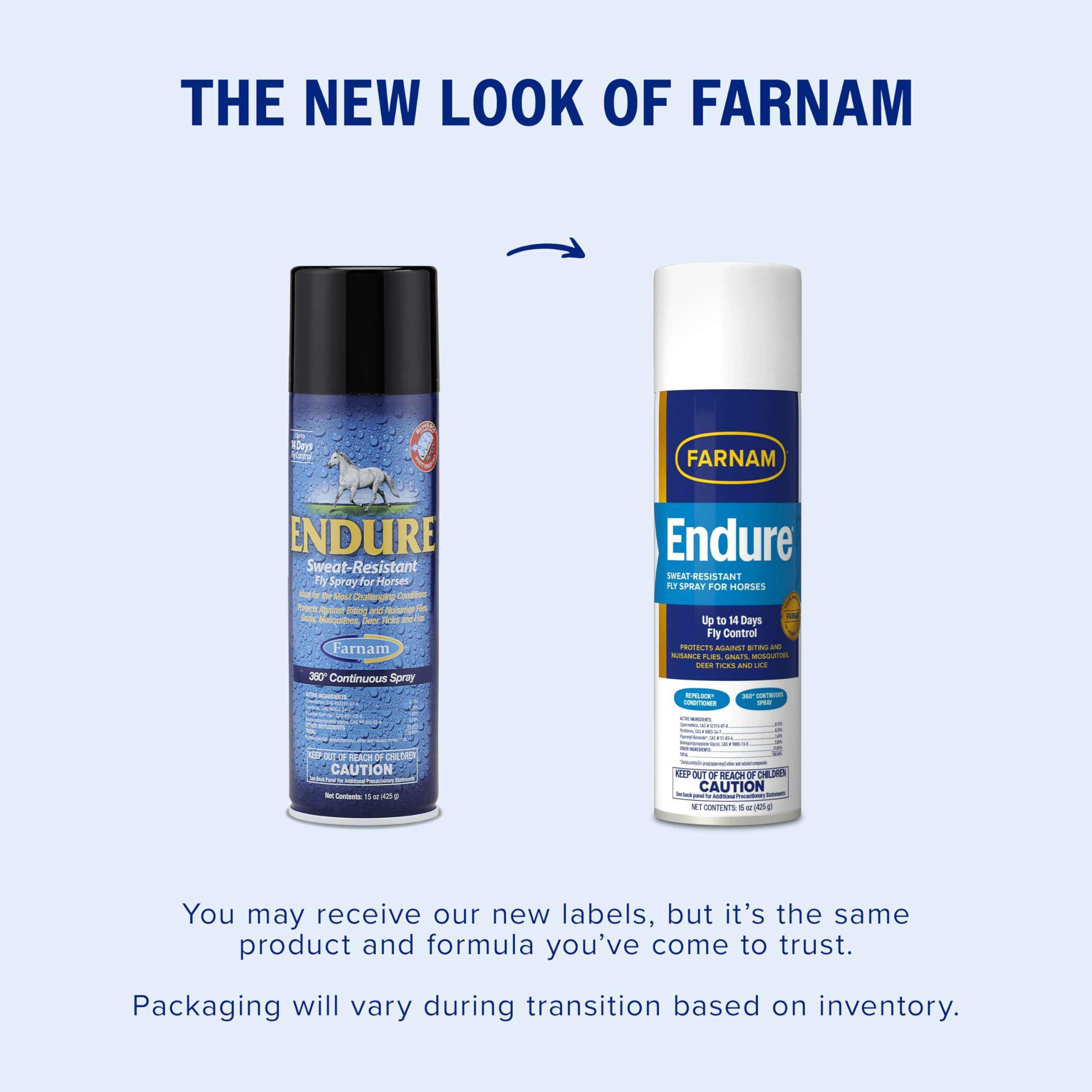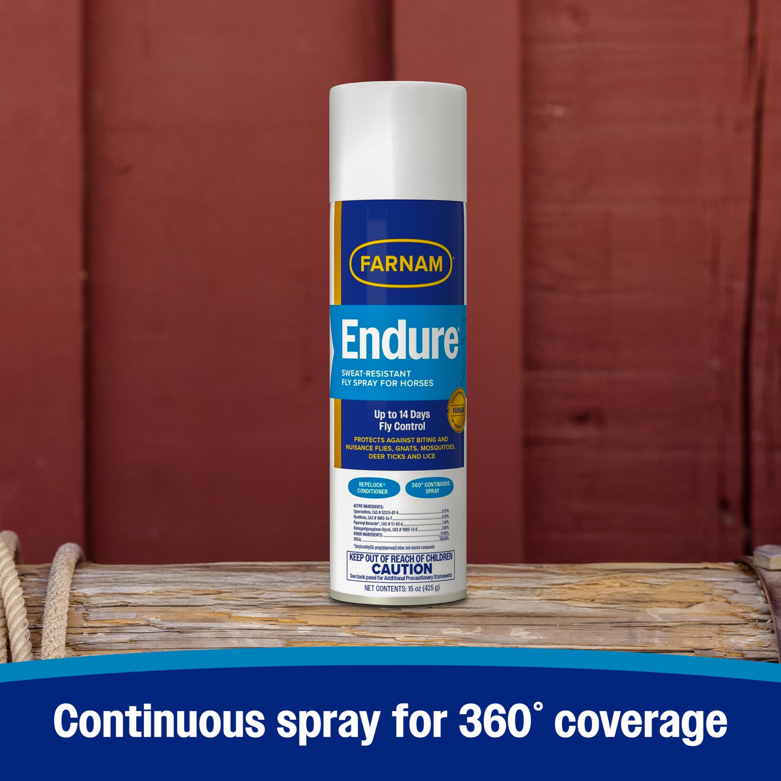 Flies are no match for Endure Sweat-Resistant Fly Spray for Horses! This efficient horse spray was designed with you and your horse in mind and works just as hard as you both do. Flies, gnats and ticks can be irritating to your horse but can also be a danger to their health. Endure Sweat-Resistant Fly Spray for Horses helps to prevent exposure to Lyme Disease. Plus, it features a unique formula that keeps on working – even in hot, muggy, sweaty conditions. It never quits on you or your horse especially when bugs can be at their worst. Endure Sweat-Resistant Fly Spray for Horses is THE ONLY biting fly repellent spray for horses with Repelock conditioner that binds to the hair shaft for long-lasting protection, even when your horse sweats. Available in a 32-ounce ready-to-use trigger spray bottle, an economical 128-ounce gallon refill jug and a 15-ounce non-aerosol 360-degree continuous spray can for complete coverage from every angle even upside down.