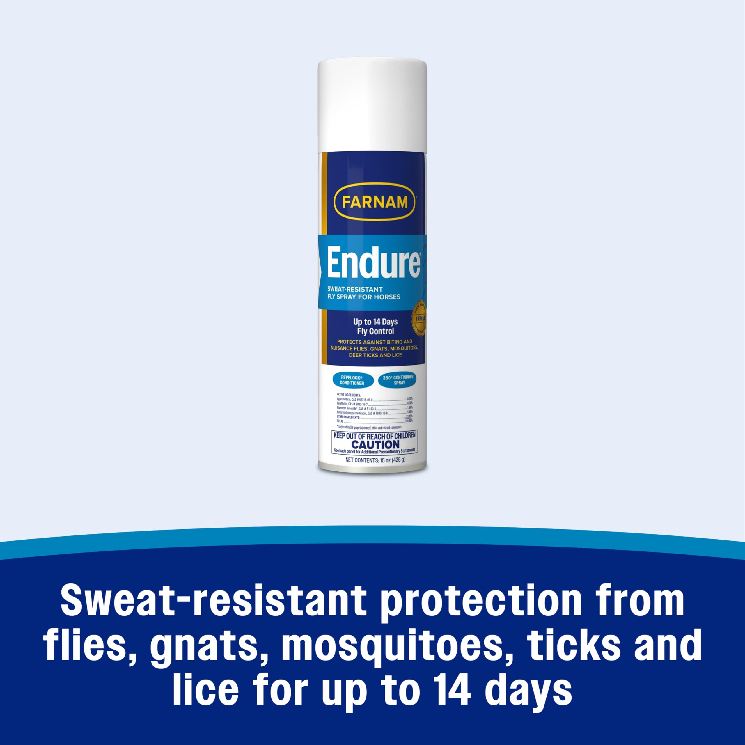 POWERS THROUGH SWEAT and water; endure Sweat-Resistant Fly Spray for Horses is ideal for even the most challenging weather conditions, including heavy rain and muggy heat