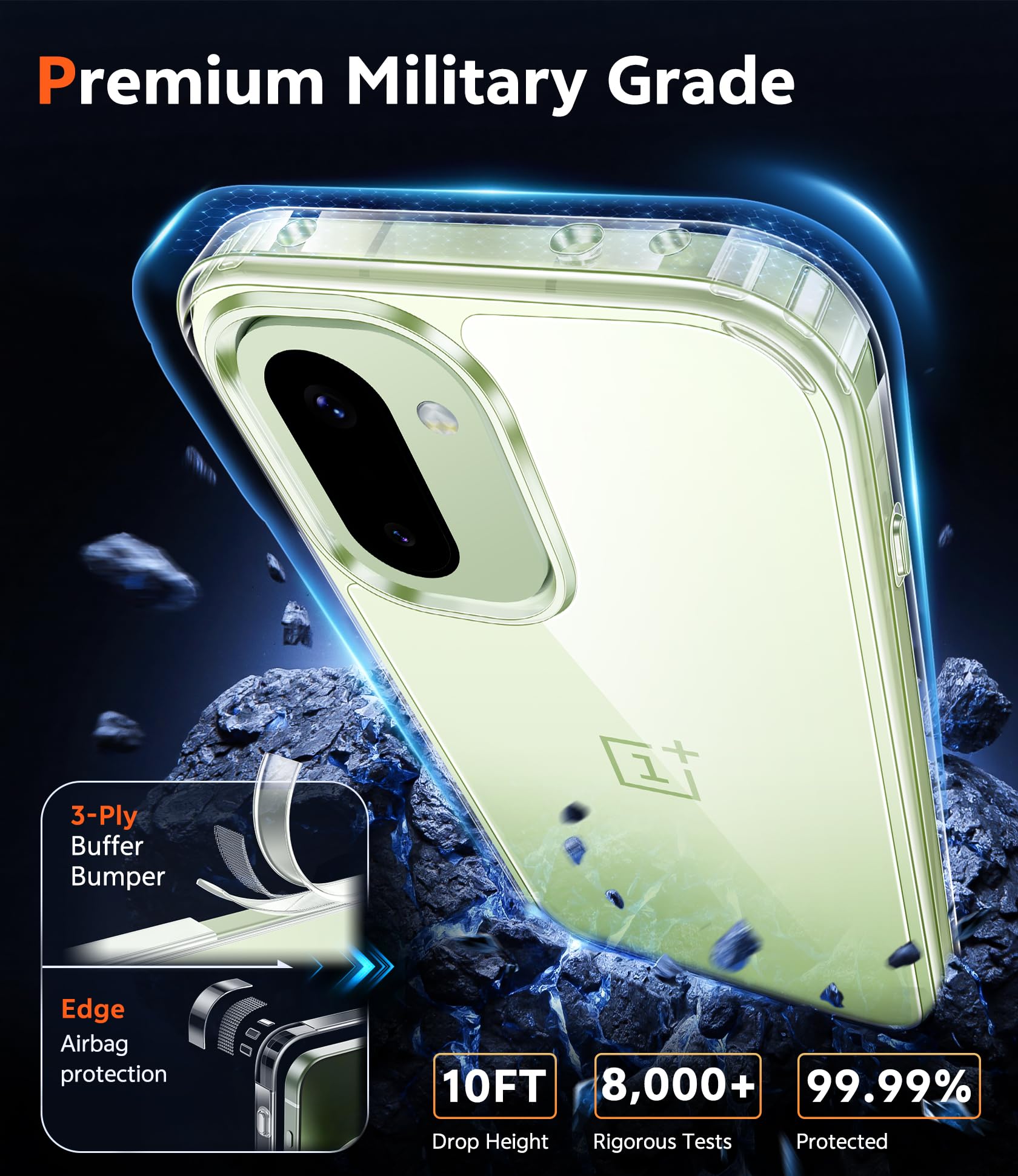 10FT Military Grade Protection: Passed Military Drop Tested up to 10 FT. This One plus 15R clear case backplane is made with rigid polycarbonate and flexible shockproof TPU bumpers around the edge and features 4 built-in corner Airbags to absorb impact