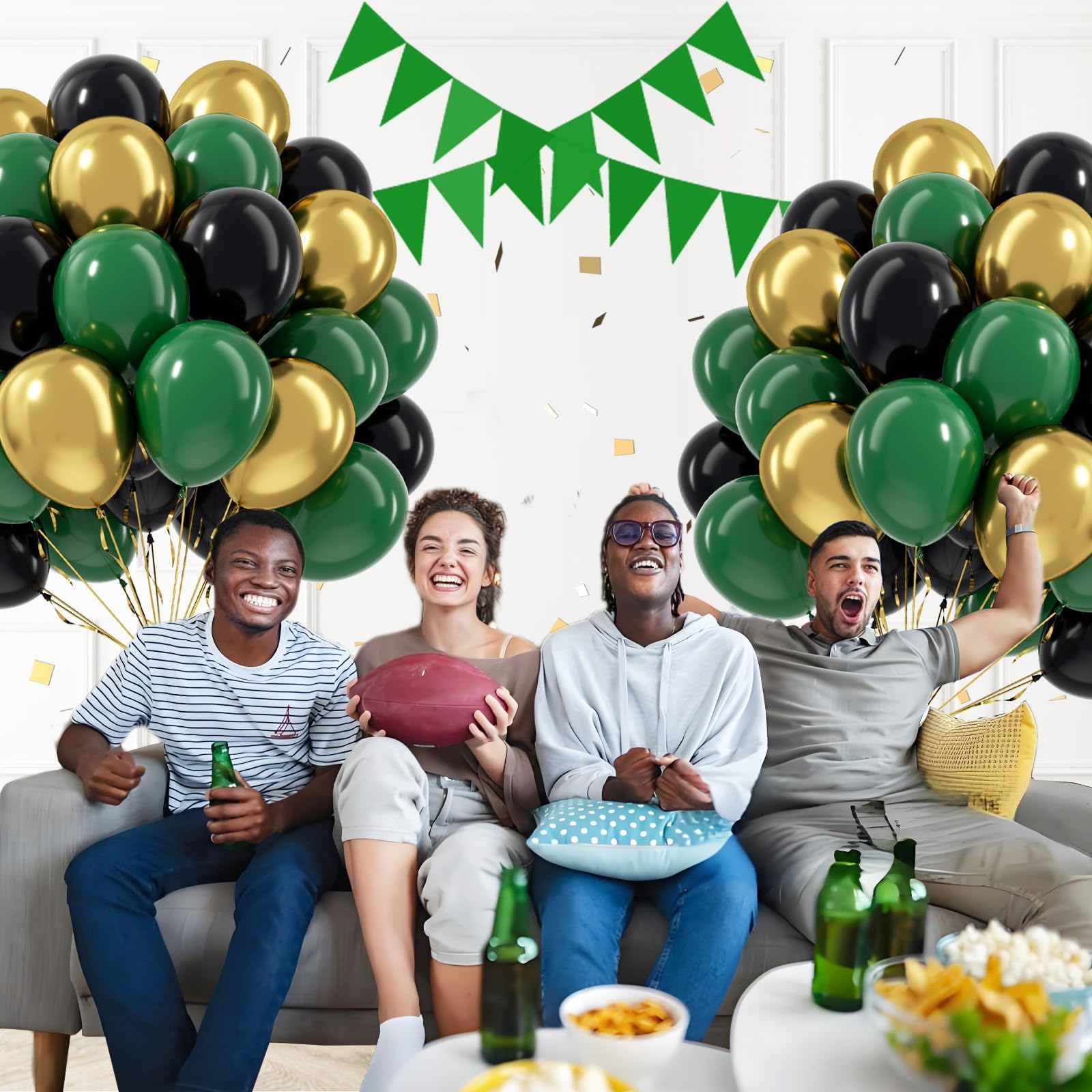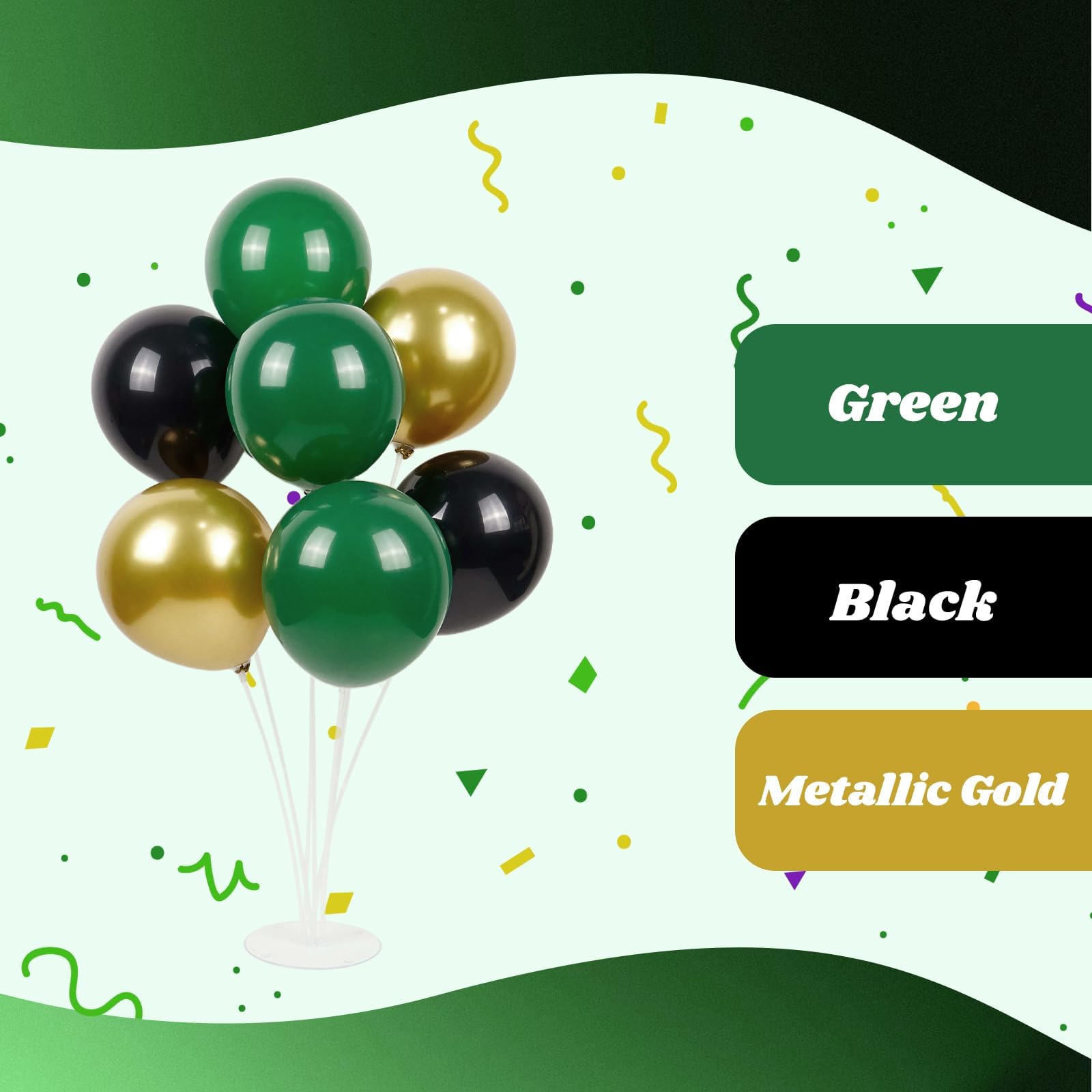 Package Include: The green and black balloons include 12inch green balloonsx25, 12inch black balloonsx25, 12inch metallic gold balloonsx10, glue dotsx20, gold ribbonx1