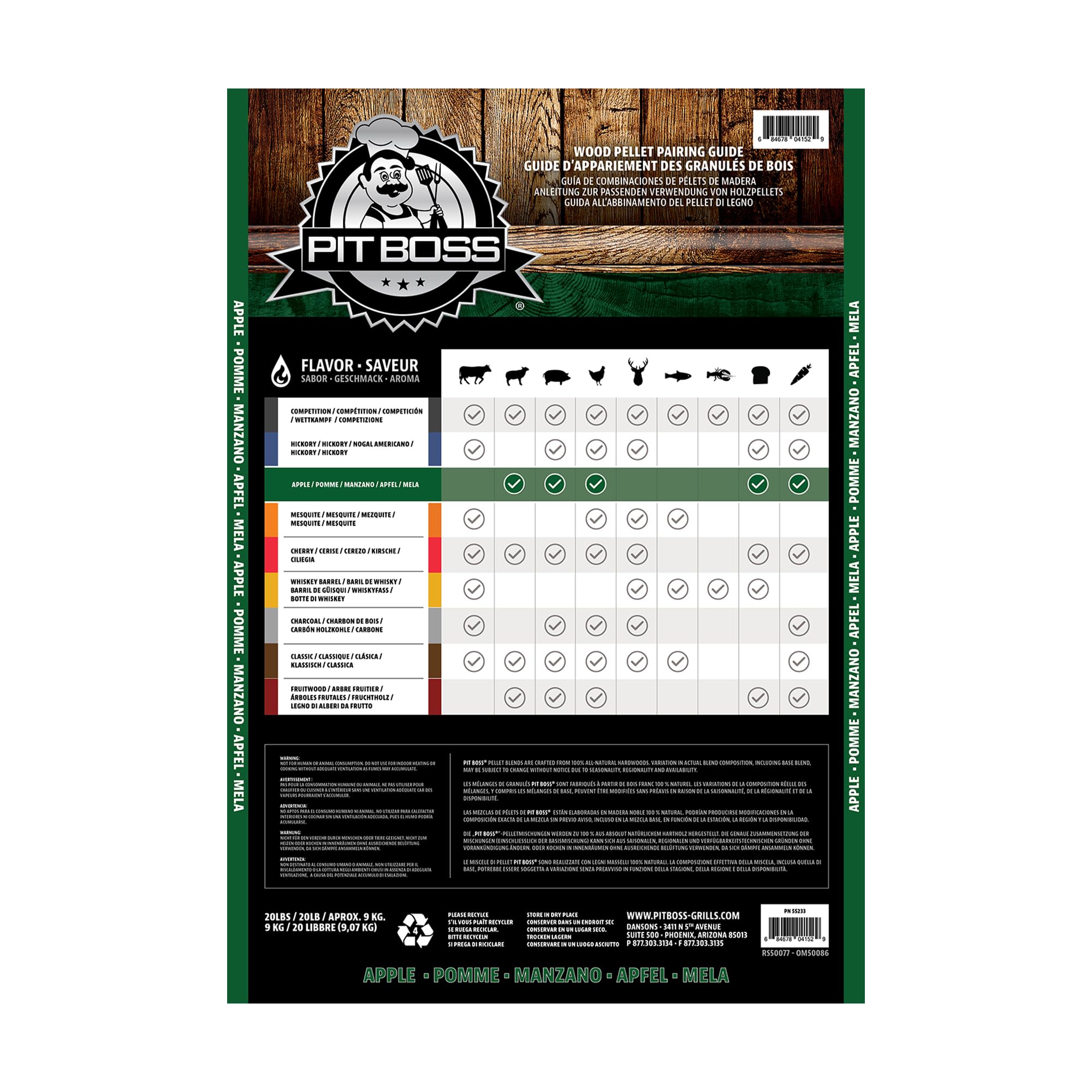 Pit Boss Apple Hardwood Pellets are the go-to blend for your all your smoking needs. The flavor is mild and fruity with a subtle sweetness that tastes best with poultry, pork, seafood, and lamb. Pit Boss Apple Hardwood Pellets feature 100% all natural applewood are free from added scents, sprays, chemicals, or glues. Experience the clean, crisp and smokey flavor of Pit Boss Apple Hardwood Pellets.