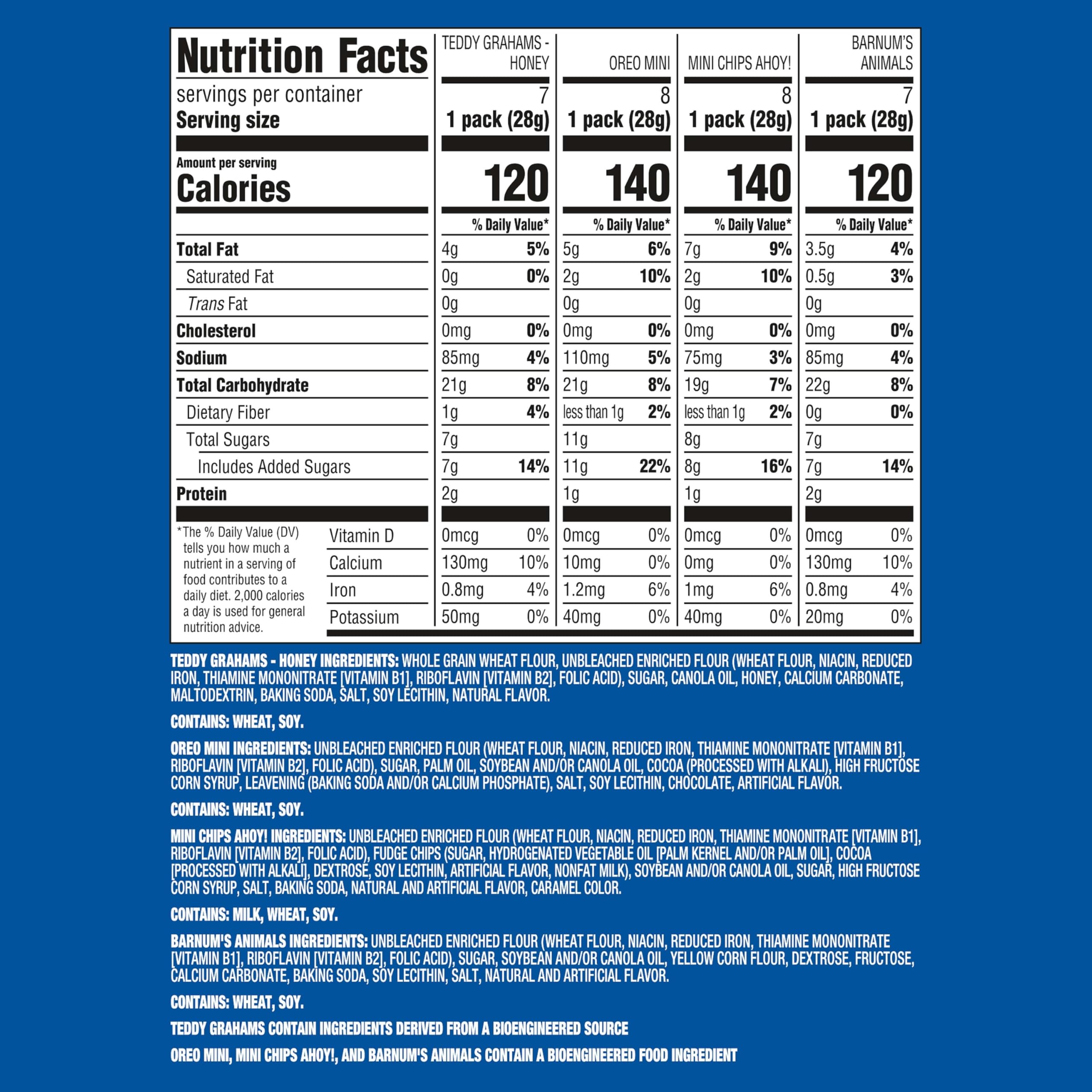 One 30 count Nabisco Team Favorites Snack Variety Pack, 8 OREO Mini, 8 CHIPS AHOY! Mini, 7 Teddy Grahams, 7 Honey & Barnum's Animal Crackers (packaging may vary)