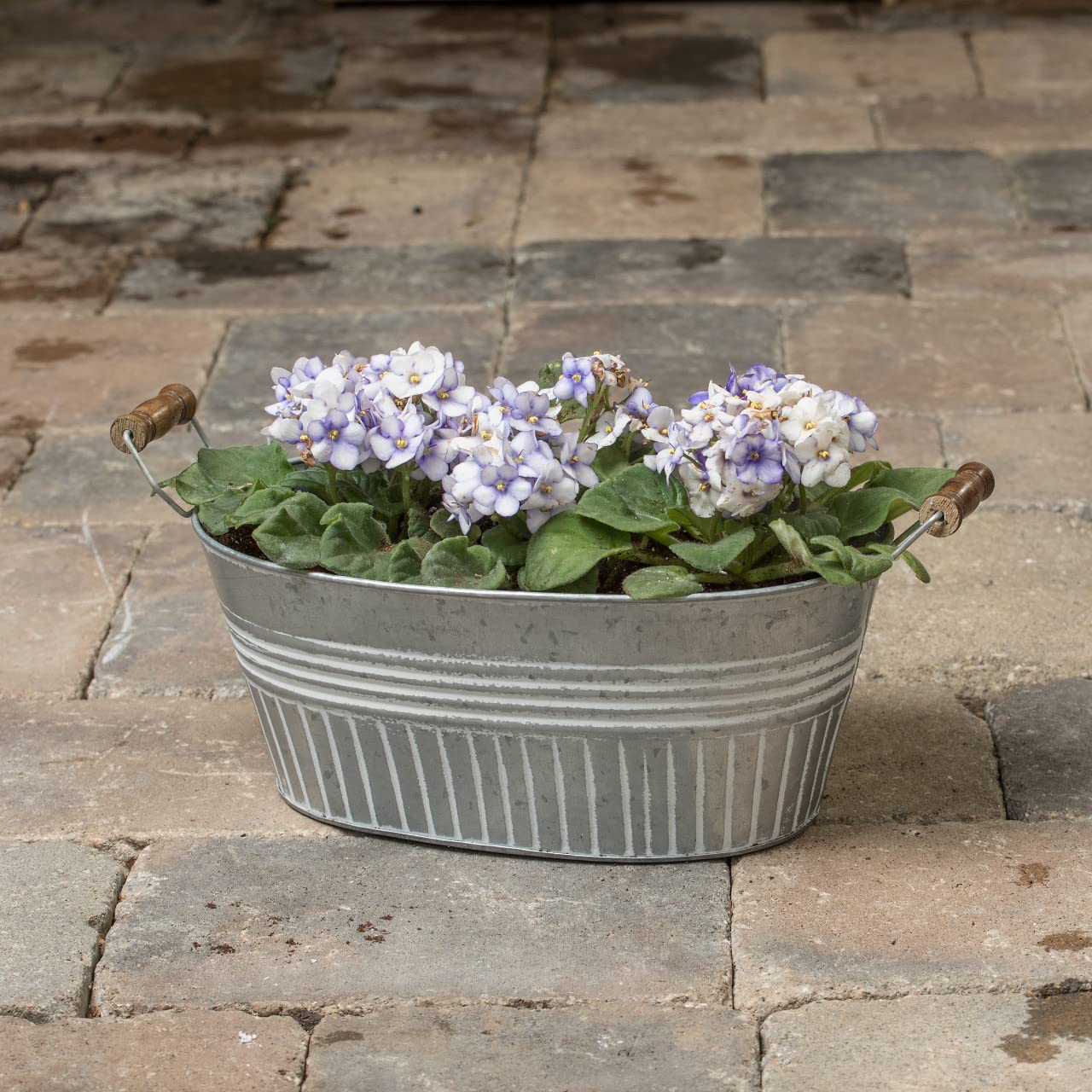 Galvanized with white wash, metal handles with wooden grips and bottom has drainage holes.