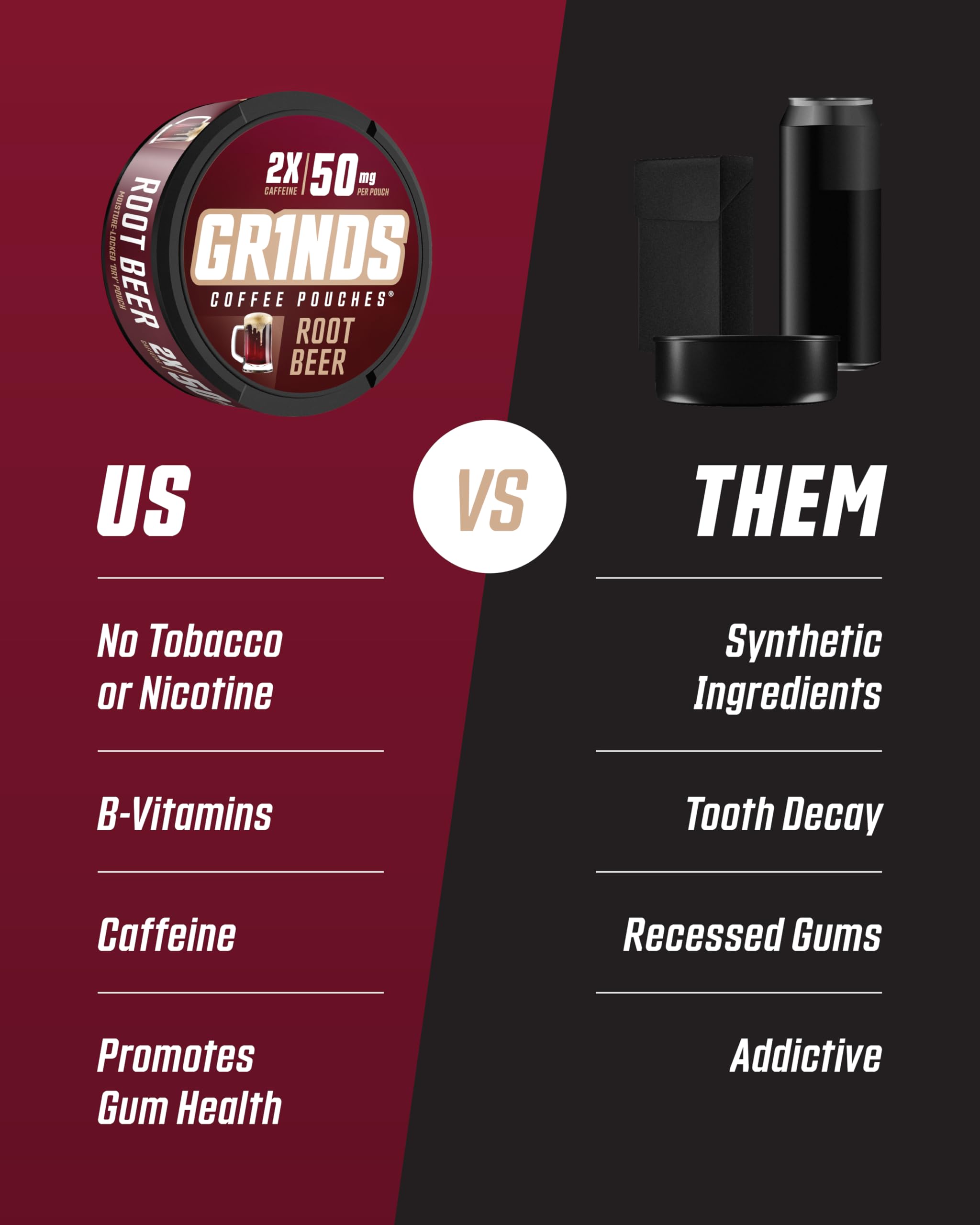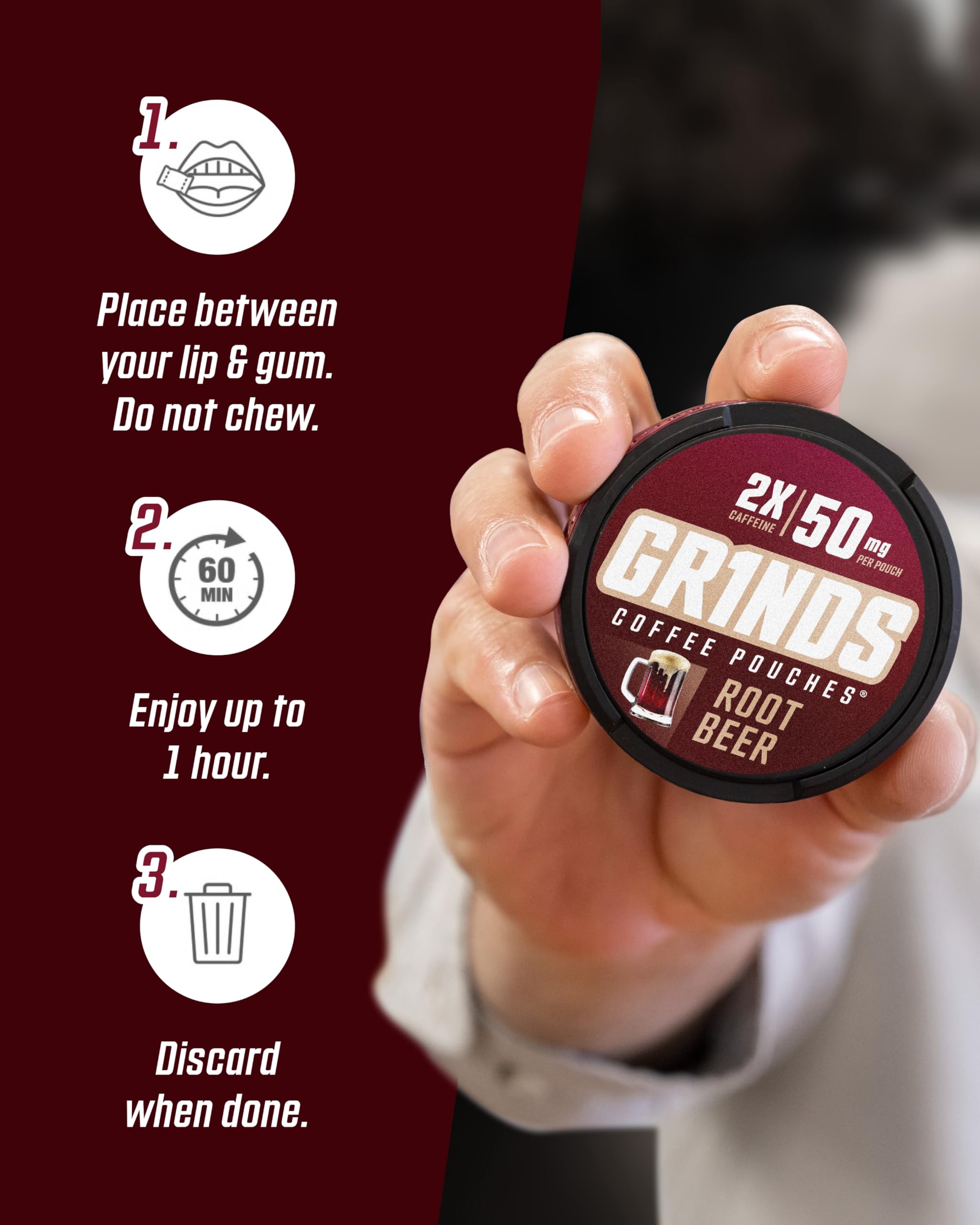 POWERFUL CAFFEINE BOOST: Each can of Grinds Root Beer includes about 18 energy pouches, each packed with 50mg of caffeine. Whether you need a quick pick-me-up or sustained energy throughout the day, our nicotine free pouches are the convenient solution to keep you alert and focused. Our no caffeine pouches will give you just the right amount of energy you need to get through your day.