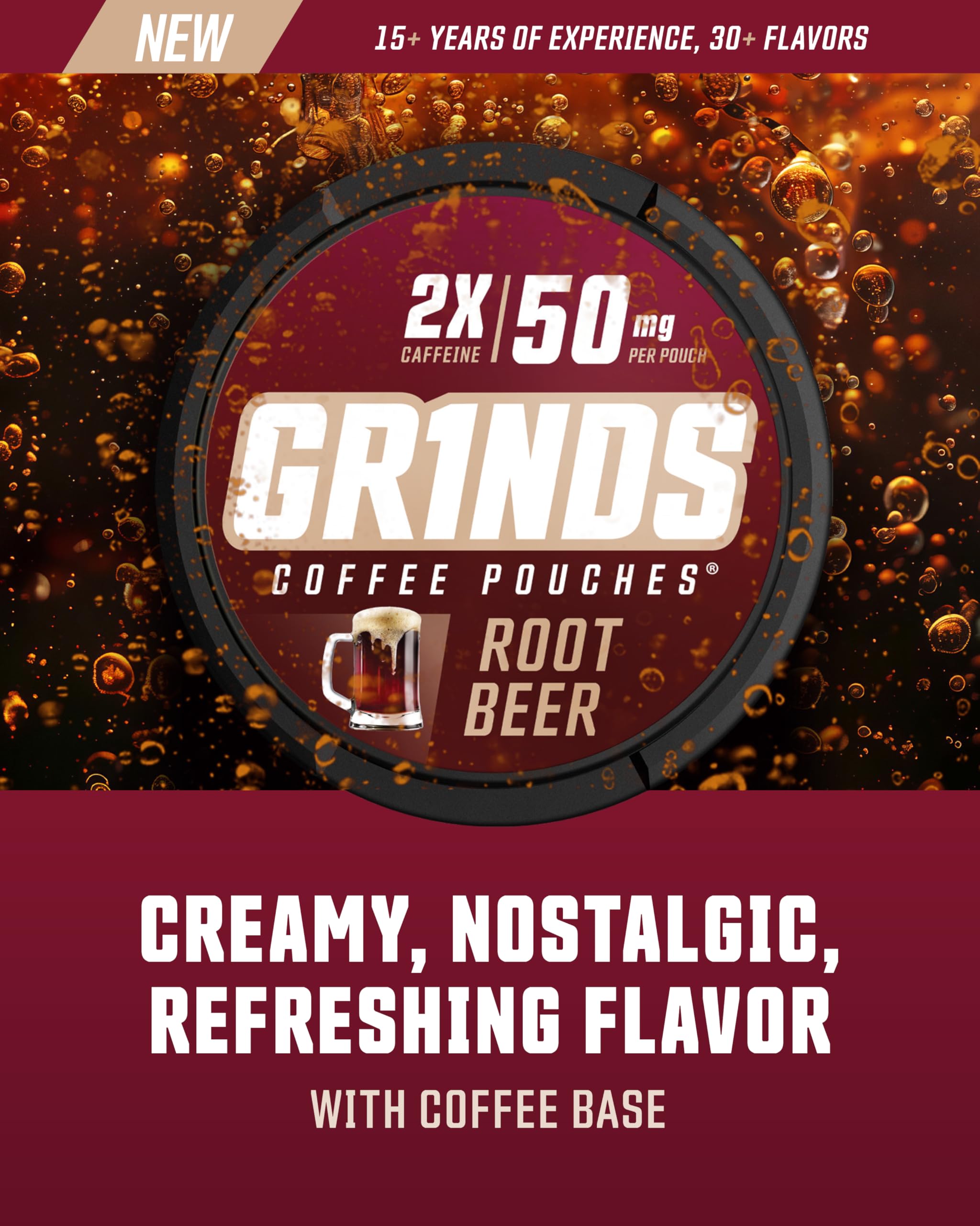 NOSTALGIC ROOT BEER: Creamy, nostalgic, and refreshing flavor of Grinds Root Beer. Designed for those who savor invigorating flavors, our coffee pouch pouches are perfect for your daily grind, packing 2x the caffeine to keep you energized throughout the day.