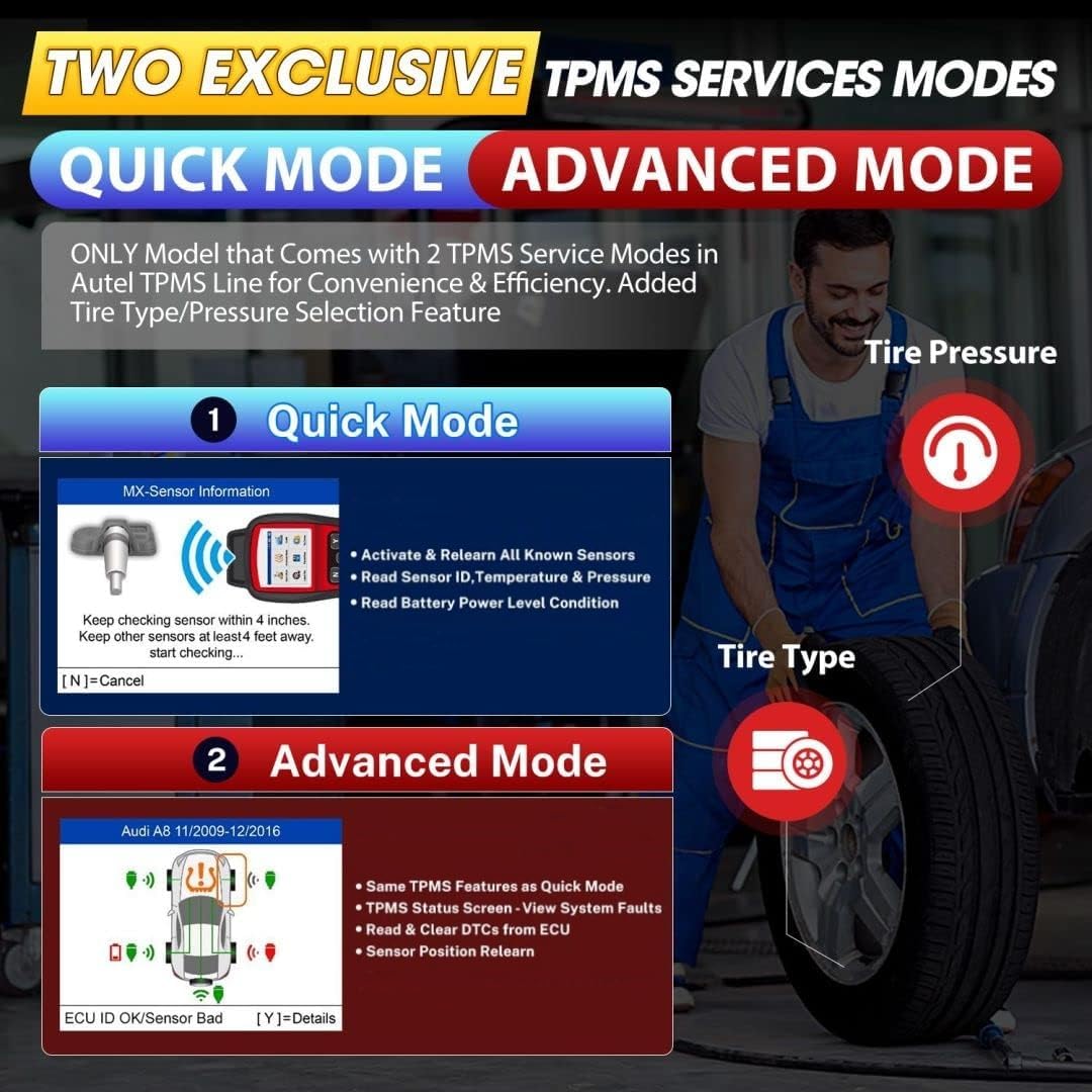 🏆【4PCS of Autel TPMS Sensors, Valued 120 Bu-cks】Autel newly launched press-in MX-Sensor will change the way you install the sensor! Compared with Screw-in MX-Sensor, the exclusive patented PRESS-OUT and CLICK-IN design allows you interchange rubber and metal valve stems at ease without requiring a tool; Also more pro feature make it top dog:✅Dual 315MHz + 433MHz Frequencies✅±10 kPa Pressure Reading Accuracy✅99% Vehicle Coverage. All of it means lower repair cost and higher install efficiency.