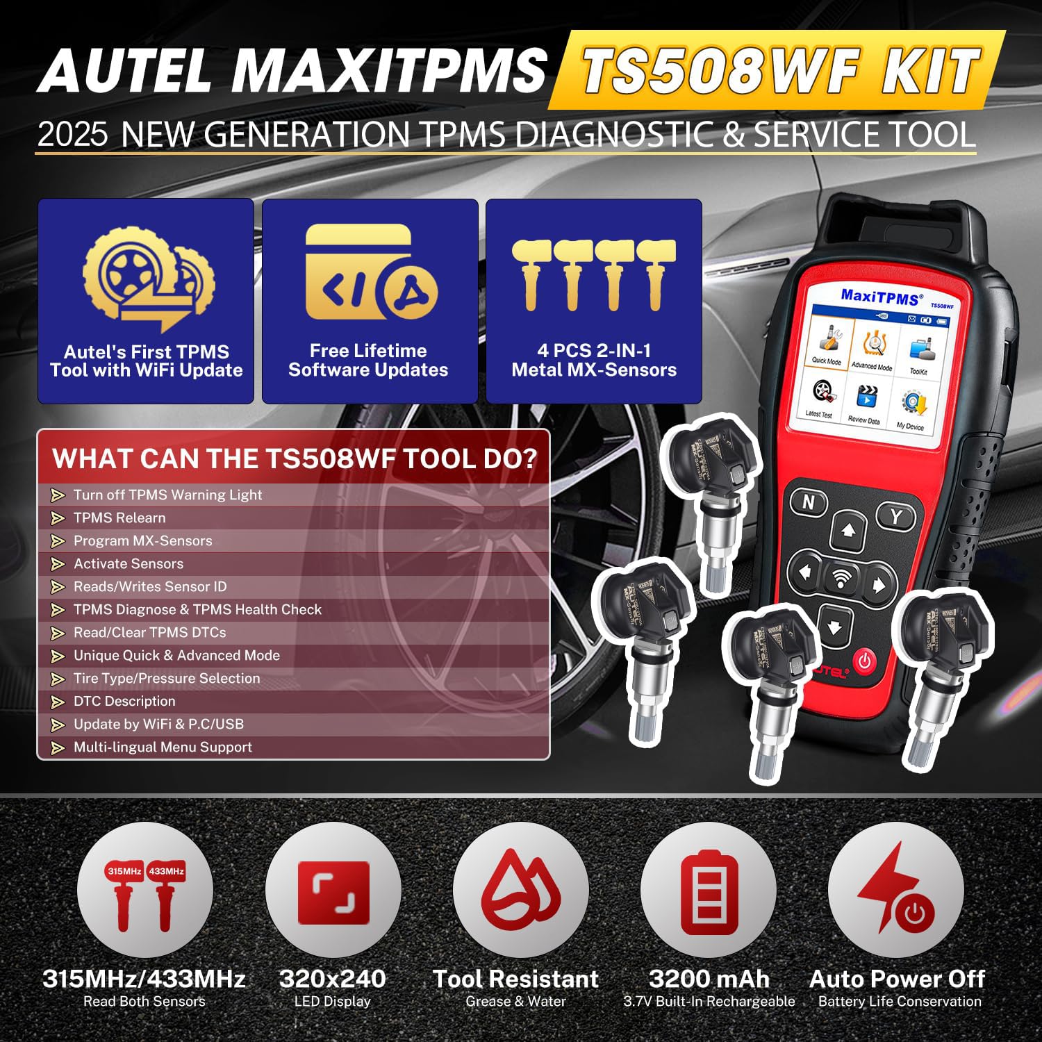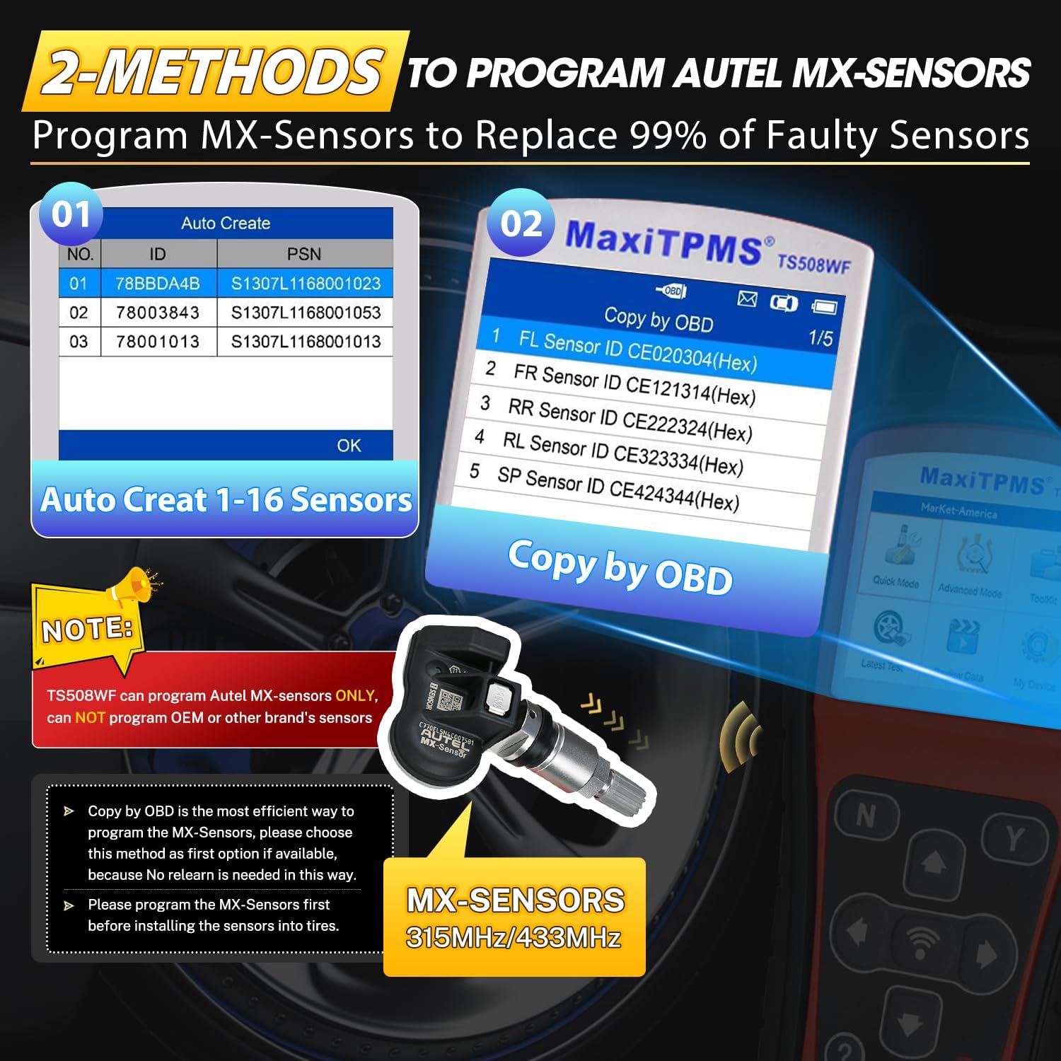 🏆【Autel TPMS Sensor Programming】Autel TS508WF TPMS programming tool allows users to program all Autel MX-sensors to replace 99% of OE/ OE-based sensors in the market. TS508WF can program AUTEL MX-Sensor in 2 options: Auto Create 1-16 Sensors and Copy by OBD (TS408 CAN NOT). TS508WF comes with 4pcs Autel MX-Sensors (315MHz+433MHz 2-in-1) to offer a perfect solution for quick TPMS service repair. 🚩Note: Autel TS508WF can ONLY program Autel MX-sensors, CAN'T program other brand sensors.