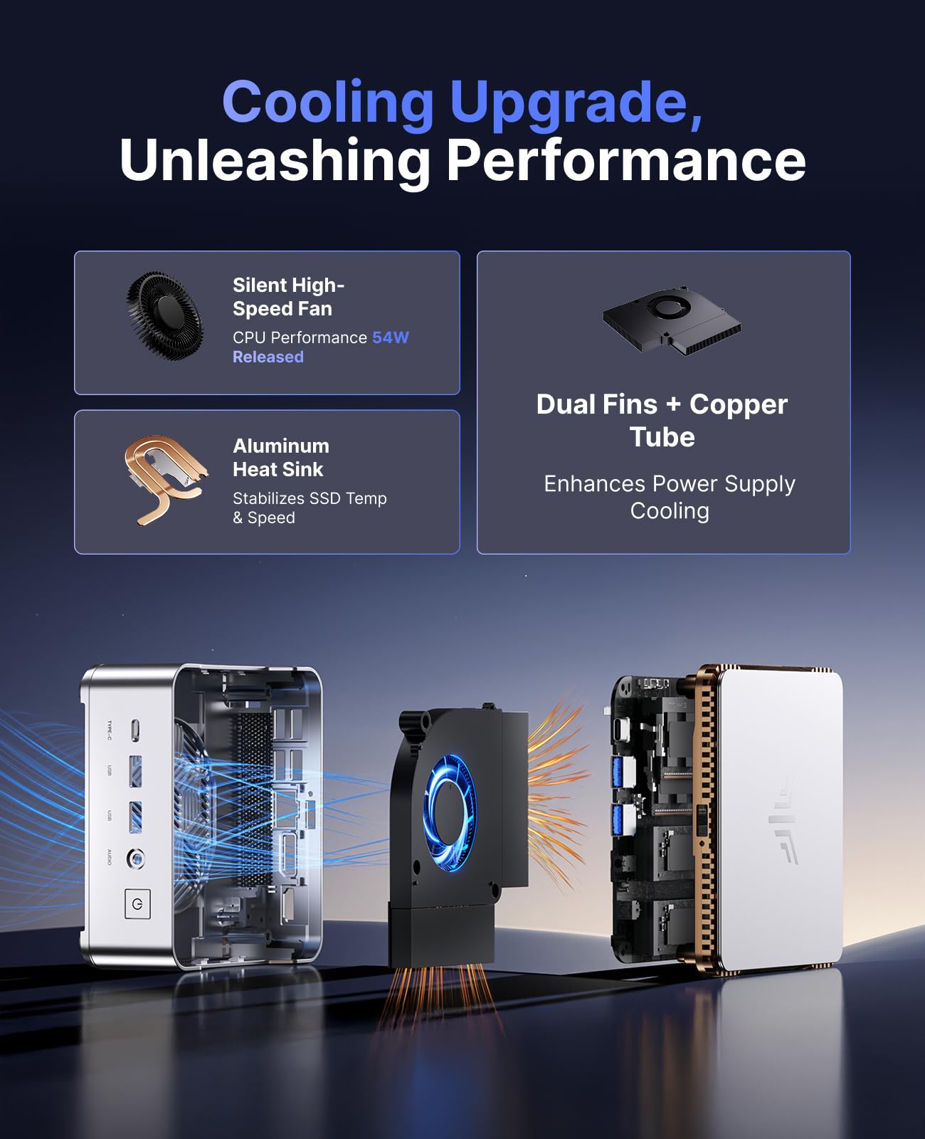 【Professional-Grade Cooling System】KAMRUI Mini gaming PC features an upgraded silent centrifugal fan, dual copper heat pipes, and a dual-fin module. Its all-copper structure enhances thermal conductivity, boosting airflow efficiency by 35% and overall heat dissipation by 40%, ensures the CPU can stably deliver up to 55W performance under full load.Upgraded aluminum heatsink keeps the SSD cool to maintain read/write speeds, ensuring desktop-level stability and power for demanding workloads.