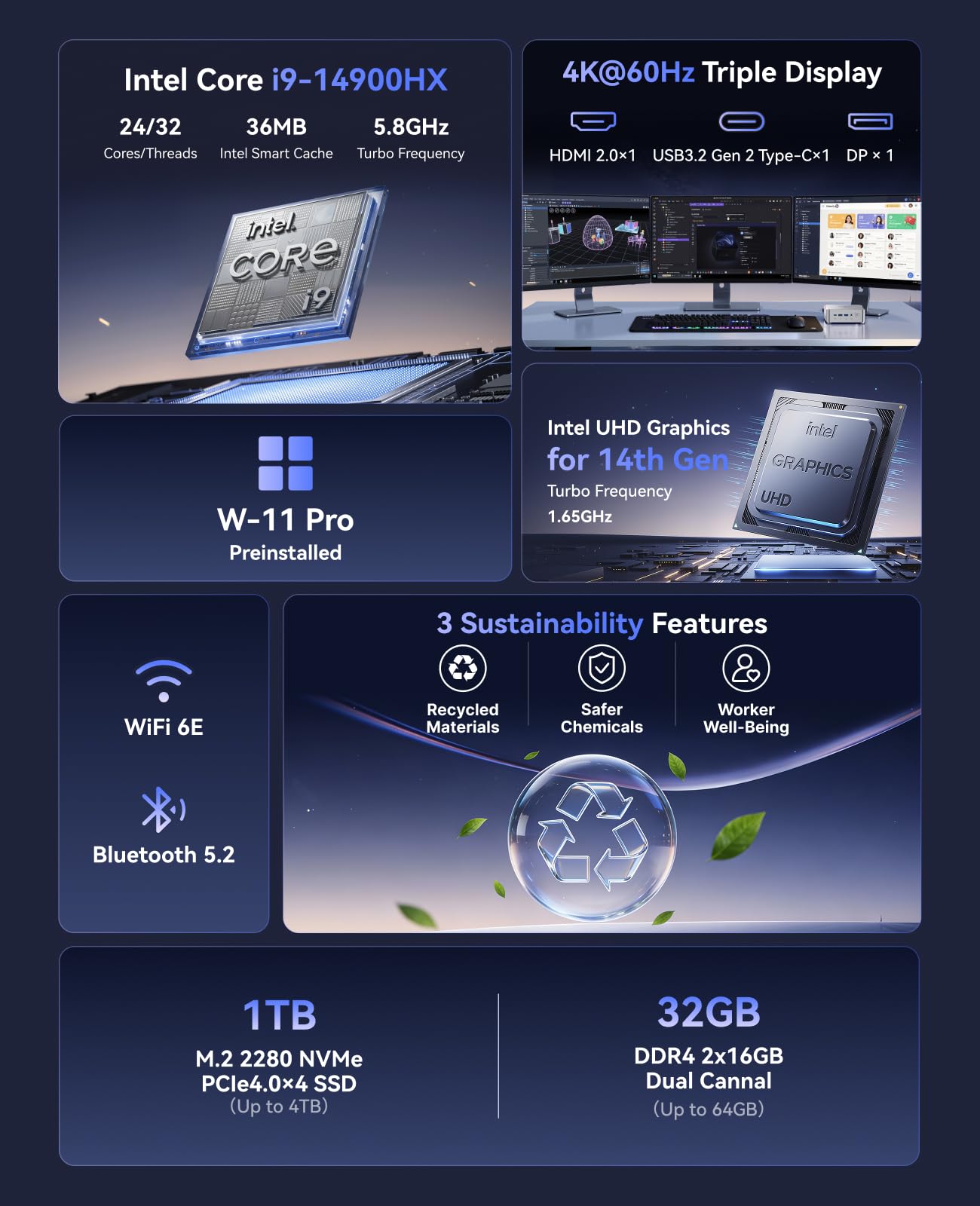 【Upgrade 14th Intel Core i9-14900HX Processor】KAMRUI Mini Computers features the 14th Gen Intel Core i9-14900HX processor (up to 5.8GHz, TDP 55W, 36MB cache, 24C/32T), delivering 25%–40% higher performance than the i5-14450HX (24C/32T) and i7-1280P in multitasking, creative work, and high-load applications. Manufactured using Intel 7 (10 nm) process technology, Mini Computer efficiently allocates workloads to deliver faster response times, smoother operation, and heightened productivity.