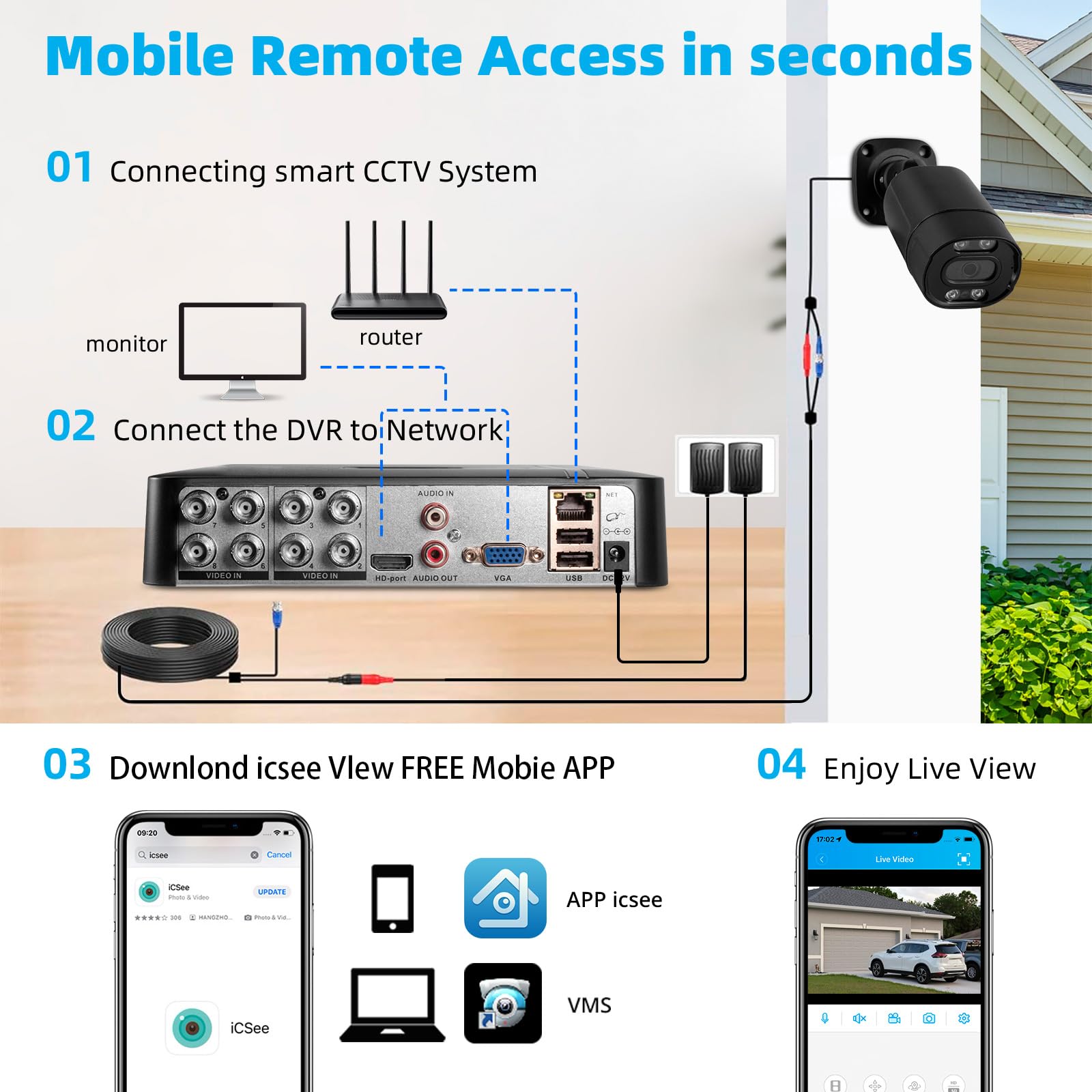 【Remotely Anytime and Anywhere】: Whenever real threats are detected, immediate pushes pop up on your phone, and you can check it out via 3G/4G/Wi-Fi.Using the latest Cloud Technology, With the free APP, You Can Remote View or via Smart Phones, Tablets, Notebook or PC.Install download “icsee” View free mobile APP through scanning QR-code or download from APP store. However far away you are from home, this reliable security system secures your peace of mind day&night.