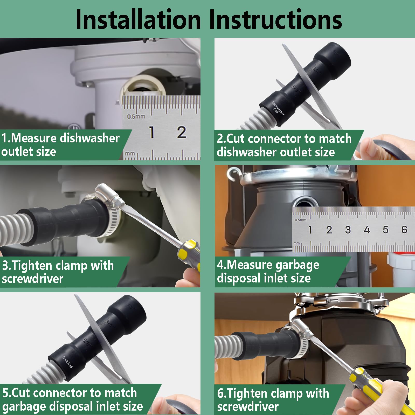 【Kind Reminder】Before purchasing, please measure the sizes of the dishwasher end and the garbage disposal or sink end, then confirm if this drain hose is a good fit for your dishwasher.