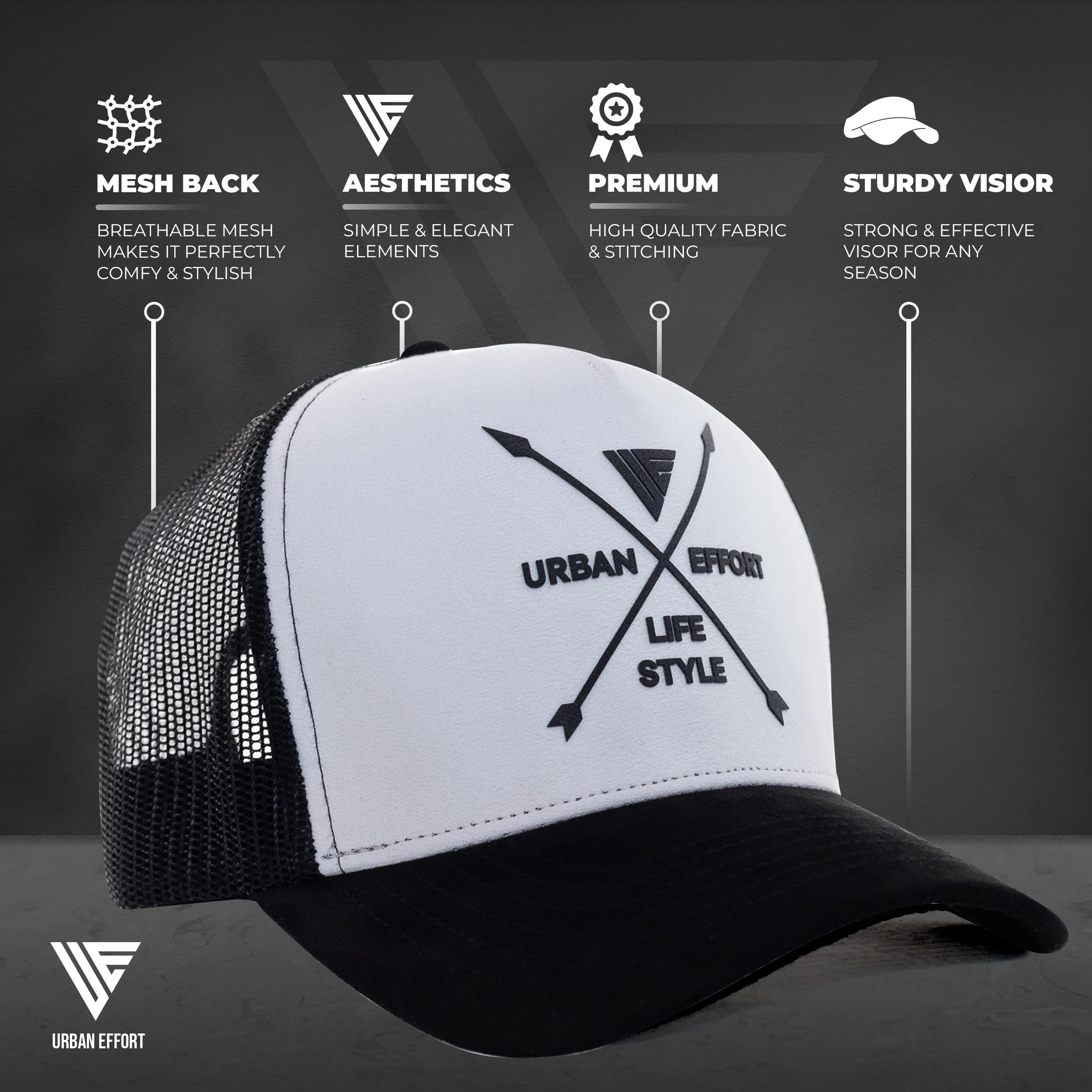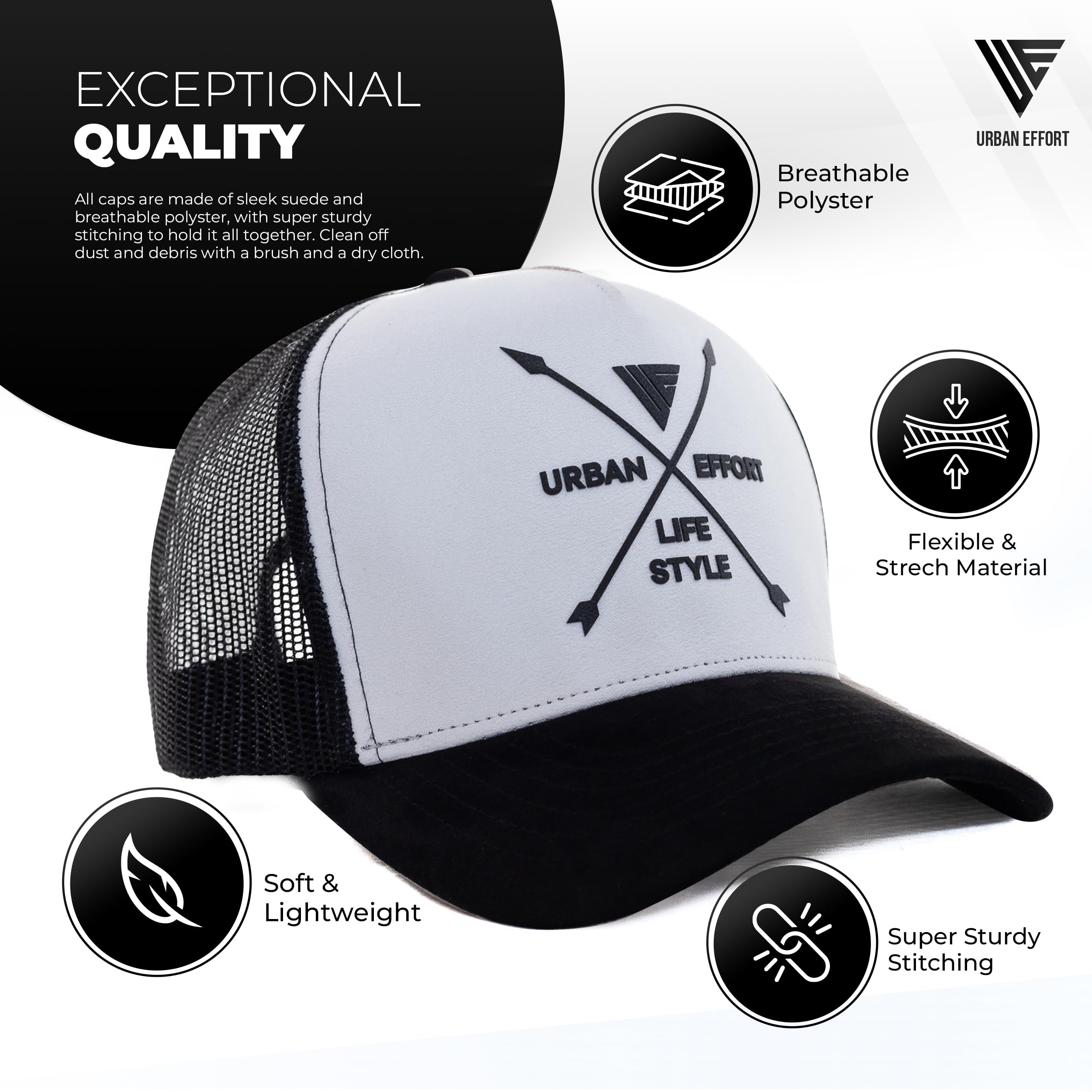 ✅Premium Quality: The Urban Effort women and man's cap is a true standout. It combines a premium combination of polyester mesh and suede fabric for comfort, along with intricate details that make it truly unique. With its exquisite craftsmanship, this cap is made to last. It's made of 100 percent polyester for durability and is a super comfortable, adjustable hat with a snapback.