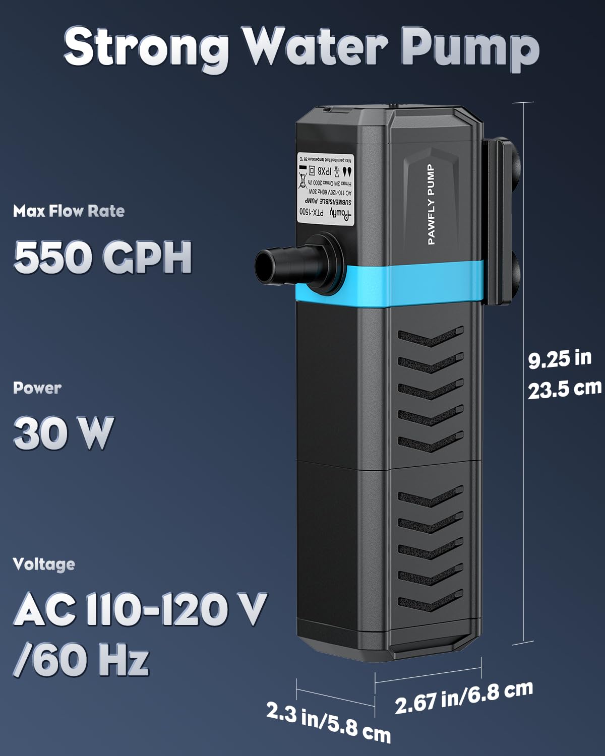 Powerful Water Pump: Max flow rate: 550 GPH; Power: 30 W. With the strong water pump, the internal aquarium filter always brings efficient water filtration and circulation. Work best on 120 to 200 gallon freshwater or saltwater fish tanks and ponds. Greatly meet different aquarium filtering needs