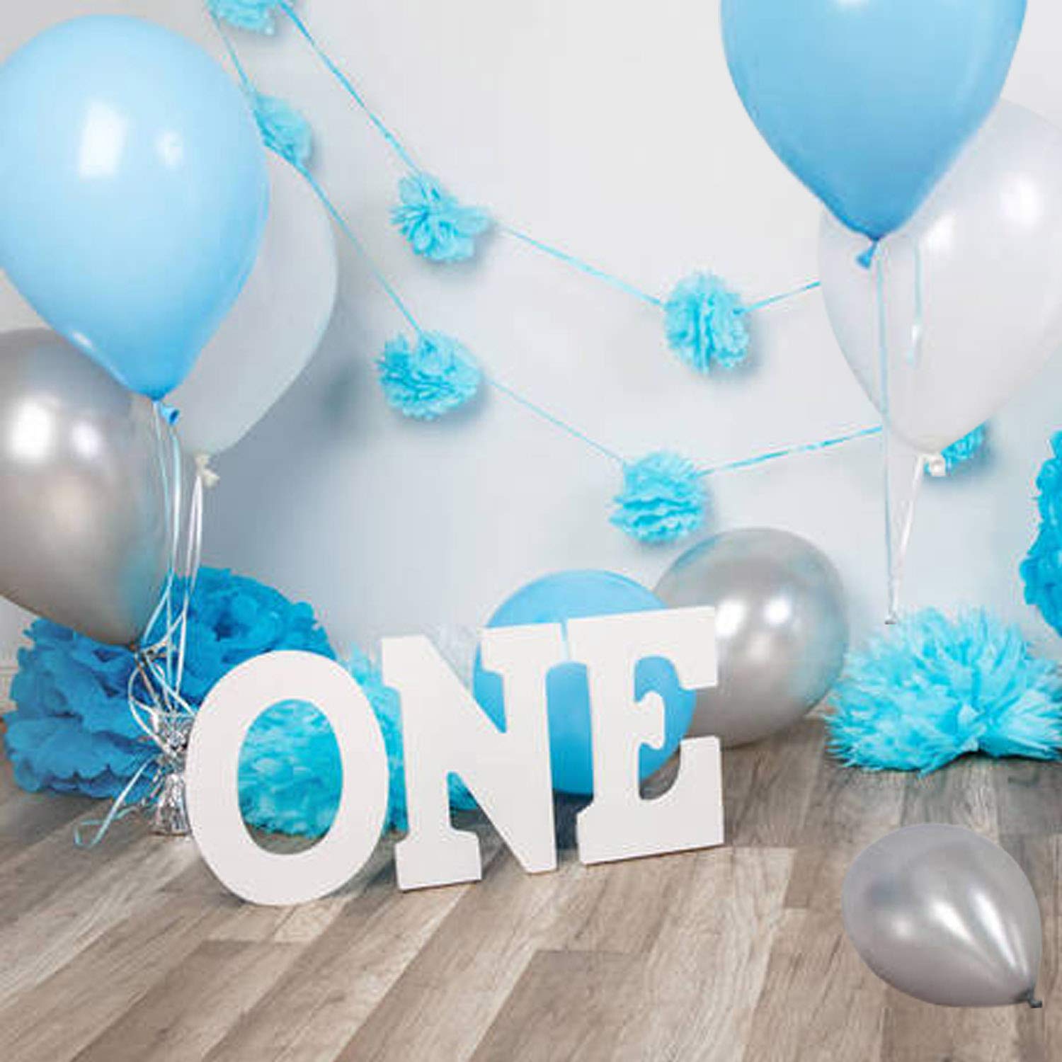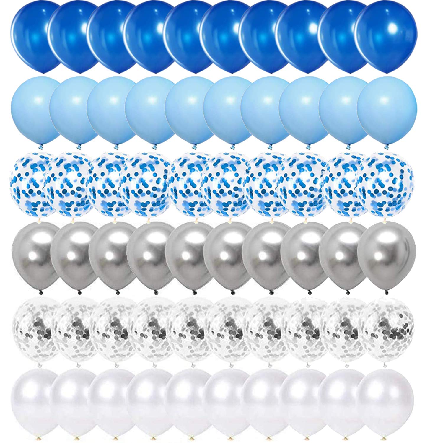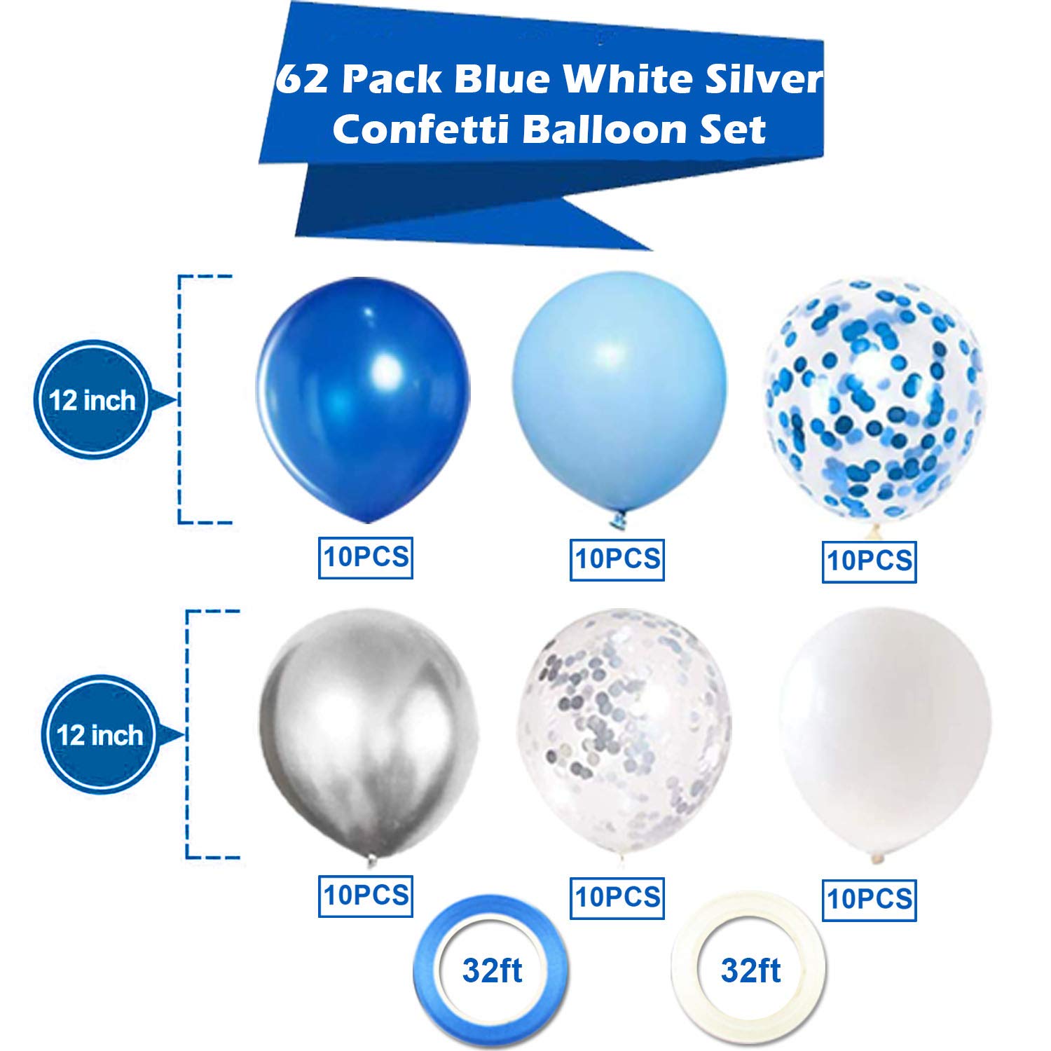 BIRTHDAY PARTY BALLOONS: Package include 10 royal blue balloons, 10 baby blue balloons,10 metallic silver ballloons,10 white balloons,10 blue confetti balloons, 10 silver confetti balloons and 2 roll of balloon ribbon, 62pcs in total.