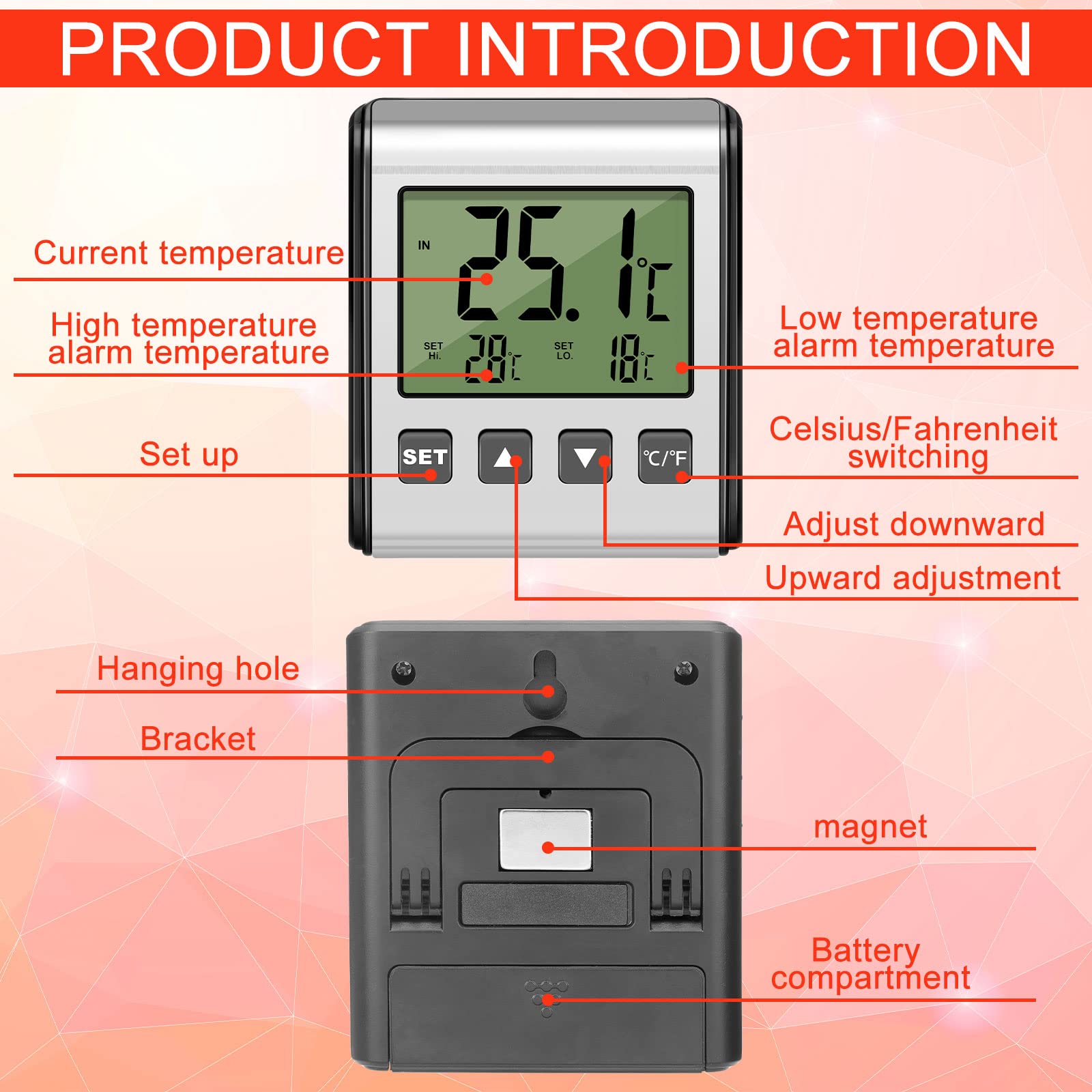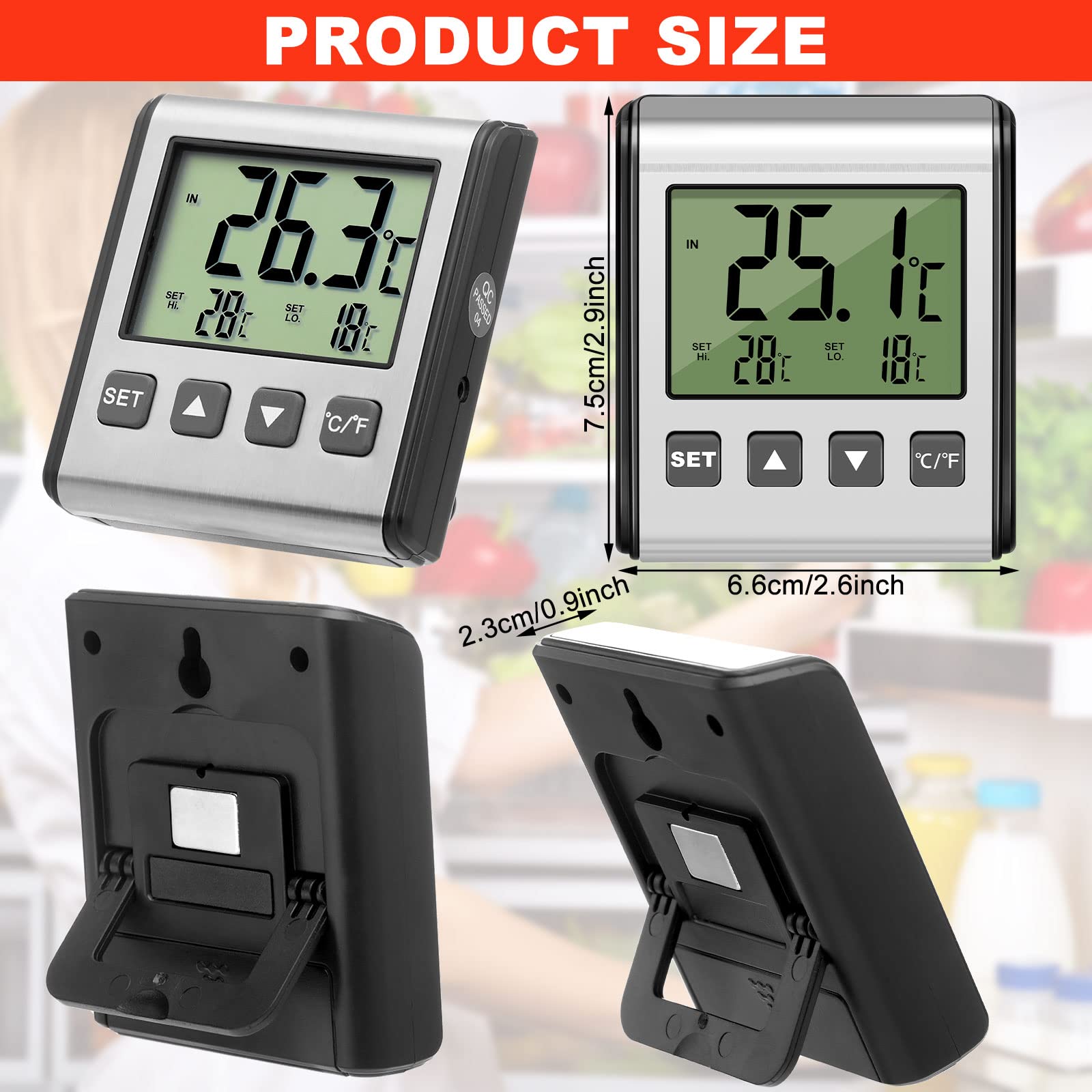 Magnet on the Back: the fridge thermometer is designed with magnet on the back, easily for you to stick on the refrigerator, and there is also a fold stand on the back, so you can choose to put it in the desk either, convenient for you to use