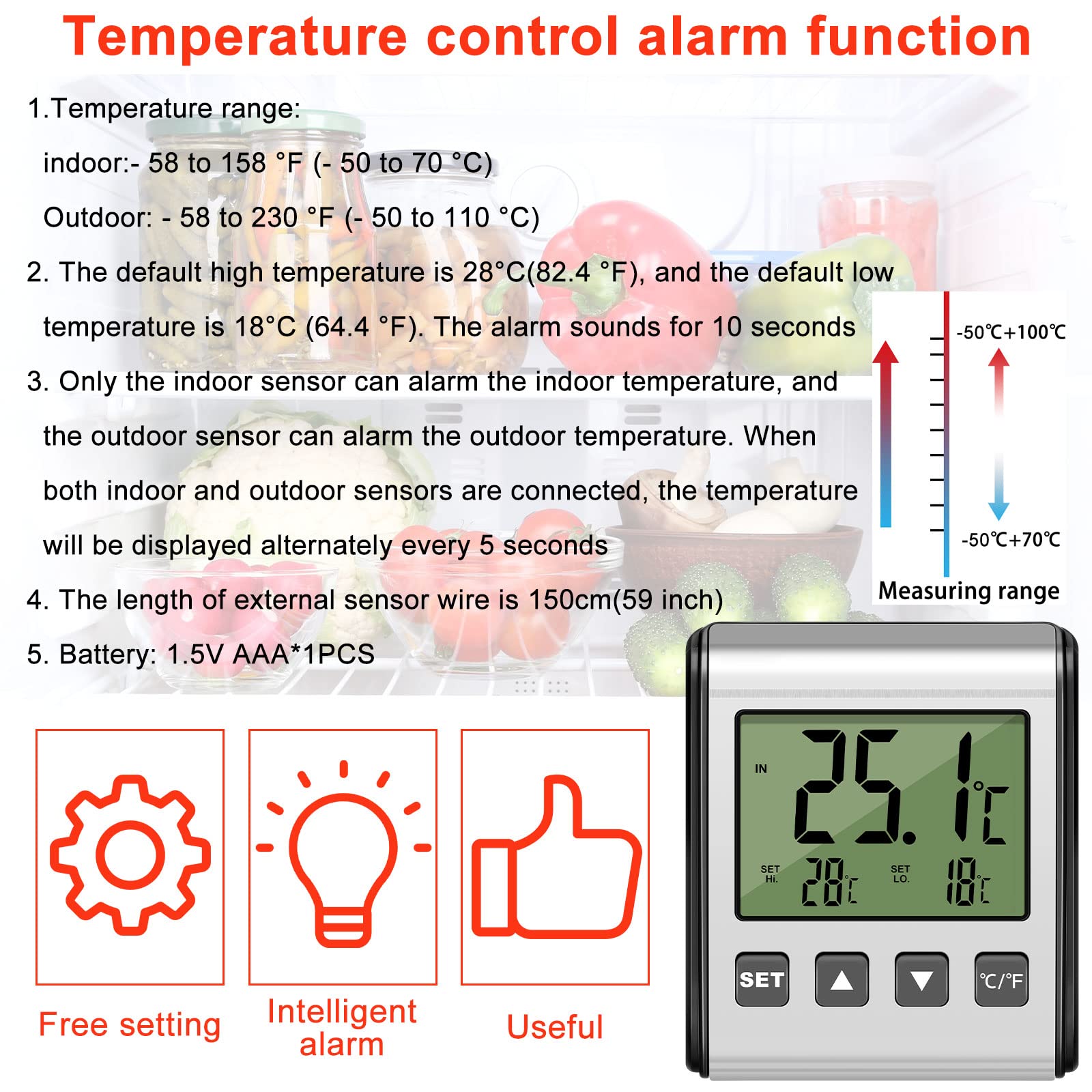 Easy to Use: the freezer thermometer can be chosen to degrees Celsius or degrees Fahrenheit by the front °C/ °F key, and the large display can clearly show you the temp, convenient for you to use; The range of the temp indoor and outdoor is from - 58 to 158 °F (- 50 to 70 °C) with an accuracy of +/- 1 °F, resolution of 0.1 °C