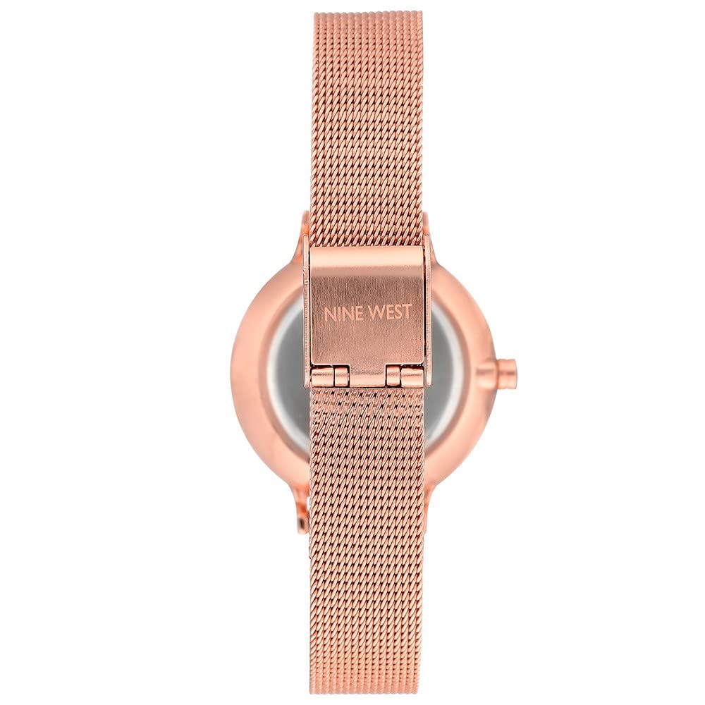 Slightly domed mineral crystal lens; silver-tone dial with rose gold-tone hands and markers