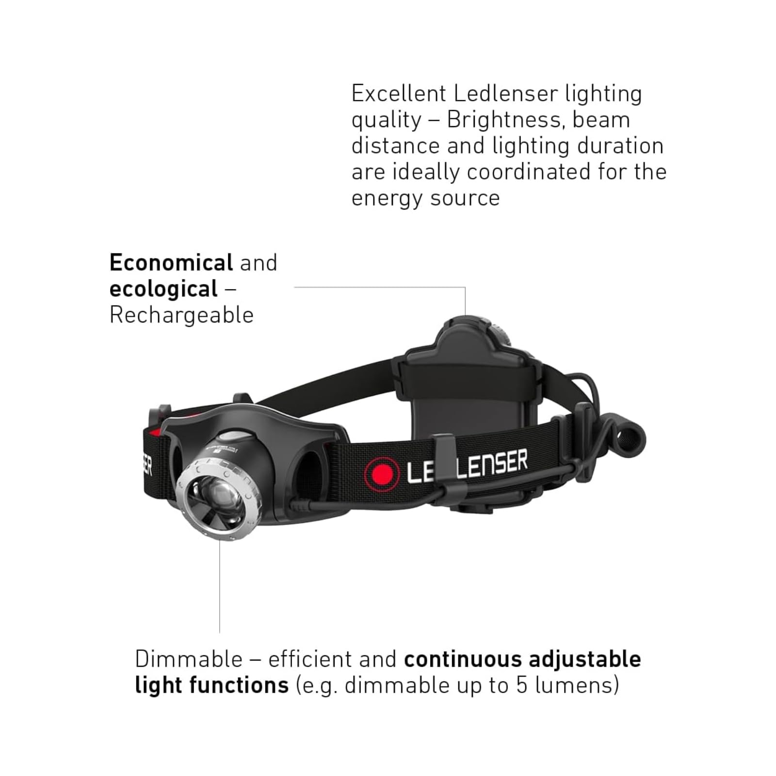 Product Description The Ledlenser H7R.2 is a hardworking head torch that offers a high-quality LED lens for wider illumination with up to 300 lumens of light output. It's easily dimmable with the wheel on the rear rechargeable battery pack, dimming down to 5 lumens. Our Advanced Focus System allows you to transition light from a broad flood beam to a sharply focused long-distance beam, and a rear red light provides added visibility. The H7R.2 is a great work or everyday lighting solution for those tasks when you need to keep your hands free. Set Contains: 1 x LED Lenser 7298 H7R.2 Rechargeable Head Lamp Box 1 x Li-ion battery pack 1 x Belt-hook 1 x Mains charger 1 x USB cable