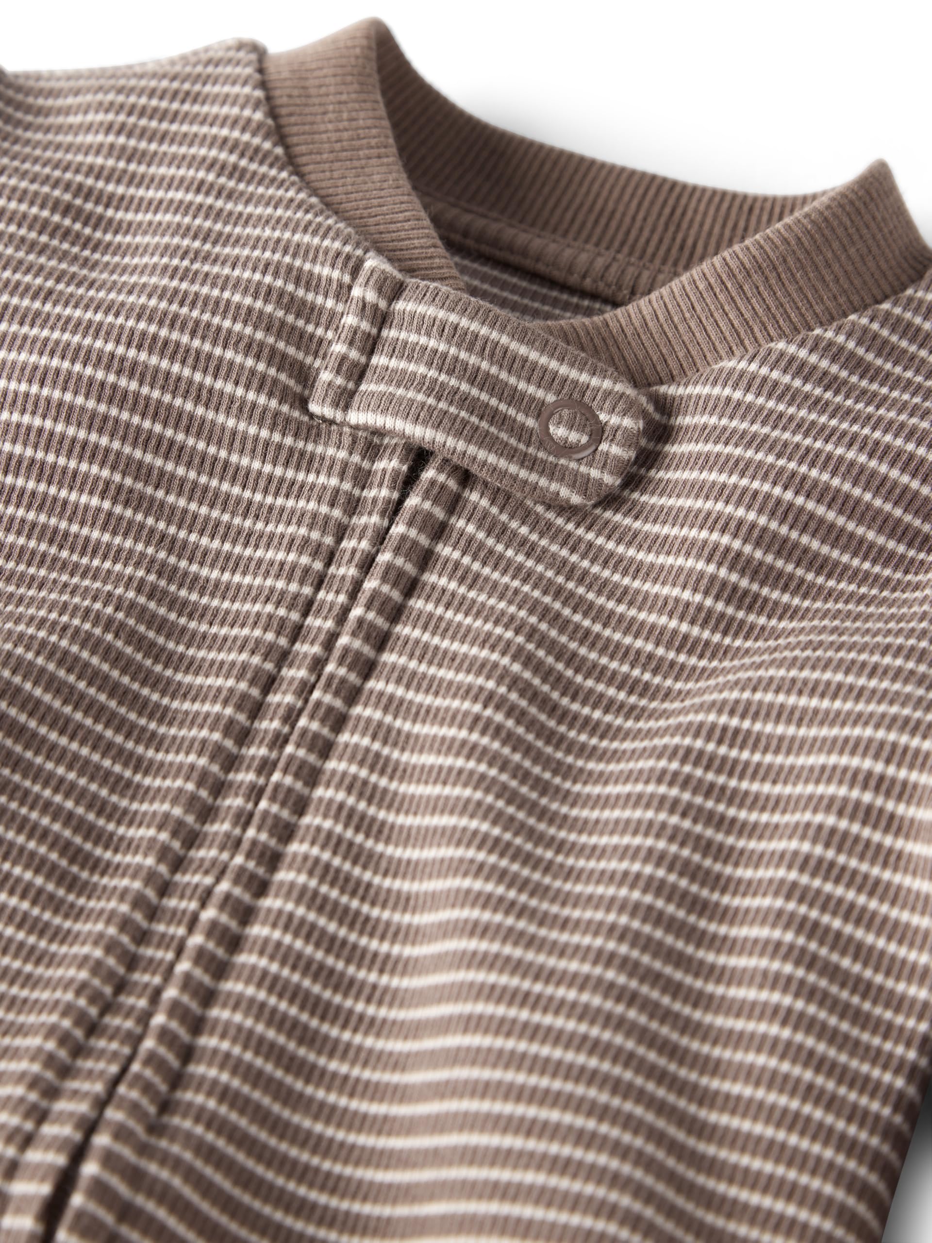 Super soft organic ribbed binding. Built-in footies, no grippers.