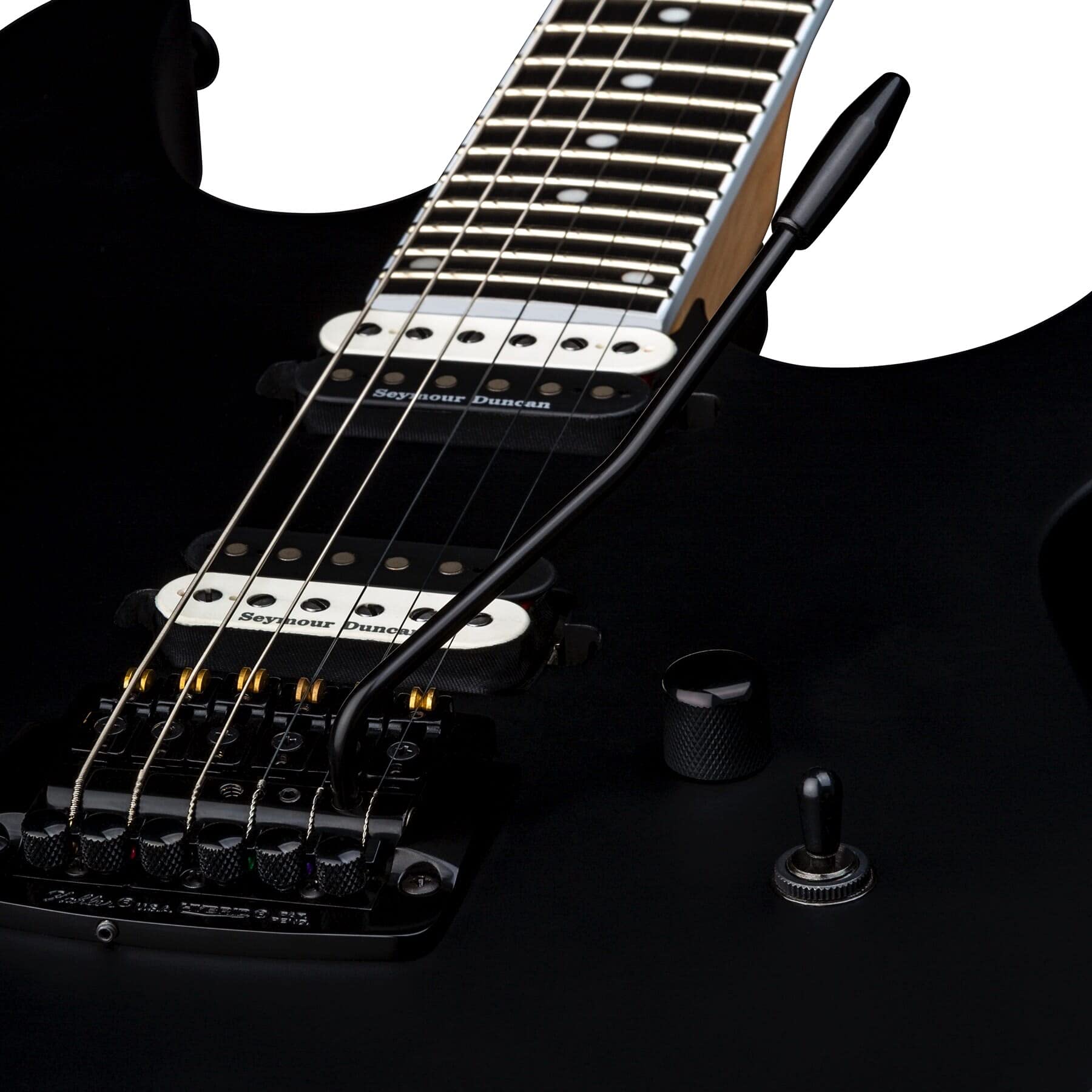 The Dean MD24 K is an homage to the days when Guitar driven music evolved to its highest form, with technical excellence a prerequisite for success, and your gear a reflection of your style and influences. Built with a classic Kahler Hybrid Tremolo system with the added new Kahler locking nut, this new advancement removes the need for a string tree with built in break angle to avoid any pitch shifting when locking down. Black Satin finished Basswood body and a 24 fret ebony fingerboard loaded on a 3 piece maple neck not only looks great but sounds incredible. Exclusive Parchment Seymour Duncan TB5 and APH-1 high output pickups have all the gain for modern metal to glassy cleans and warm bluesy rock tones.