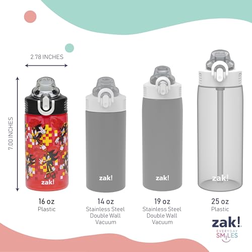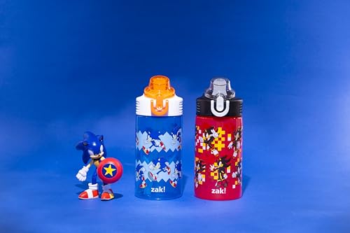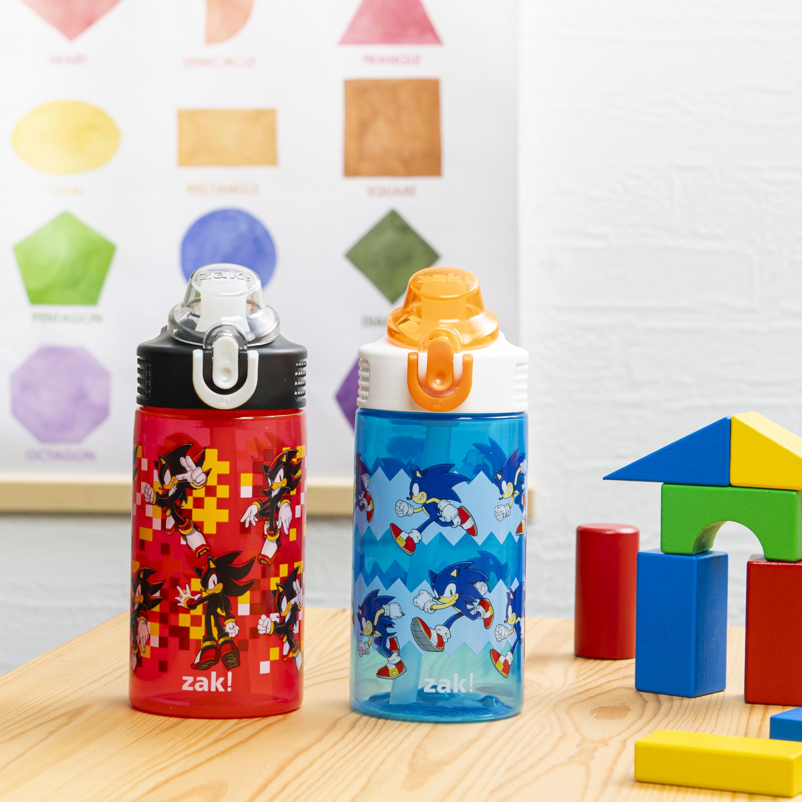 Let kids enjoy hydration with a fun Sonic the Hedgehog water bottle set by zak! designs! Easy to Clean: The silicone spout and straw can be removed from the lid, and the pieces are dishwasher safe for simple cleanup at the end of the day. Reusable and Durable Material: Reusable water bottles will last wash after wash—good news for you and the environment! The 16 oz water bottles are made of PP plastic, durable enough for kids to use every day and bring on any adventure. Leak-Proof Lid: The lid screws on securely and won't leak when the spout is closed, though water flows for easy drinking when the spout is open. The easy-open button has a flip-up lock to keep it from activating accidentally. On the Go: The water bottle has a built-in carrying loop on the lid for easy transportation, and with the spout cover to keep the spout clean and closed, it can be tossed into a bag for worry-free travel. Specifications: Set of two water bottles with 16 oz capacity. Made of durable plastic. BPA-Free - zak! is committed to safety. Dishwasher safe, do not microwave. Length: 4.33-inch, Width: 2.78-inch, Height: 7-inch. Character: Sonic and Shadow (Sonic the Hedgehog).