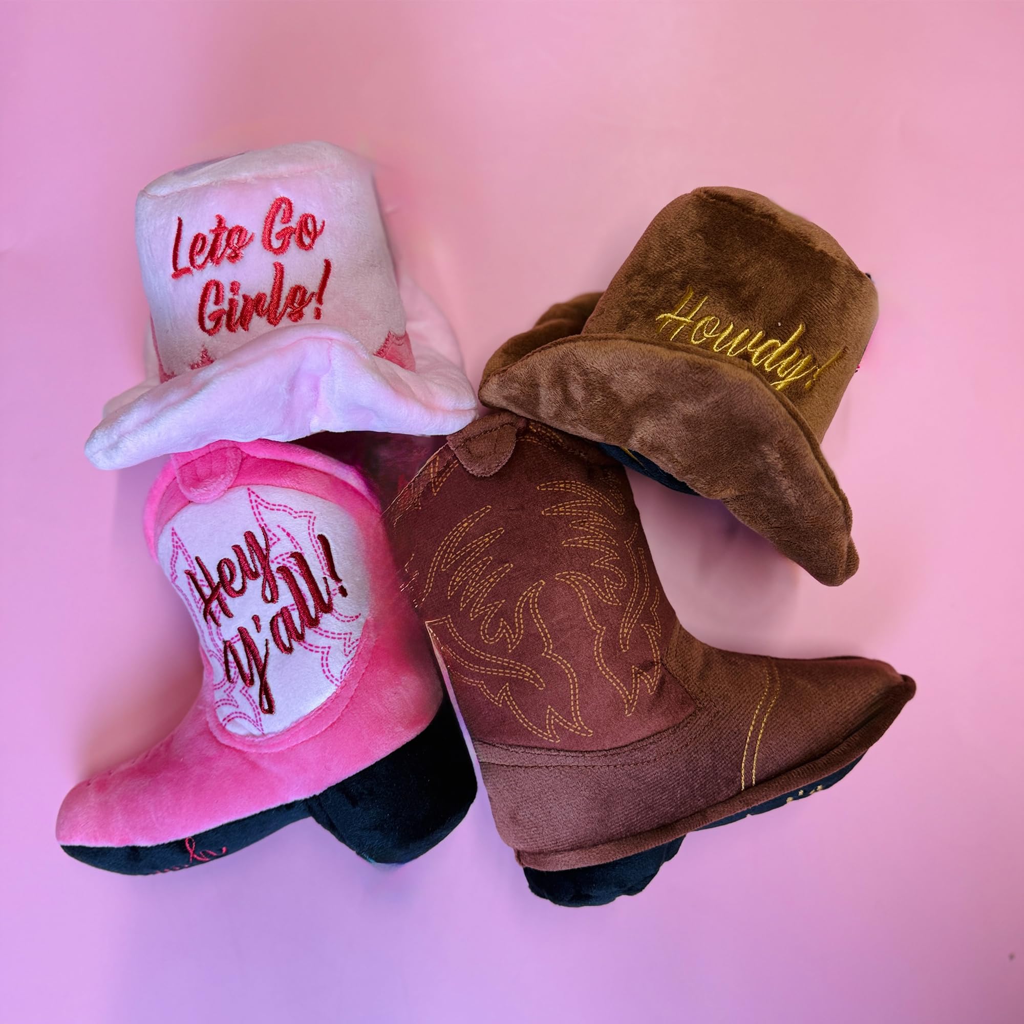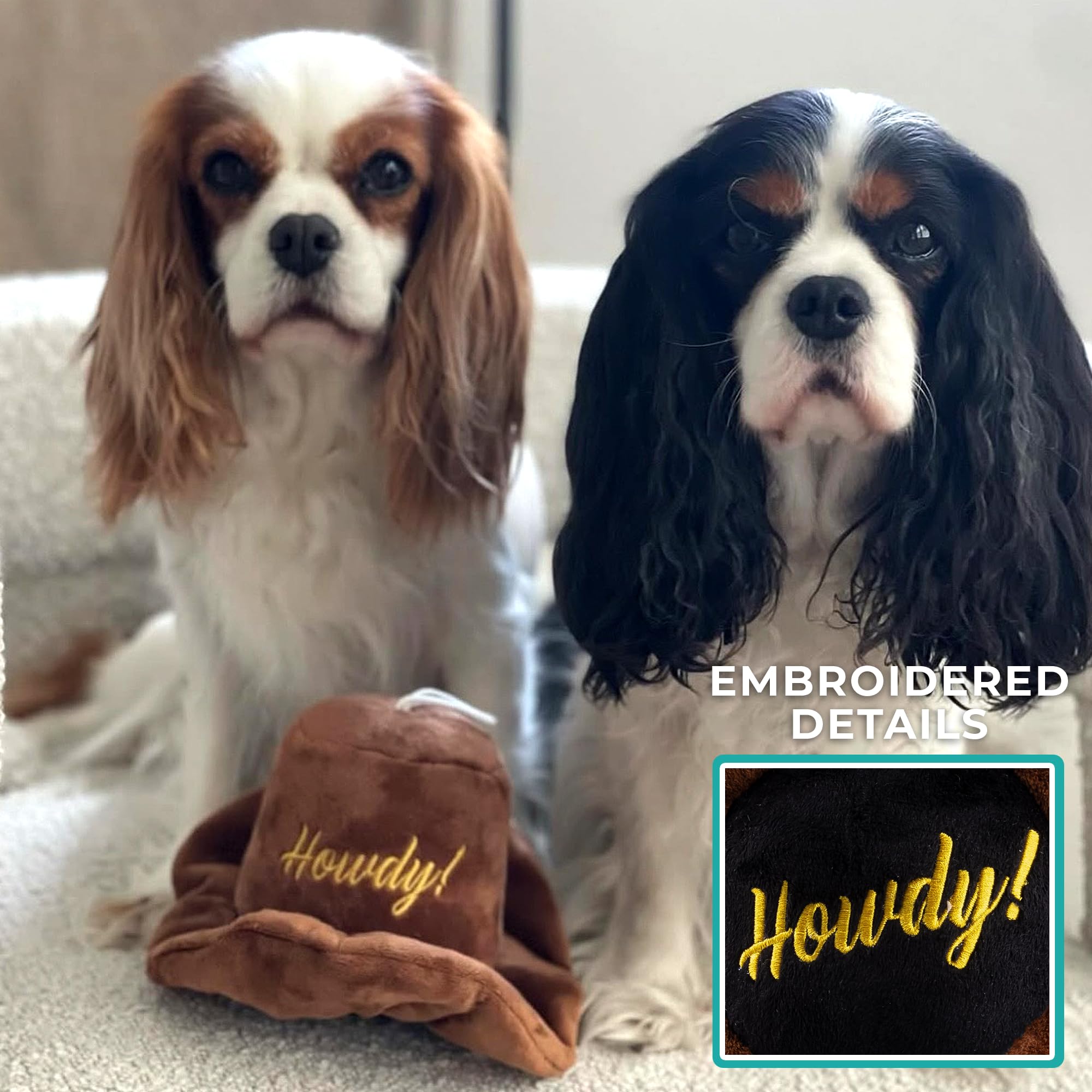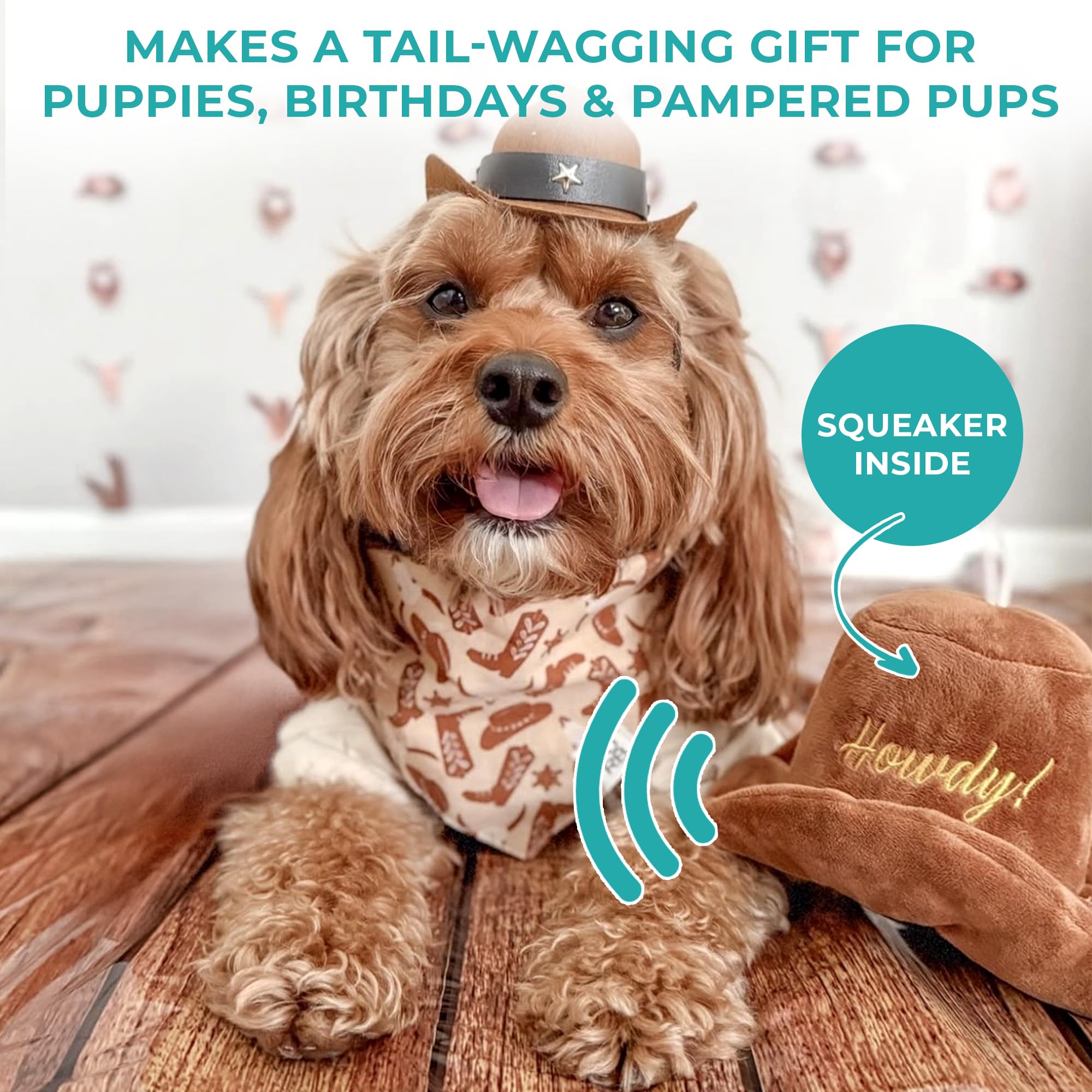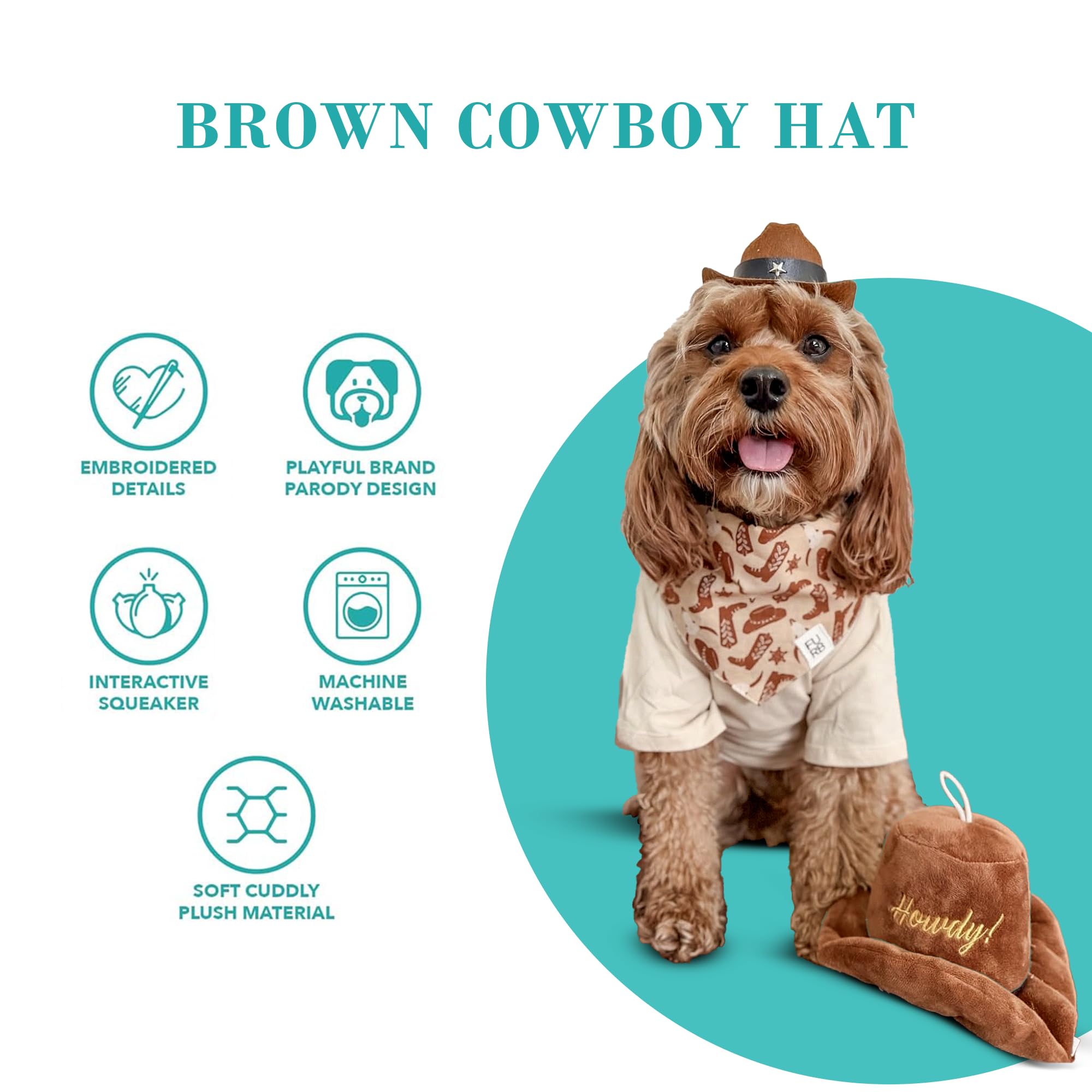Funny Plush Dog Toy: Let your pup play cowboy with this plush brown hat! Embroidered with “Howdy”, this soft dog toy features detailed stitching and a hidden squeaker for chewing, fetching, and squeaky fun. Size: 4" x 7" x 4".