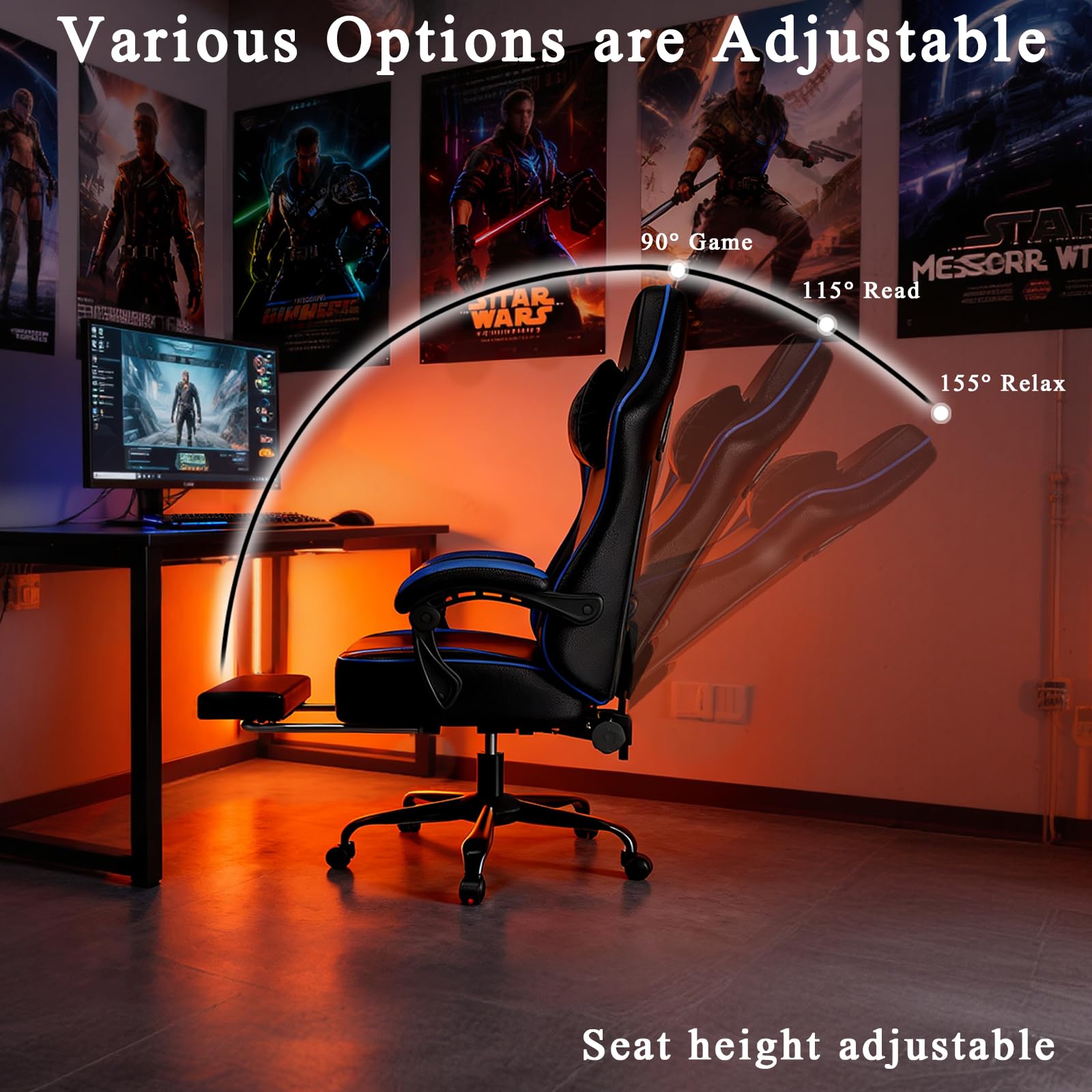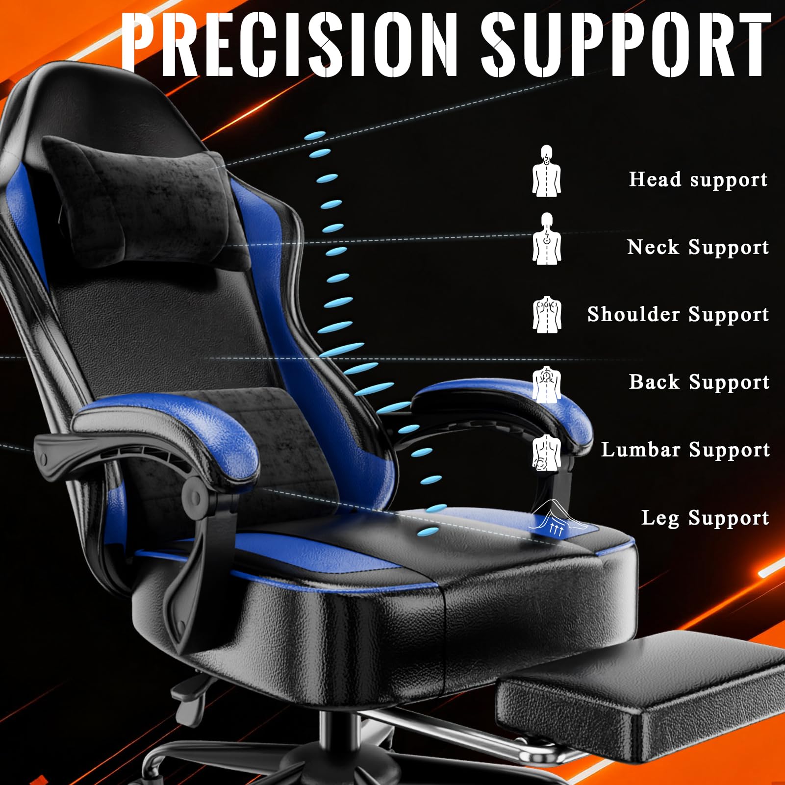 Full-Body Ergonomic Support: The computer gaming chair reclines from 90° to 155°, and with the telescoping hidden footrest, you can switch between focusing on your work and zero-gravity relaxation. Adjustable head & lumbar pillows and body-hugging backrest care for your spine and eliminate your back fatigue, while the adjusting linkage armrests sync with your posture, no more hunching during long emails.