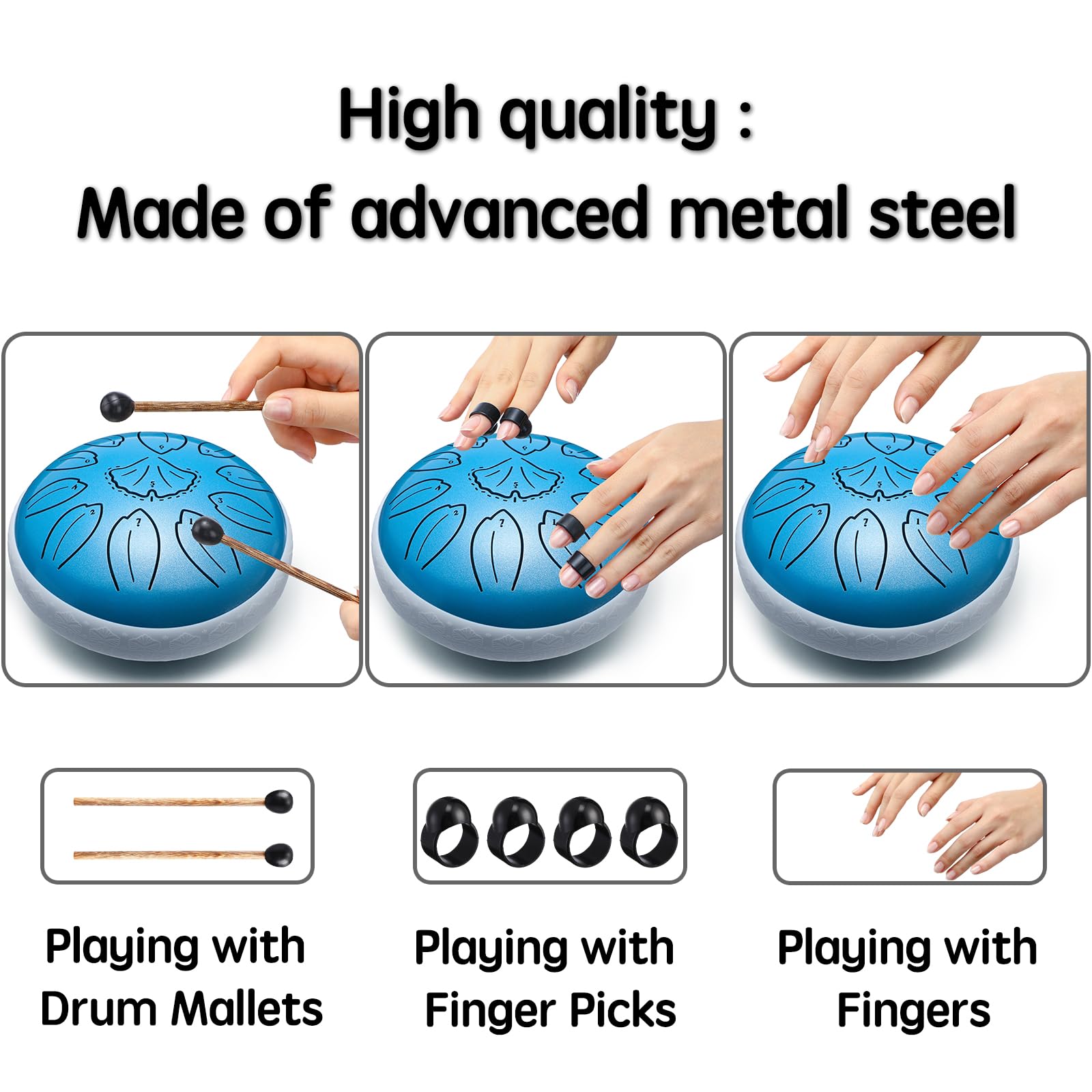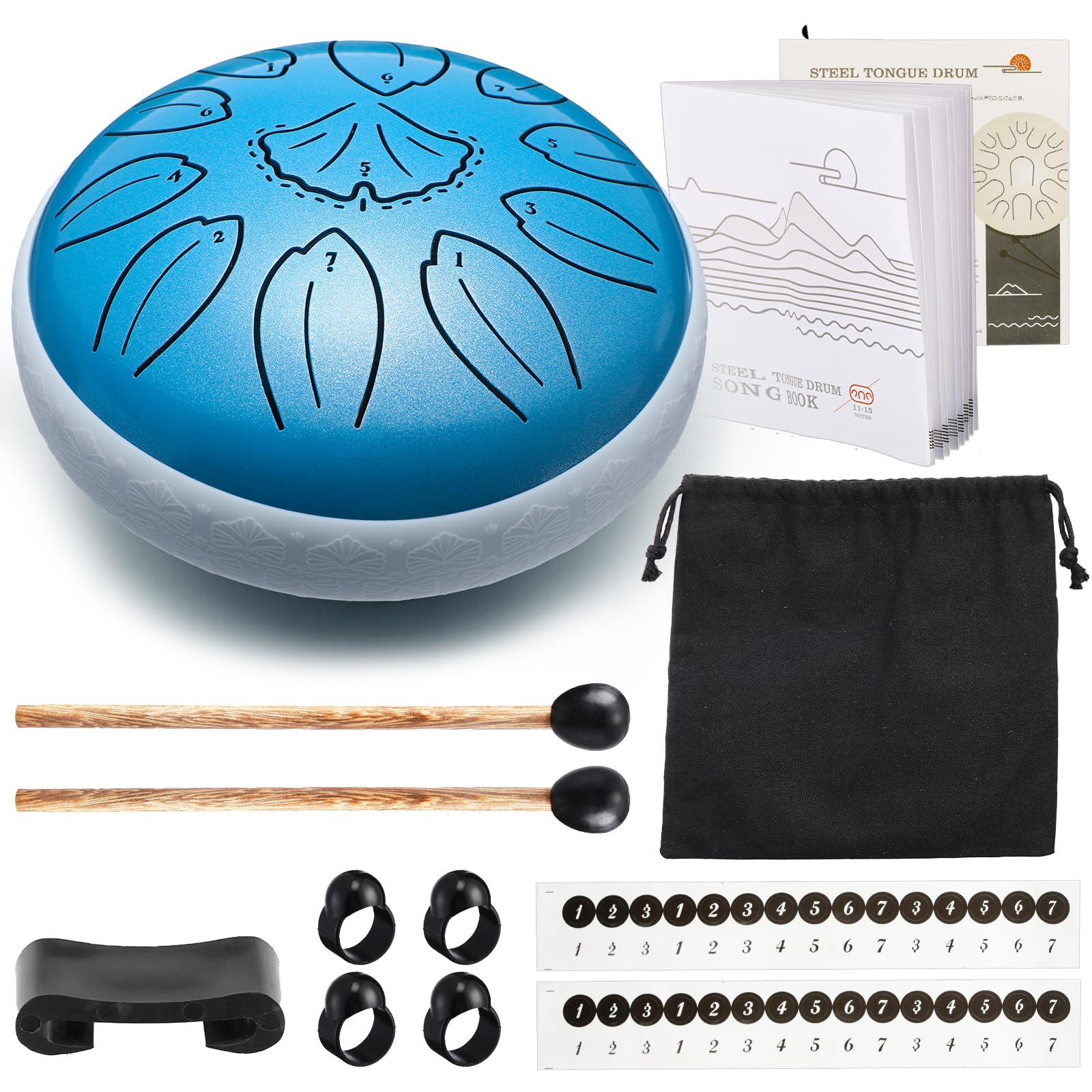 π Accessories Upgrade: 6 inch steel drum, drum mallets, drum bag, finger plectrums, spare note stickers, sheet music, mallets stand. Steel drum are a total of 11 tones, which have a wider range of sound and can play more music. You can play steel drum with the included drum mallets or with you hands, and the included note enable beginners to learn and play it more easily. Steel drum comes with a carry-on bag for easy carryinag