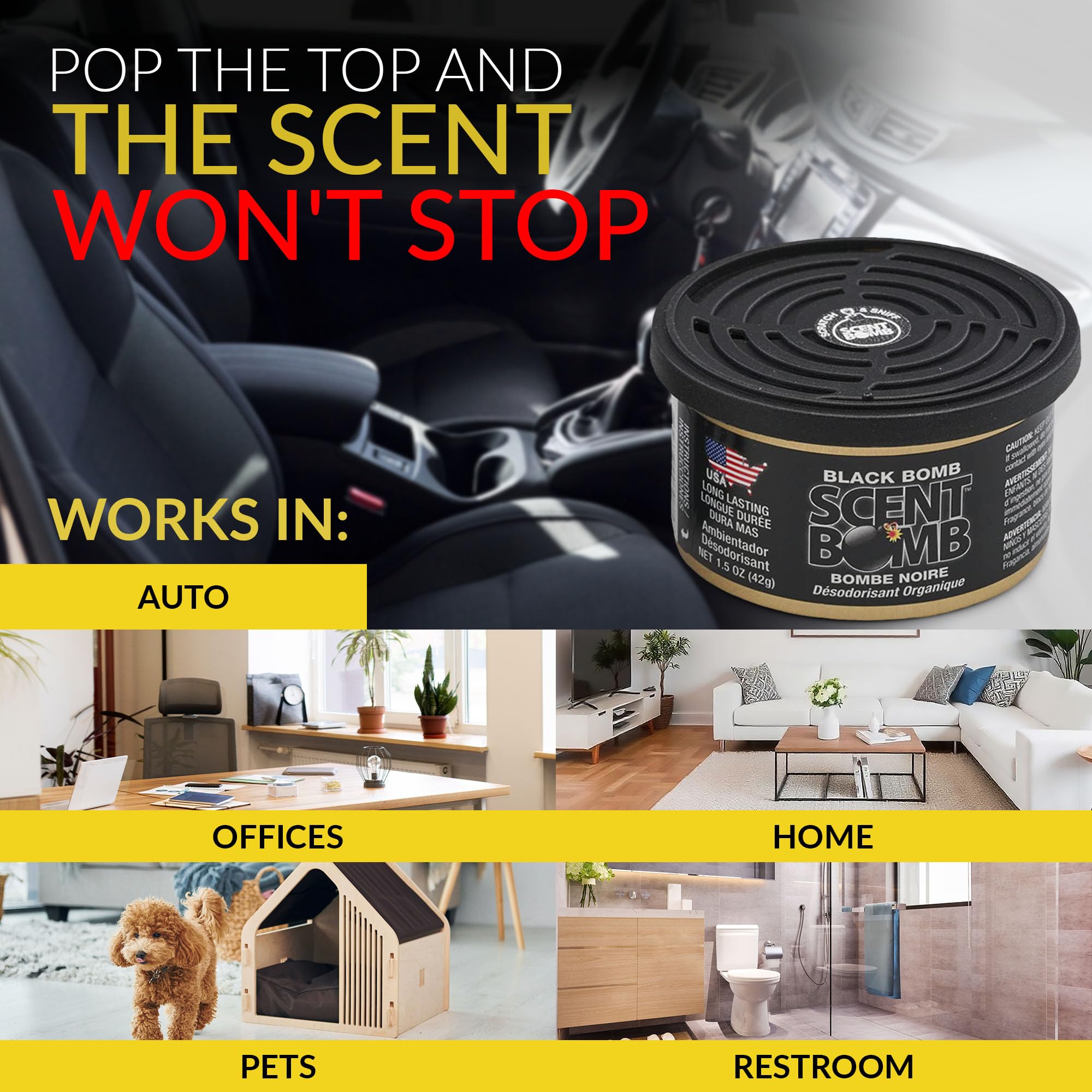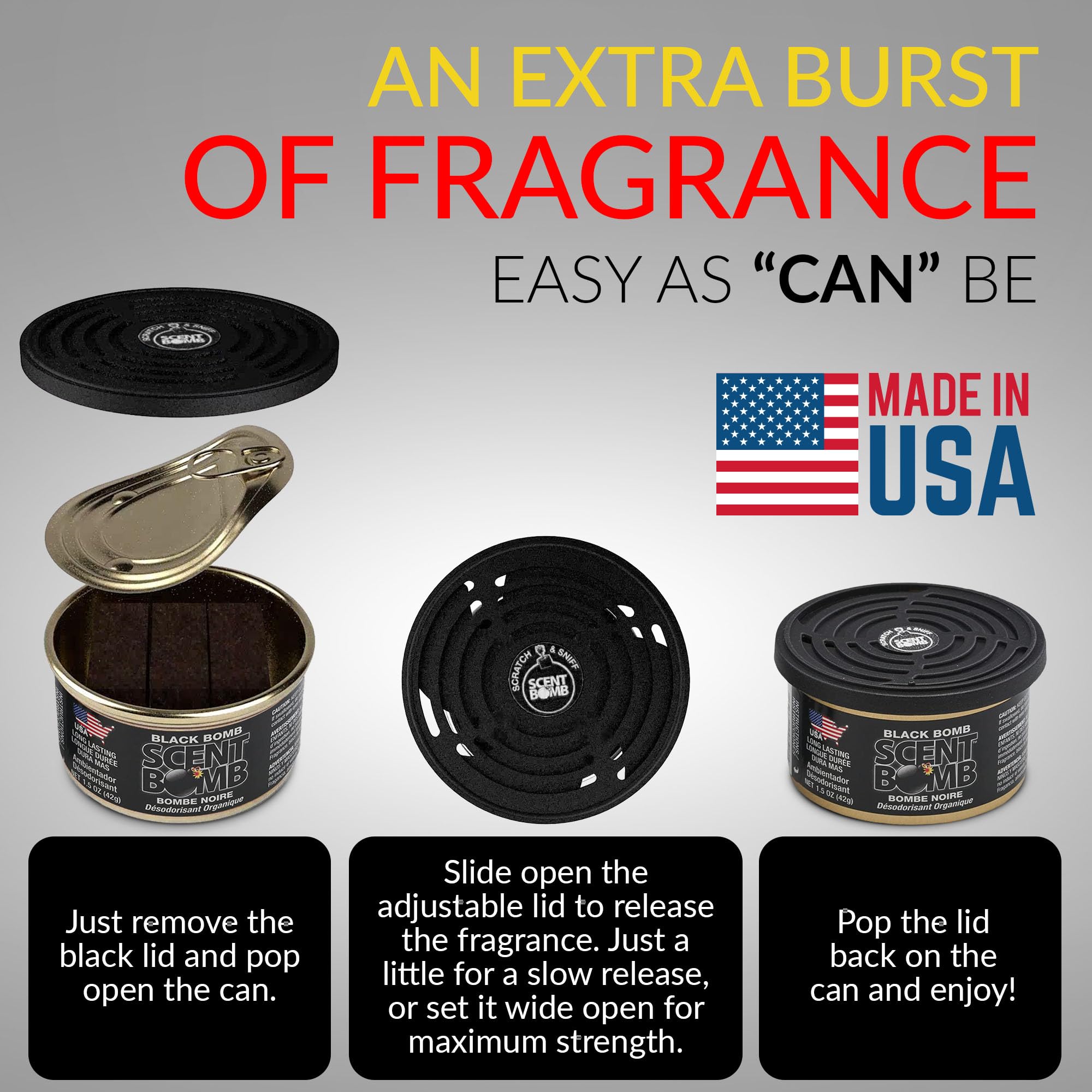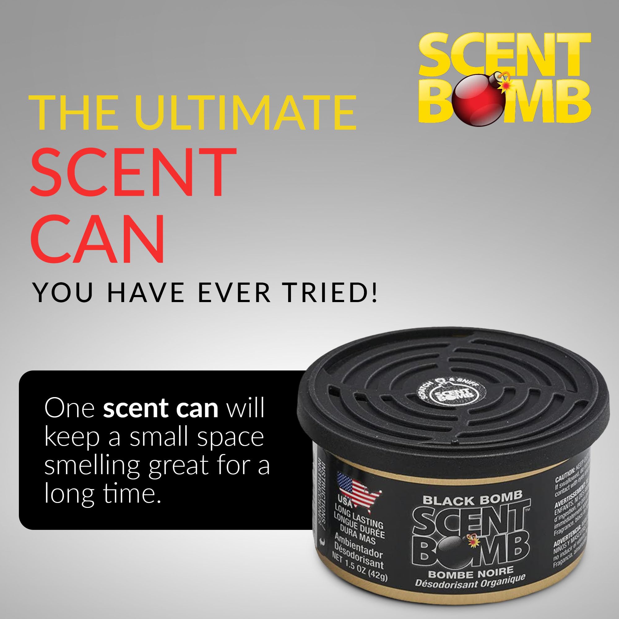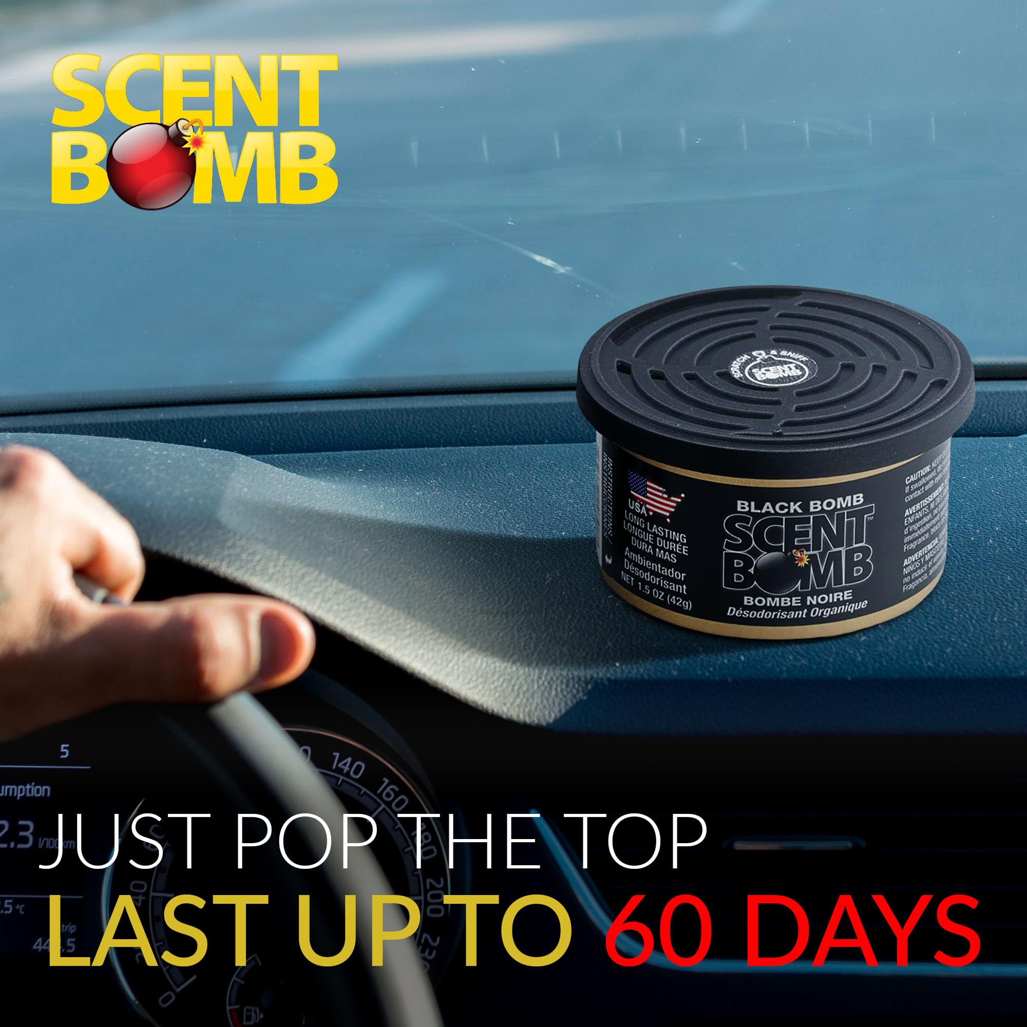 LONG-LASTING ORGANIC FRESHNESS: Each Scent Bomb Organic Can delivers powerful, long-lasting fragrance to eliminate odors, using organic, non-toxic ingredients. Perfect for cars, homes, offices, and more, for continuous freshness wherever you go.