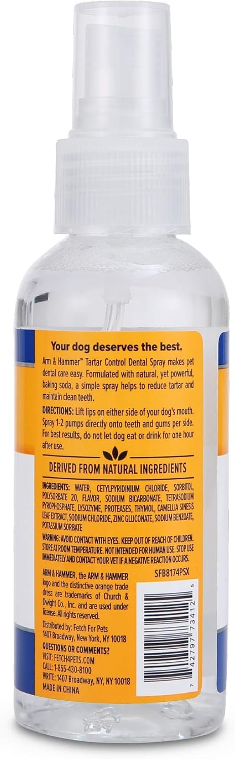Arm & Hammer Tartar Control Dental Spray for Dogs is a brushless oral care spray designed to help freshen breath and support daily teeth cleaning. The mint flavor and fine mist pump make it easy to apply directly to teeth and gums at home. Made for dogs that resist tooth brushing, this 4 oz dental spray uses a baking soda based formula to help reduce plaque and tartar buildup from everyday eating. It is intended to complement brushing, dental chews, and routine veterinary dental care, not replace it. Use as directed for adult dogs and puppies. To use, lift your dogs lips and apply 1 to 2 sprays per side onto teeth and gums, then allow contact time before offering food or water. Use daily between baths, walks, or meals as needed. Avoid eyes and broken skin; discontinue if irritation occurs.