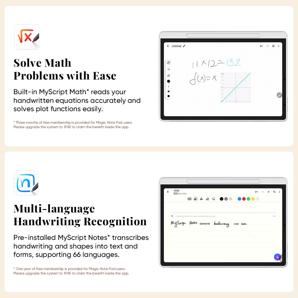 System Update: Please upgrade the system to 1PAE to claim the benefit of pre-installed MyScript Notes and MyScript Math. The pre-installed MyScript Notes * converts your handwriting and shapes into typed text and precise form, supporting 66 languages recognition with generative AI to boost learning efficiency. MyScript Math will help you write and solve math with your pen, plot functions, use variables, and edit with a simple scratch-out. It will recognize your handwritten equations accurately for reliable results and easy edits