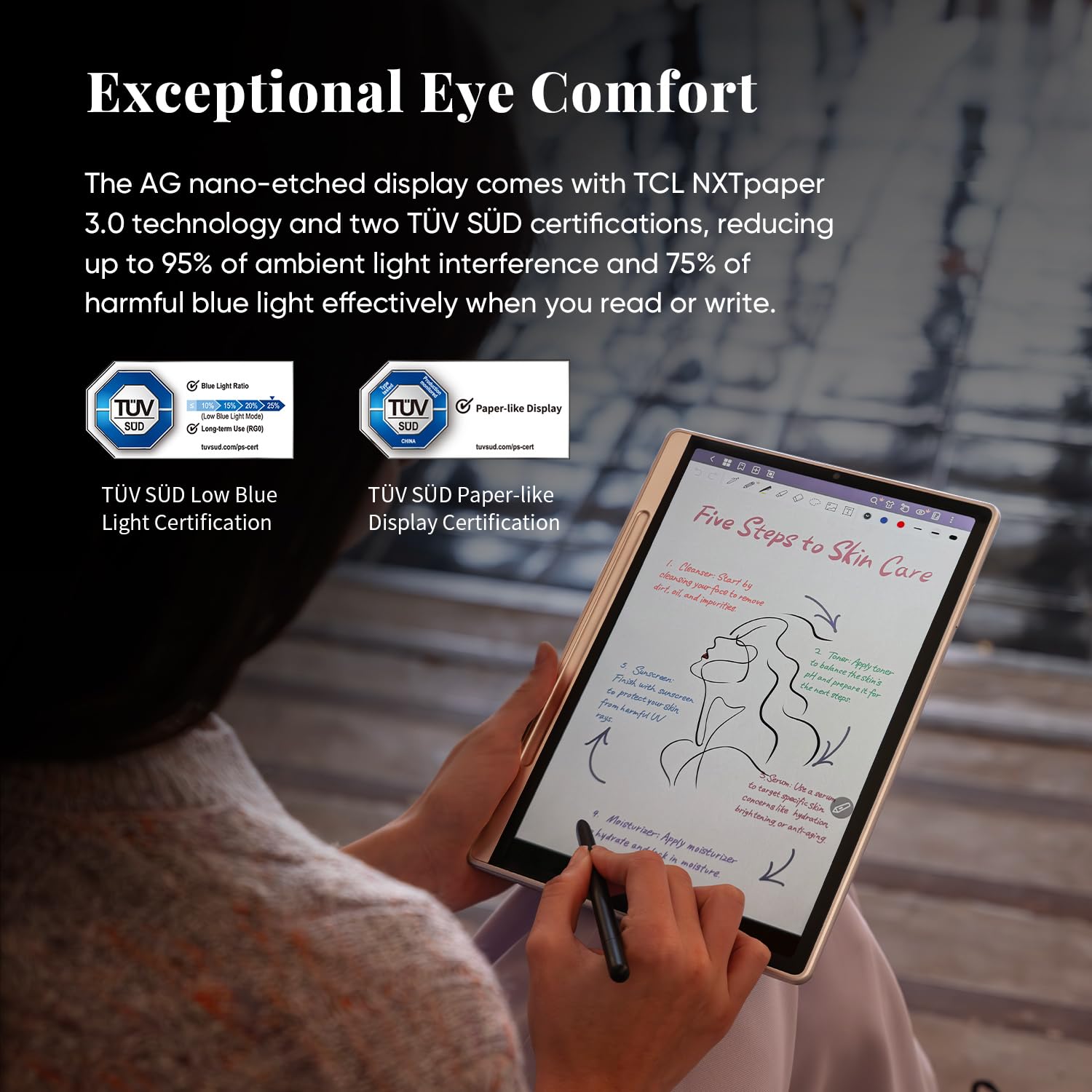 AG Nano-Etched Display: This 10.95-inch tablet features an AG nano-etched LCD screen equipped with TCL NXTpaper 3.0 technology, which reduces up to 95% of ambient light interference and delivers a Immersive visual experience. Please note: Since our product achieves paper-like texture and anti-glare functionality through AG etched glass technology, it differs fundamentally from E Ink screens in visual appearance