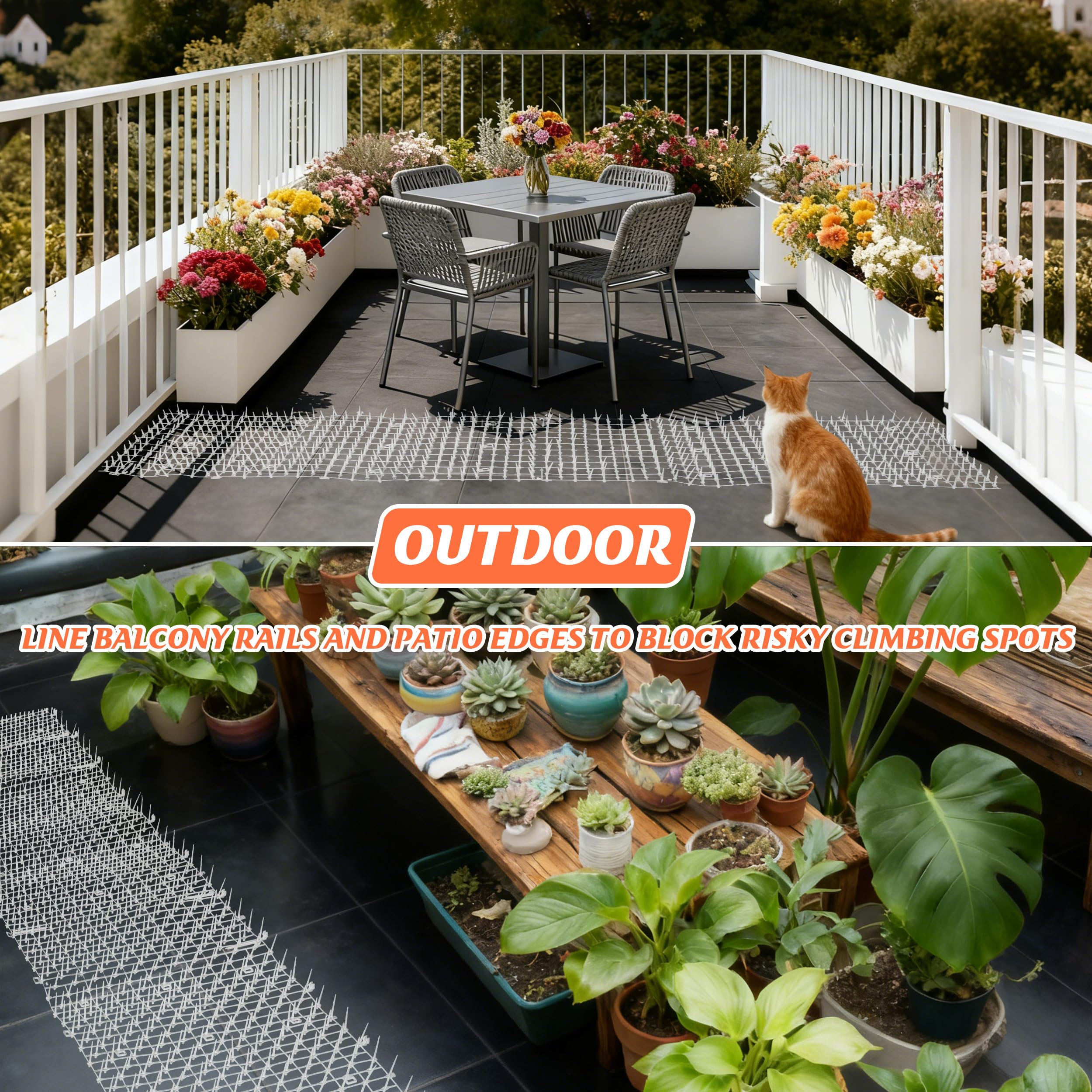 【Cuttable & Flexible for Any Edge】 – Easily cut the clear cat spike mat with scissors and curve or wrap it around balcony railings, fences, countertops and garden borders. One 6.5ft strip can be split to cover several smaller spots or used as a single runner to guard a long edge.