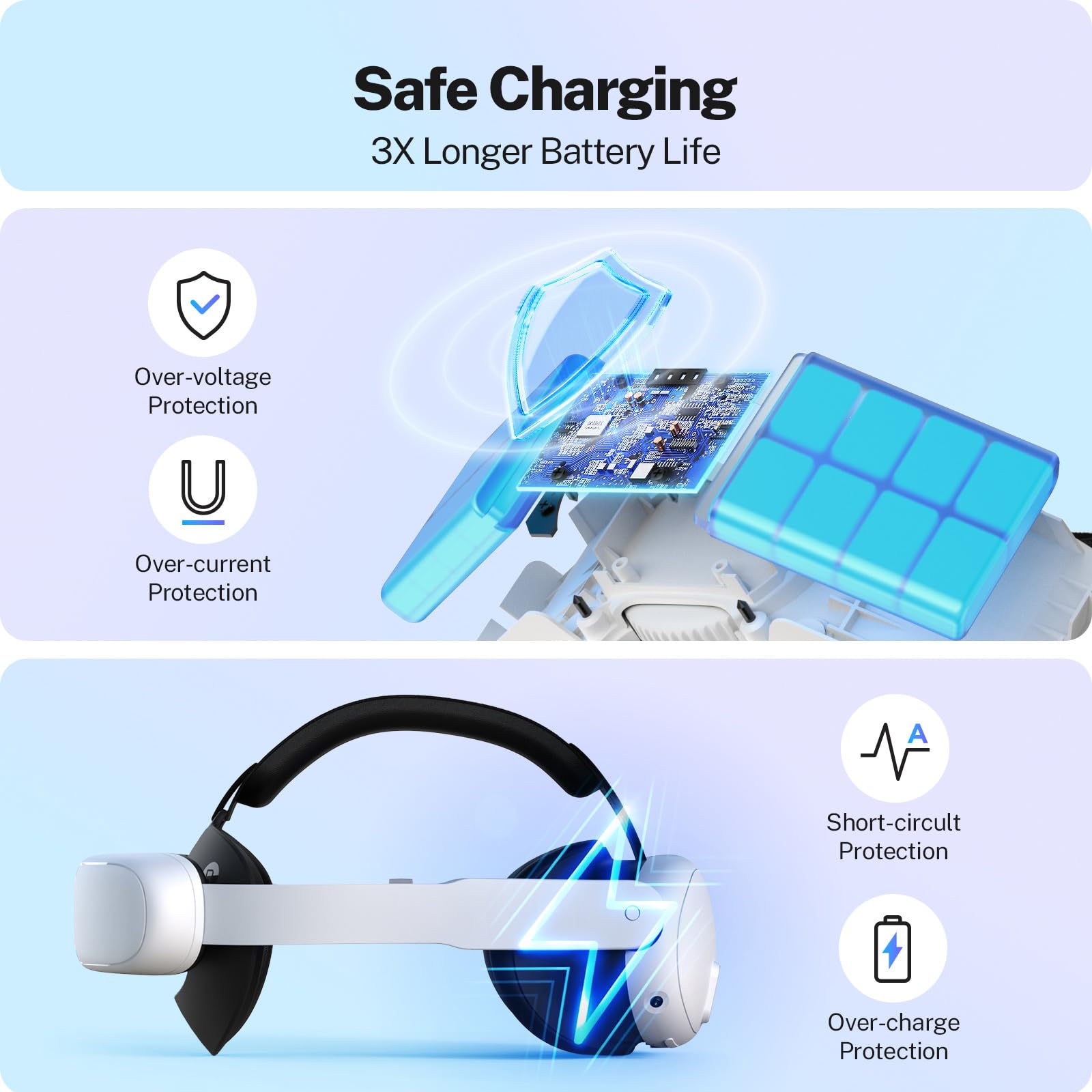 Extend VR Game Time: The 10000mAh battery elite strap adopts a plug-and-play design, allowing you to charge your Quest 3S & Quest 3 headset directly by turning on the battery switch while immersed in the VR world. This extends the headset's battery life by approximately 4-6 hours.