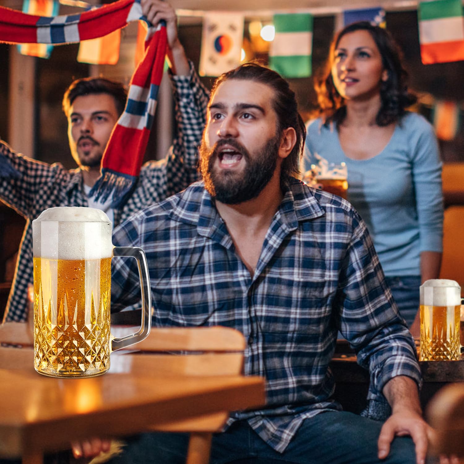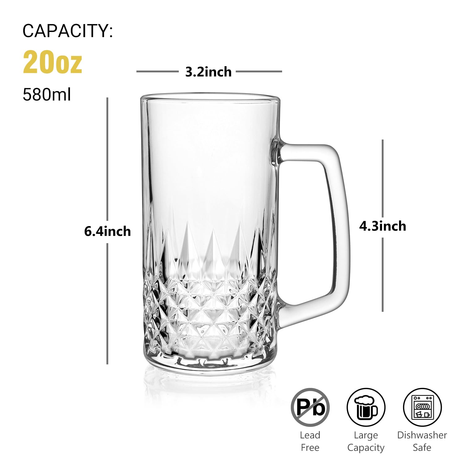 Sturdy Design: Our handle design of the 20oz beer glasses is easy to pick up and put down, not heavy with beer full inside. These beer glases with handle feature an ornate body with delicate patterned glass cuts, making it a perfect choice for entertaining.
