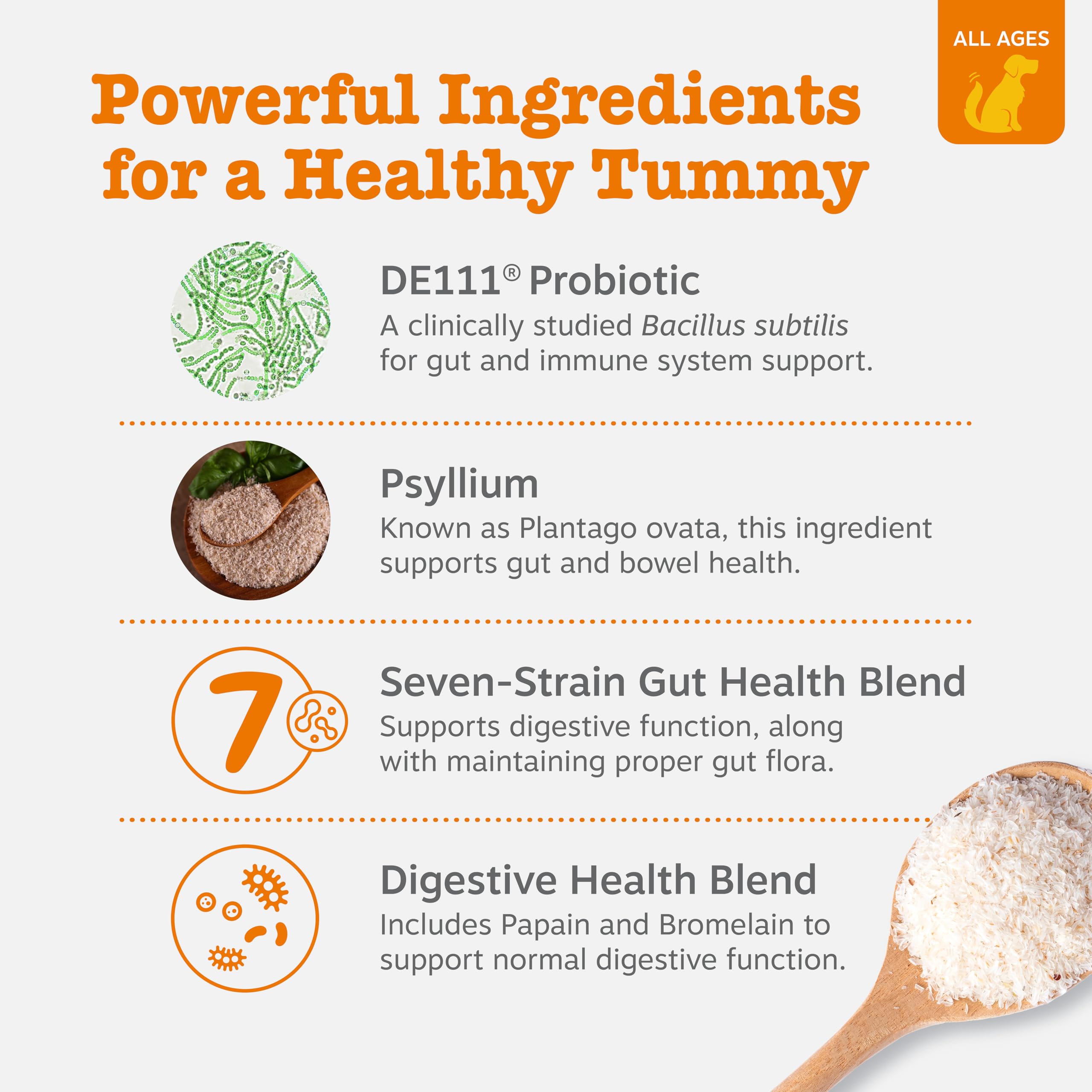 Featuring DE111 Probiotic - These powerful pet supplements include DE111, a premium Bacillus subtilis probiotic that has been clinically studied for supporting gut health and immune system function.