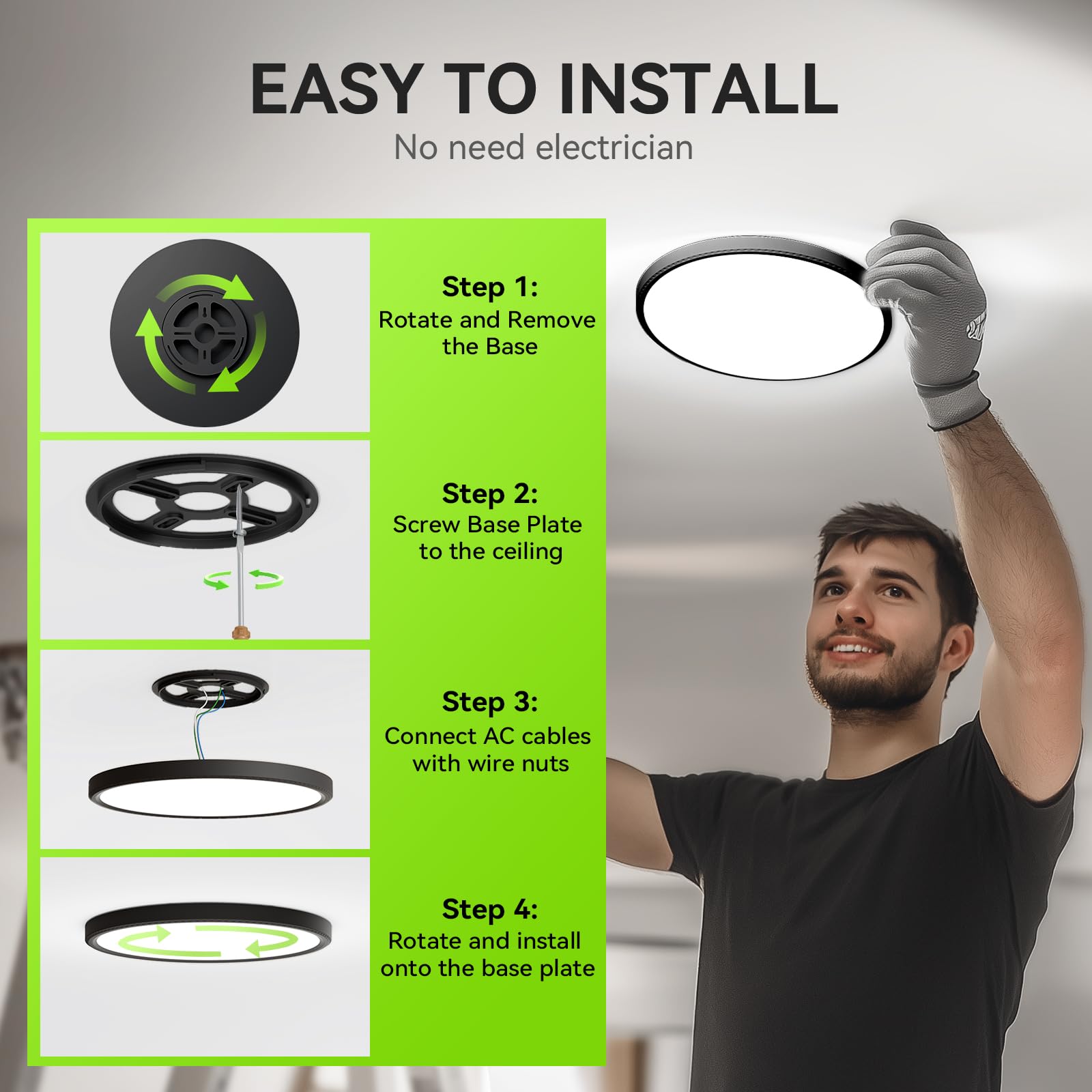 【Easy Installation】Only 2 steps to complete the installation, Mount the base under the ceiling, twist the ceiling lamp into the base then you have finished the installation. We also provide customers all installation accessories: 16 pcs Nuts, 16 pcs Anchorings and 32 pcs mounting screws