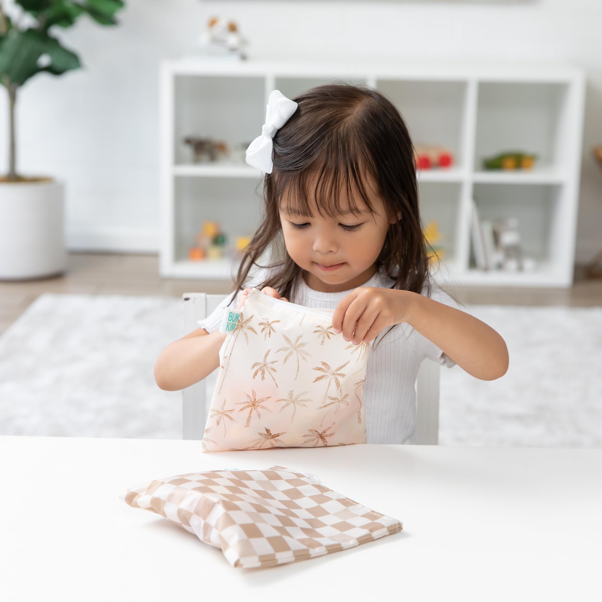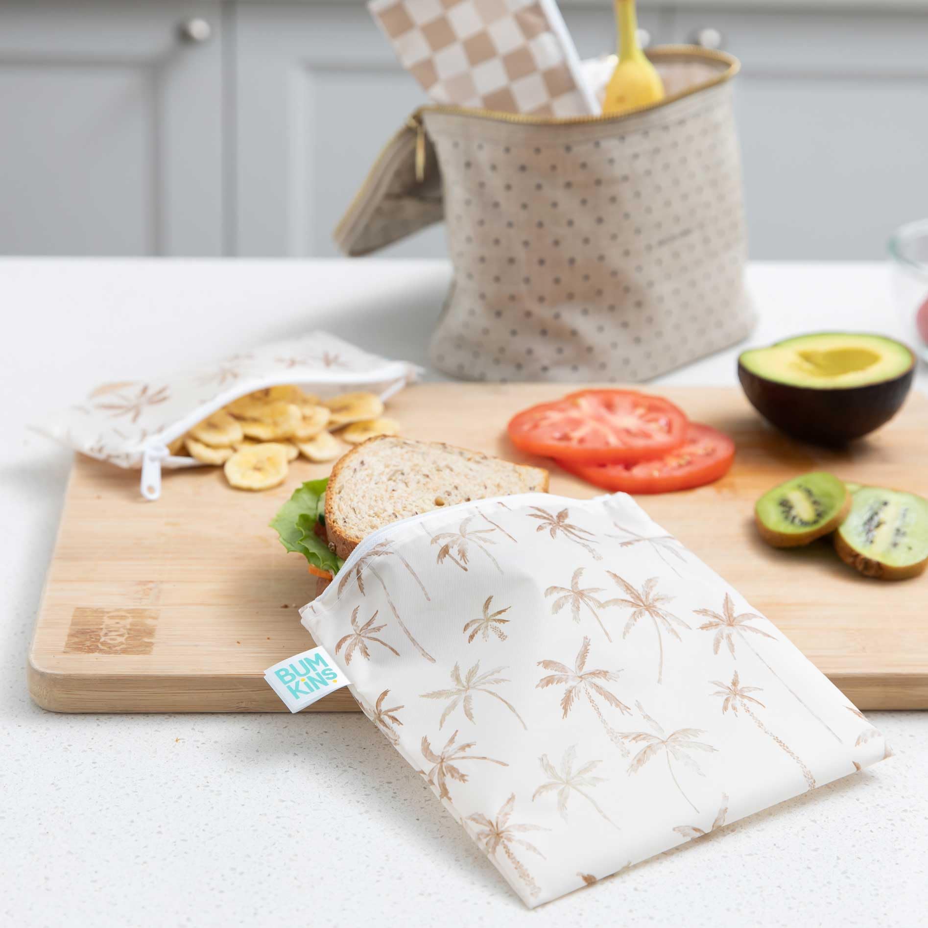 Our reusable sandwich and snack bags are made from Bumkins’ original easy-wipe waterproof fabric. Reusable cloth bags help reduce waste from plastic bags and takeout containers. By packing lunches and snacks, you can stay on budget, ensure foods are allergy-free and adhere to dietary restrictions, plan healthier options. Use as organizers for storage and travel! Stash inside a lunch bag, purse, diaper bag, or suitcase. A long-lasting zipper closure keeps in crumbs, and the single-ply fabric means no worrying about icky stuff growing between layers of extra material. Made from Bumkins’ original fabric that’s 100-percent polyester with embedded TPU for water resistance. Machine or hand wash. Measures approximately 7in x 7in (17.78 cm x 17.78 cm), large enough to fit a sandwich or bagel. We use third party labs to ensure the products we manufacture comply with CPSC and CPSIA standards for BPA, Lead, and Phthalates. Tested for Small Parts according to 16 CFR 1500.50 – Results: No small parts. For over 30 years, Bumkins has been creating thoughtful and responsibly made essentials, making parenting easier so families can cherish those special moments. Designed in Arizona, responsibly made in China.