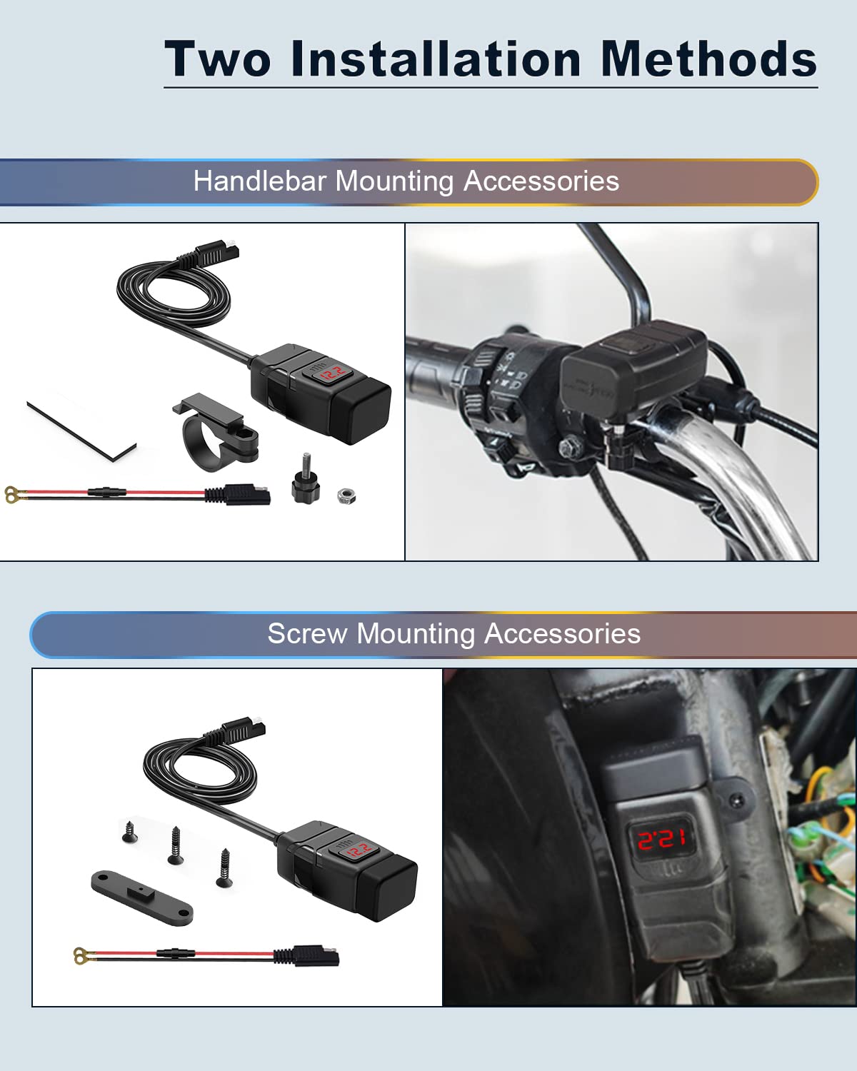 Wide Compatibility - The motorcycle accessories Input Voltage is (12V-24V). According to your devices, it can automatically adjust the voltage output (5V/3.4A, 9V/2.5A, 12V/2A), It's fully compatible with all the USB interface electronic products.