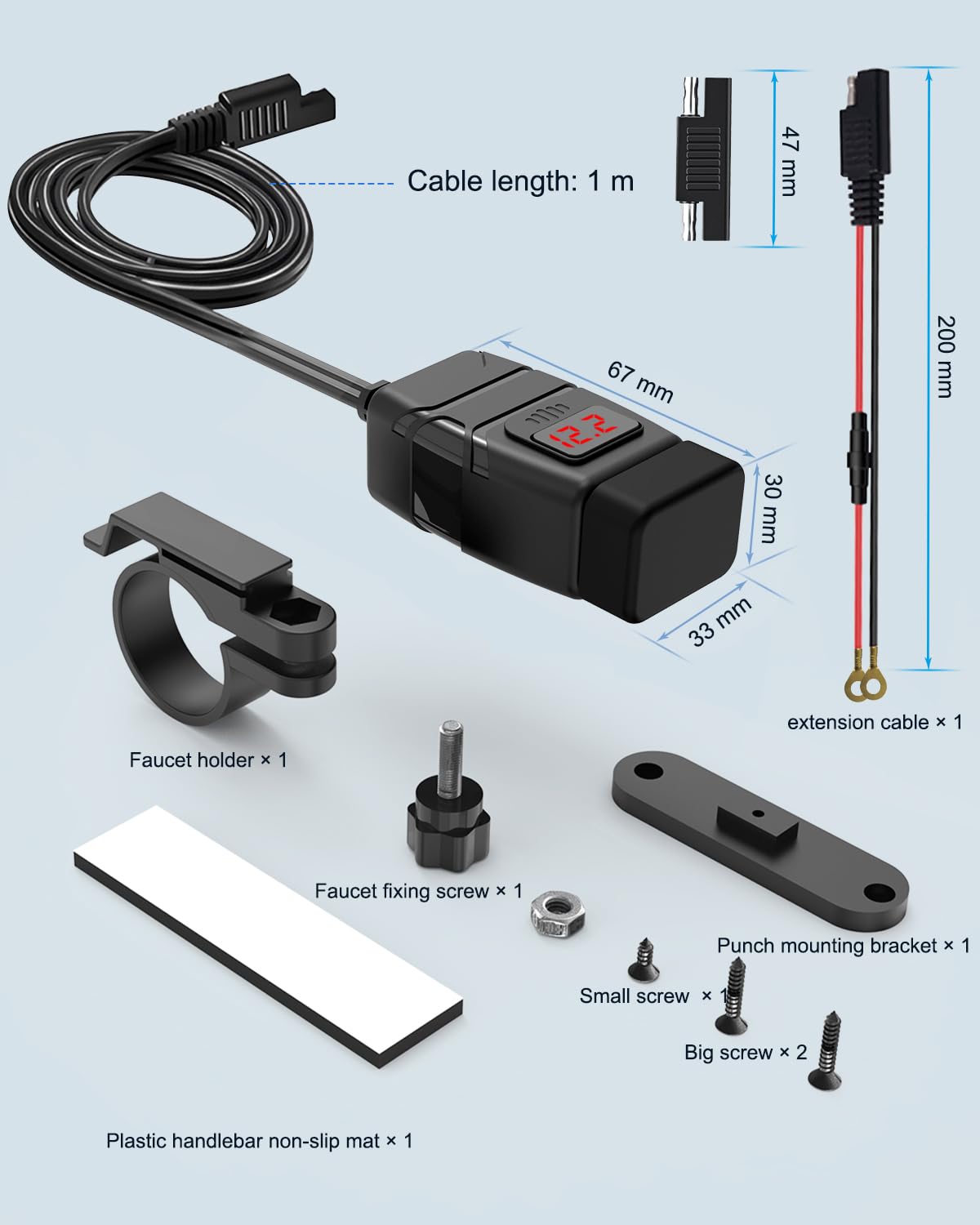 LED Voltmeter & ON/OFF Switch - The motorcycle charger features an on/off switch and battery voltage status display, so you will know the battery's health while driving. Monitories the battery and electrical system automatically and indicate the voltage on the screen, to avoid power consumption, easy to use. (TIPS: Please replace the battery as soon as possible if the voltage is lower than 12V)