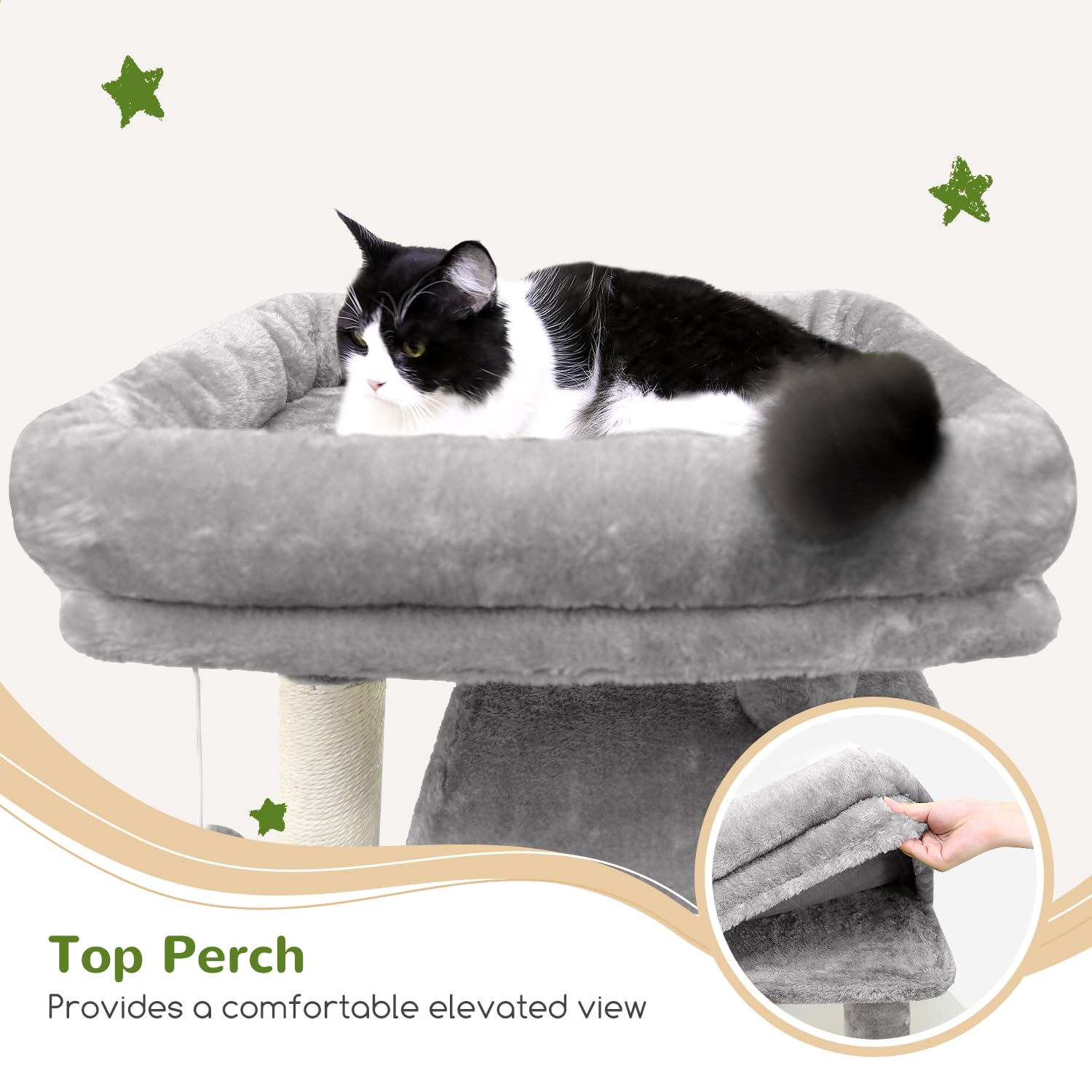 ENLARGED REMOVABLE TOP PERCH - Up to 70 inches tall cat tree includes the enlarged top platform is detachable for easy cleaning and maintenance. Offers a spacious resting and observation area for cats