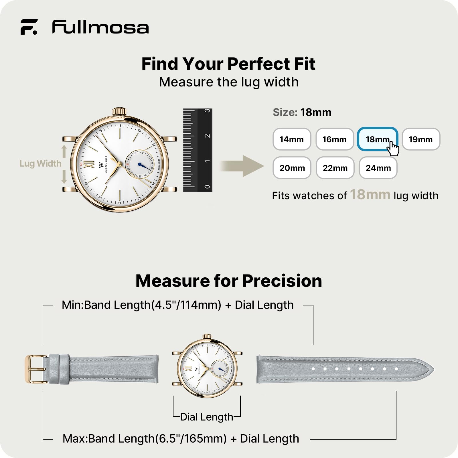 [Adjustable and Perfect Fit] These 18mm watch bands suit 18mm watches only and are not compatible with 17/19mm. Before you order, measure the breadth of your watch lugs. Please see the image below for the measurement and equivalent width of the smart watch, or contact us directly. The 18mm bands fit wrist (4.5"+dial length)--(6.5"+dial length). They also have 10 precisely cut eyelets.