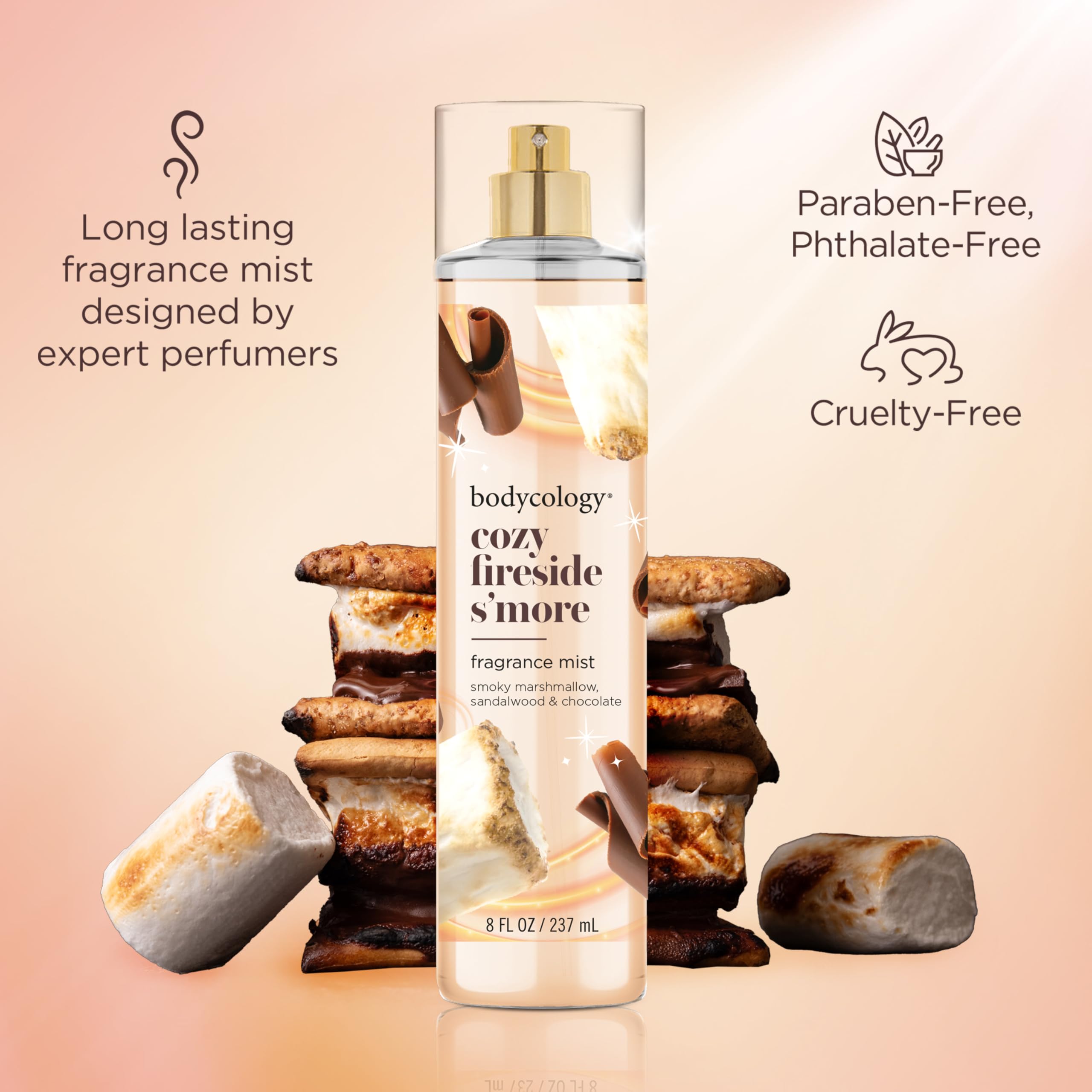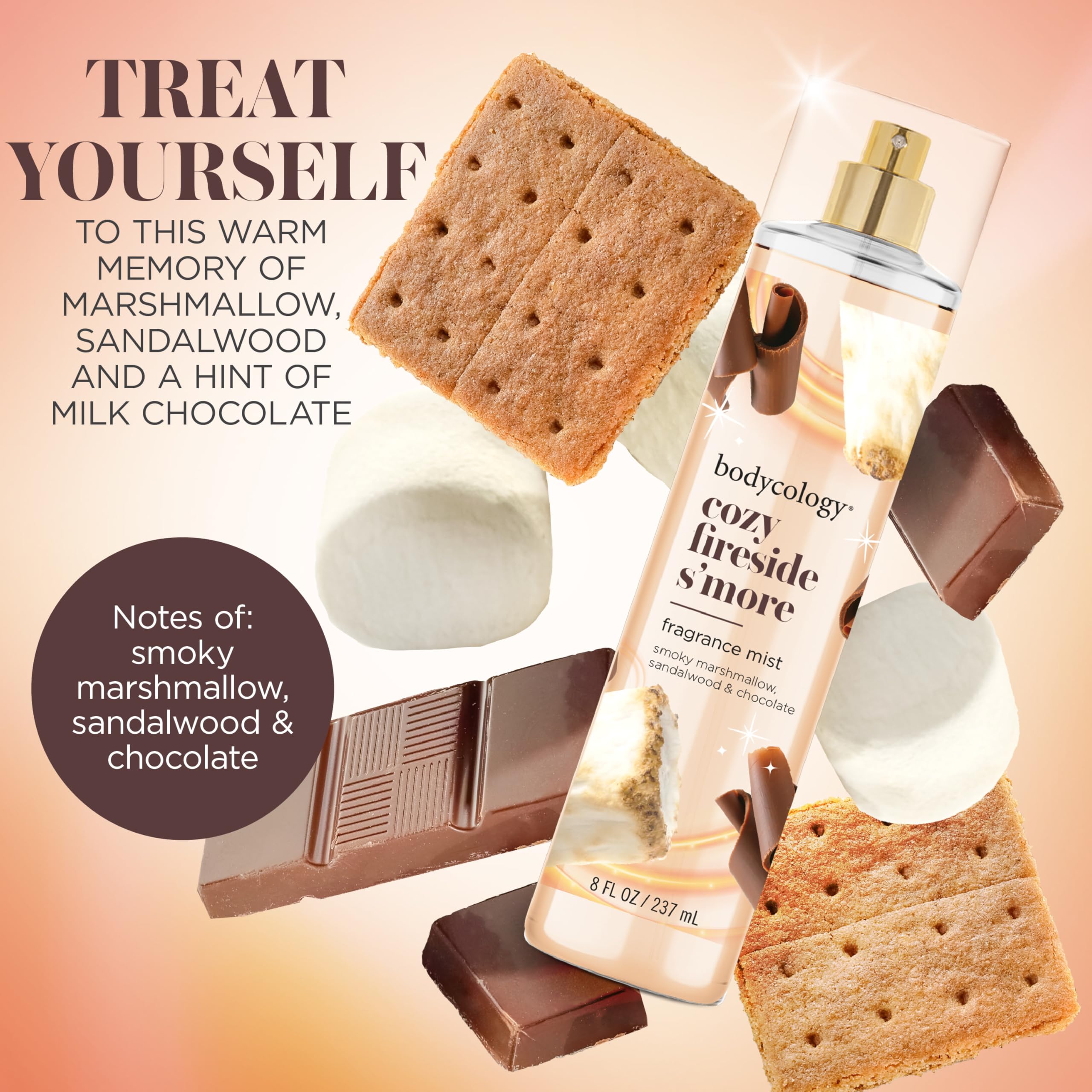 Return to the warm memory of a fireside s'more with the aroma of marshmallow, sandalwood and a hint of milk chocolate with Bodycology's Fireside S'more Fragrance Body Mist, 8fl oz. For a splash of fragrance, spritz body mist lightly on wrists, neck and shoulders ΜΆ or for all-over freshness, spray in to the air and let the fine mist gently surround you. Bodycology offers a wide selection of bath & body products in beautiful scents suitable for everyday or special occasions. Mix and match with our other fragrance mists to create a scent that is uniquely yours.