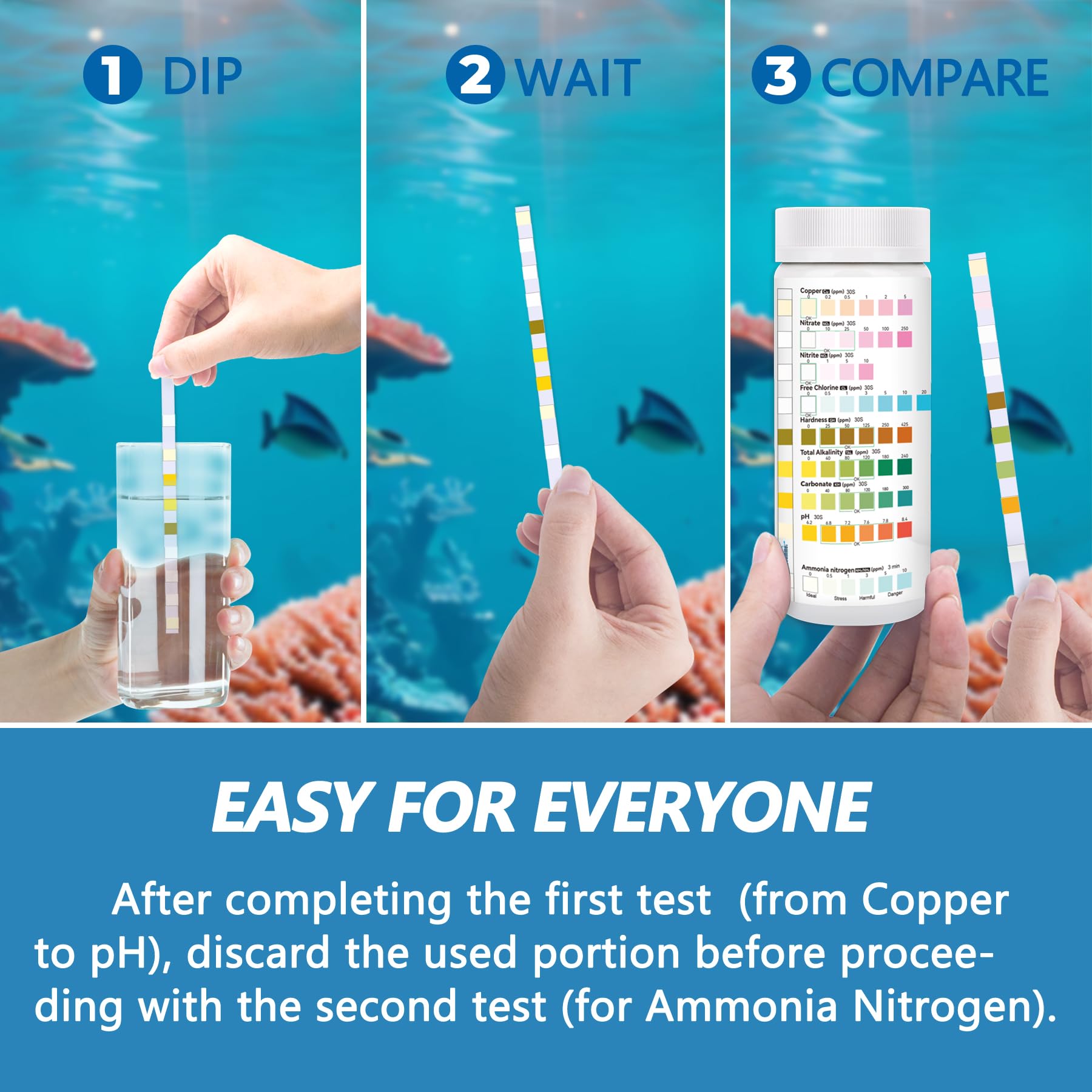 Easy-to-Use Fish Tank Water Testing Kit: The test is straightforward and easy, with just 3 simple steps: dip the strip into the water, hold it horizontally, and after the specified time, compare it to the color chart. Ammonia nitrogen requires a 3-minute wait, while the other tests only need 30 seconds. This user-friendly process ensures that anyone can easily perform the test.