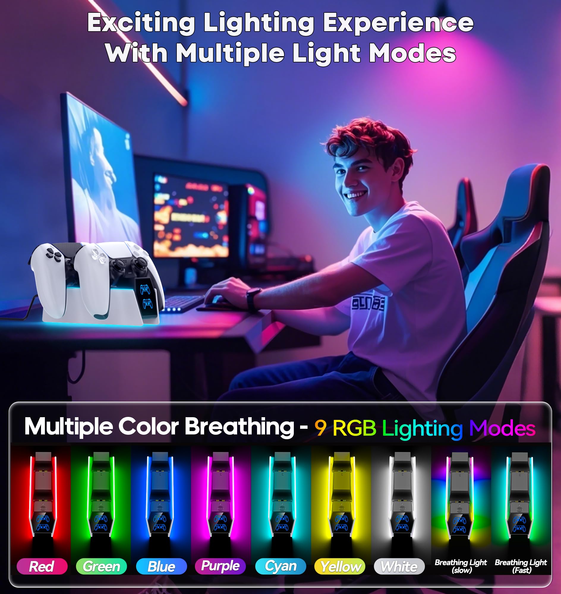 Effortless Charging:Simply place two PS5 controllers on the charger base and the PS5 remotes begin charging. A bright LED indicator will show the charging status. The PS5 Accessories Kits charging lights on the front unlike the official version, will be indicated with red and blue lights to show whether they are charging or fully charged. The unique LED strap on the screen will flash while in charging status. Additionally, the blue lighting on both sides combines to give a nice look with the PS5 controllers.